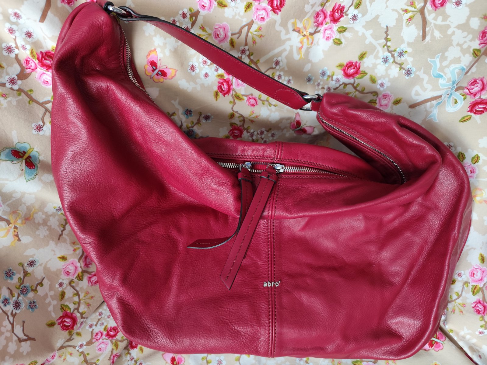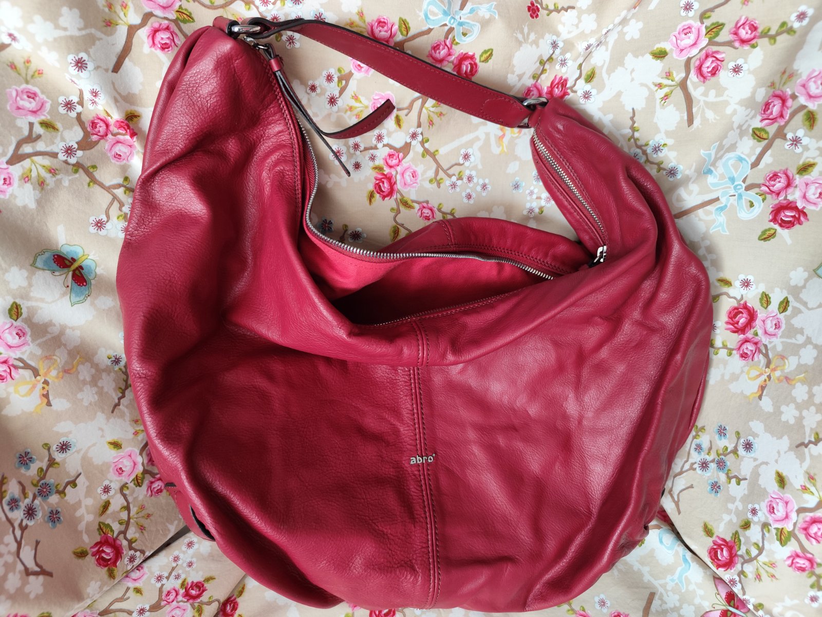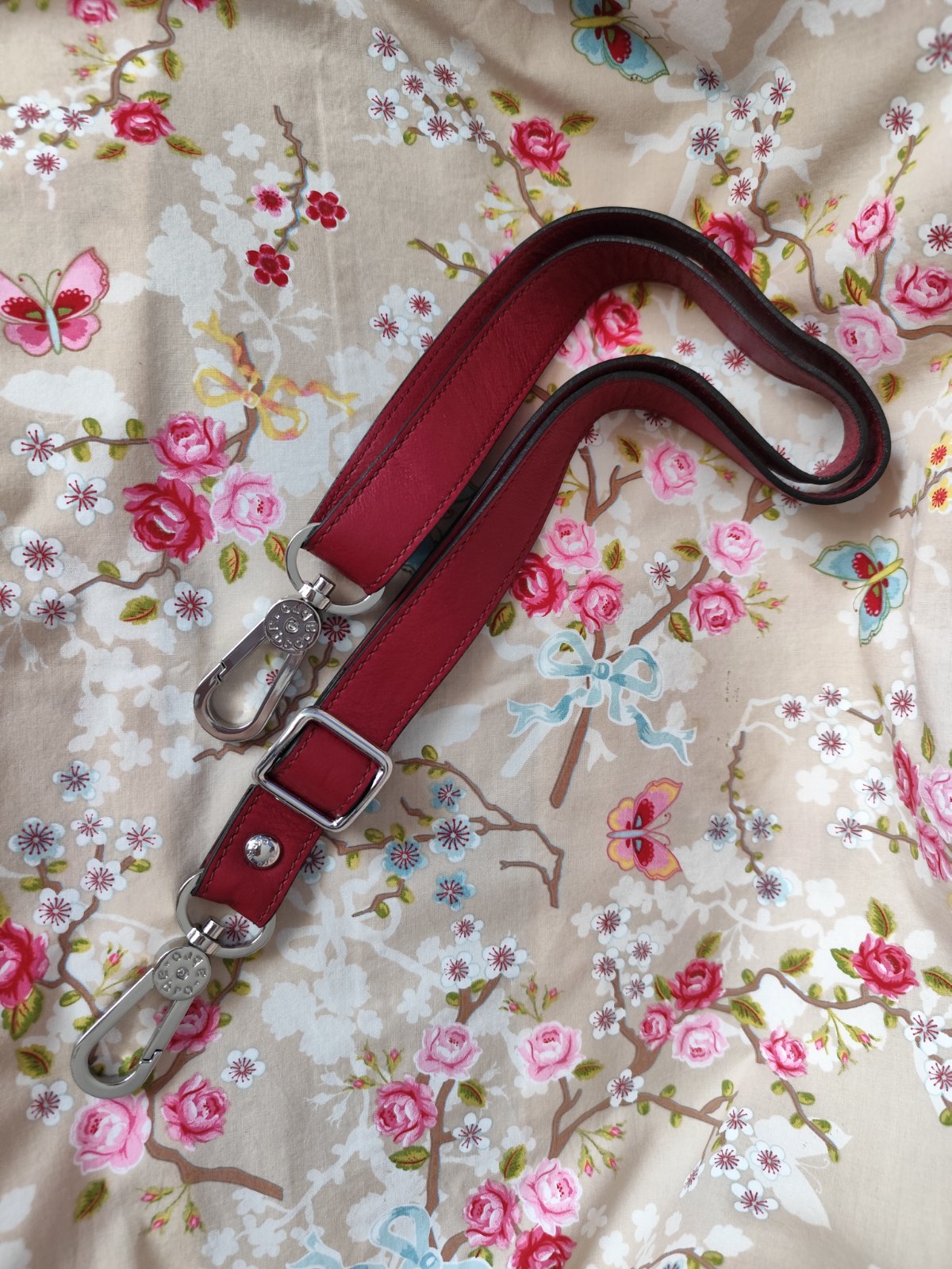 Nenosená kabelka, 100 % koža, farba tmavšia - ako na fotke popruhu. Vo vnútri červená bavlnená podšívka. Je k nej aj dlhší popruh. PC 200 Eur.