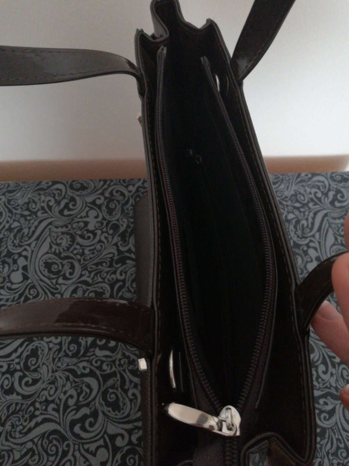 Raz vyvenčená kabelka, elegantná, ja nevynosím. Výška 31cm,s rúčkami 45cm,šírka 40cm.