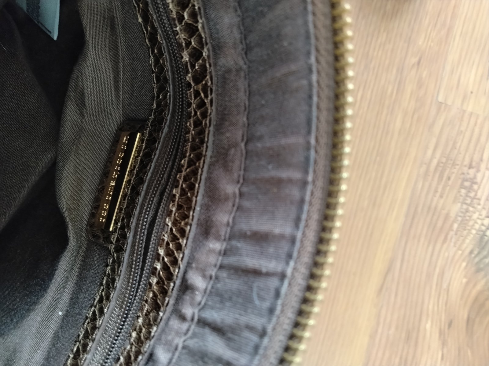 Čierna značková kabelka s nastaviteľným popruhom s krokodílym vzorom. Kabelka sa dá zmenšiť, viď zapínanie na fotke. Na zadnej strane okolo zipsu vidieť menšie opotrebenie.