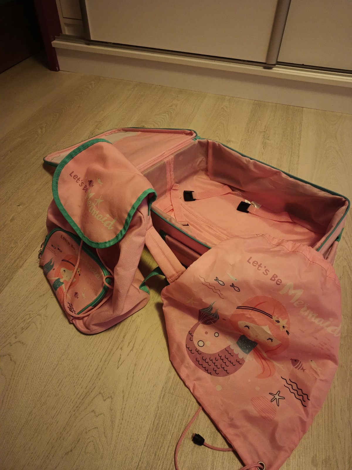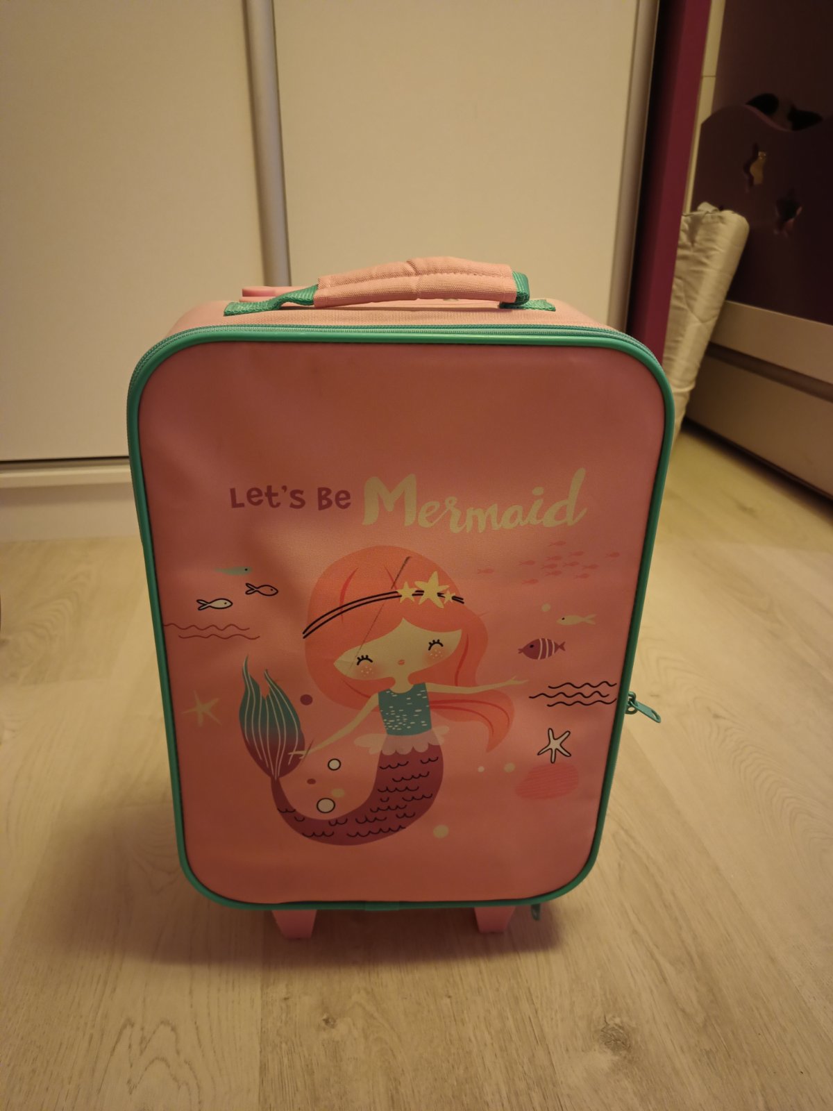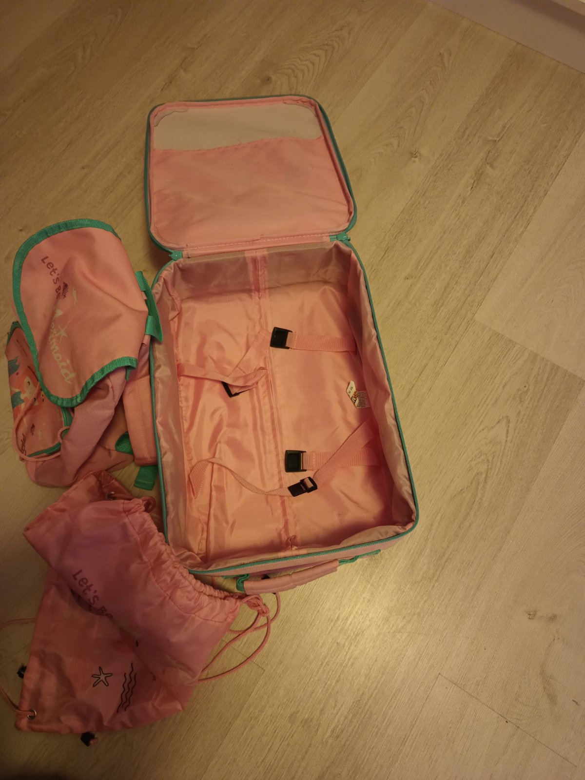 Krásny, ružový kufor na kolieskach s morskou vílou. Súčasťou je aj ruksak a ruksak na topánky. Cena 10 euro + poštovné.