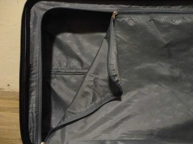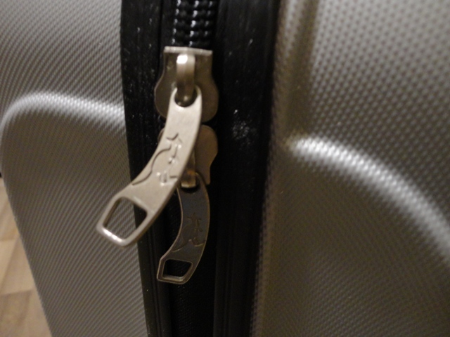 Zipsy sú prispôsobené na zámok (nie je súčasťou), tiež vtavaný zámok (zabudla sa kombinácia, no aj bez toho je kufor funkčný).