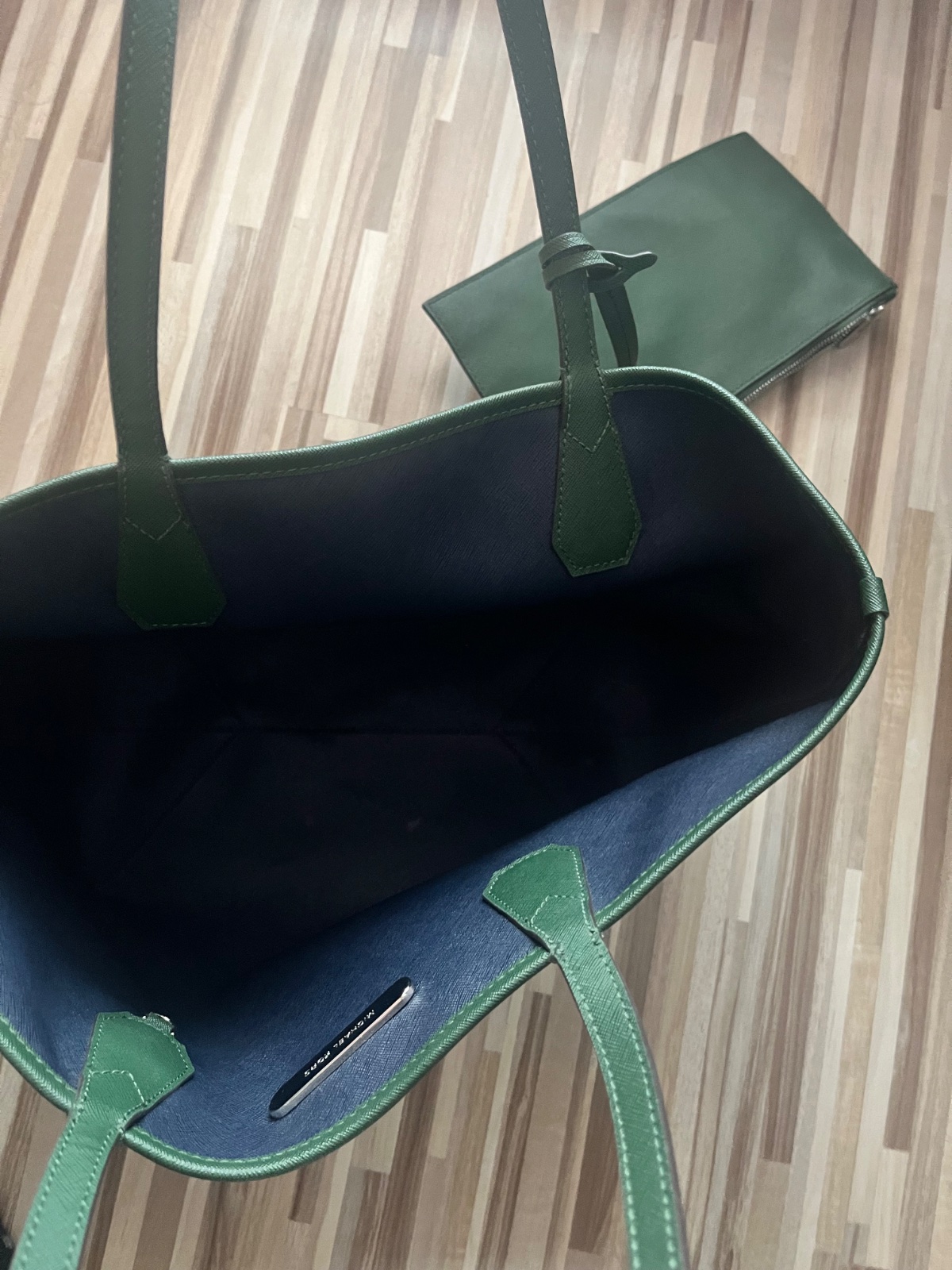 Kabelka originál Michael Kors originál. Je zo saffiano kože a je obojstranne použiteľná. Druhá strana je tmavomodrá. Ku kabelke je aj vnútorná preňaženka v zelenom prevedení. Nemá poškodenie ani na jednej strane. Nevynosím.