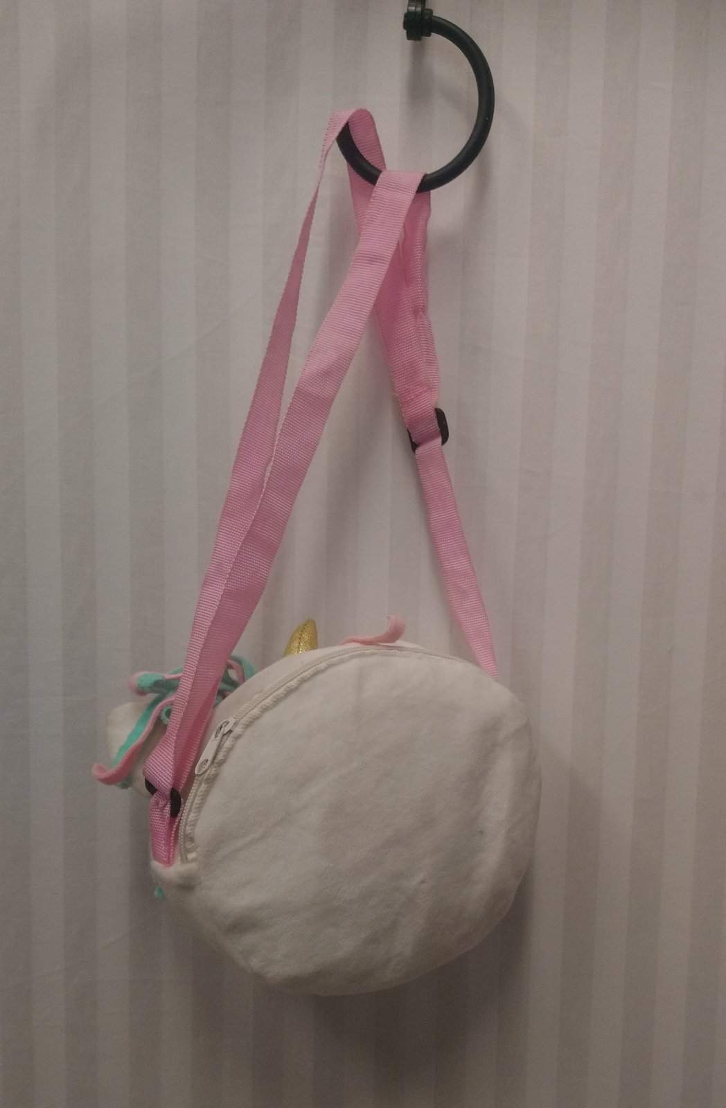 Dievčenská plyšová taštička Jednorožec, je biela s farebným motívom jednorožca, hore je zips a v ňom taštička, má nastaviteľné putko,