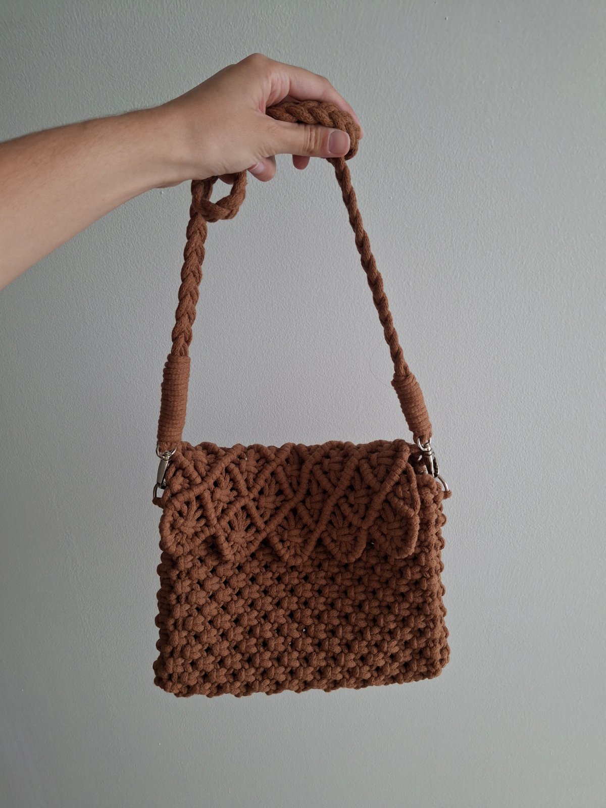 Kabelka je vyrobená technikou makramé.