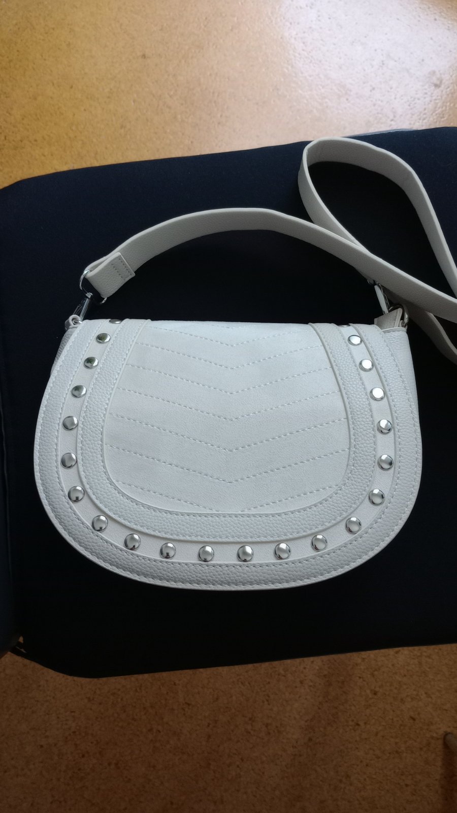 Béžová menšia kabelka, rozmery na fotke. Kúpila som ju tu, ale je pre mňa malá, tak posúvam ďalej. Nie je kožená. Na zadnej strane akoby slabý prúžok "lepidla" po štítku(posledná fotka). Inak úplne...