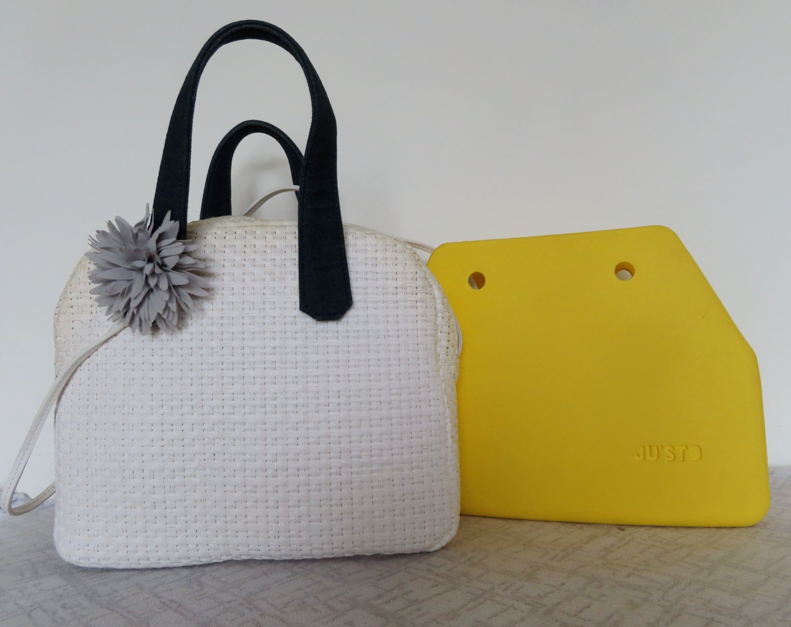 Kabelka sa skladá z troch rôznych komponentov (gumové telo tašky, uši a vnútorný organizér) vďaka čomu je možné jednotlivé diely meniť a zostaviť si kabelku podľa svojho želania. Telo kabelky je vyrobené zo silnej gumy, je pevné a držia svoj tvar. Uši kabelky sú dostatočne široké a sú vyrobené z kvalitnej rifloviny. Hlavné vrecko kabelky (organizér) sa uzatvára zipsom a po jeho rozopnutí Vám ponúkne veľký vnútorný priestor podšitý bordovou látkou. Vnútri ďalej nájdete kapsičku na drobnosti a úchytku na kľúče.