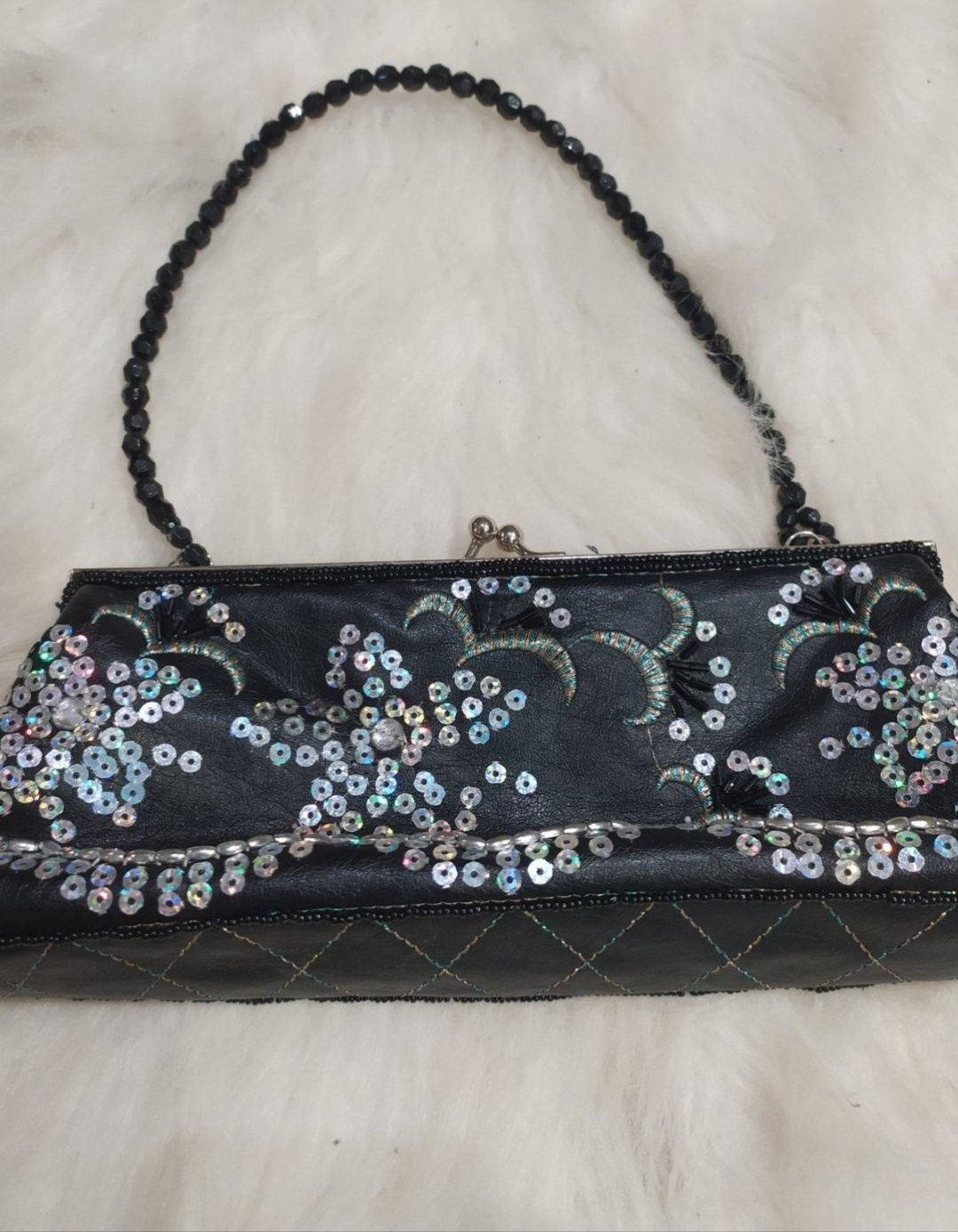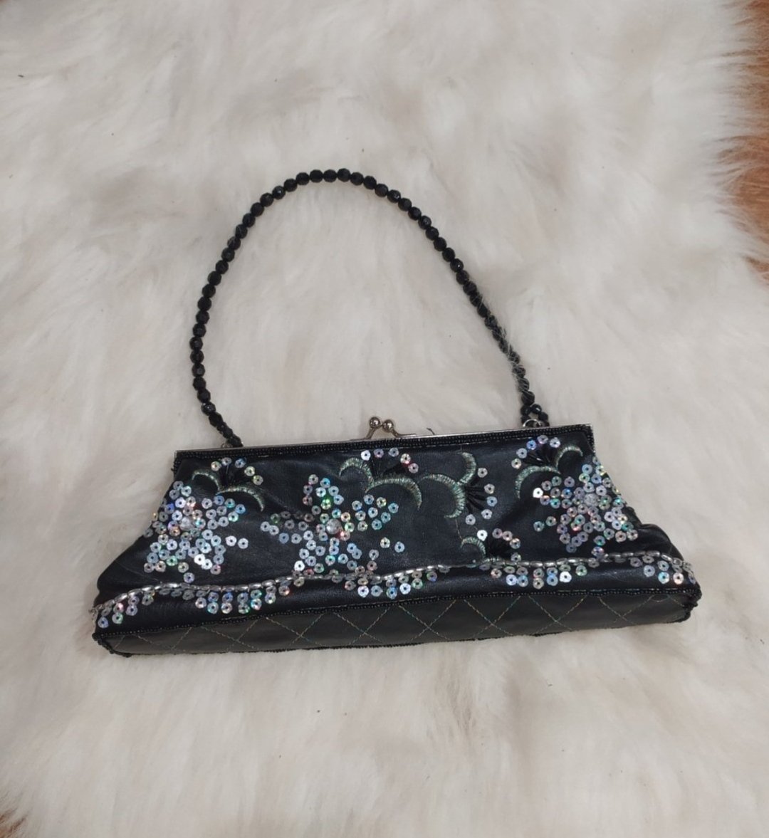farba: jedna strana biela, druhá čierna so strieborným kovaním odopínateľný dĺžkovo nastaviteľný dlhý popruh + uško do ruky veľmi štýlový kúsok priemer kruhu 20 cm, hrúbka 9 cm materiál: neprav...