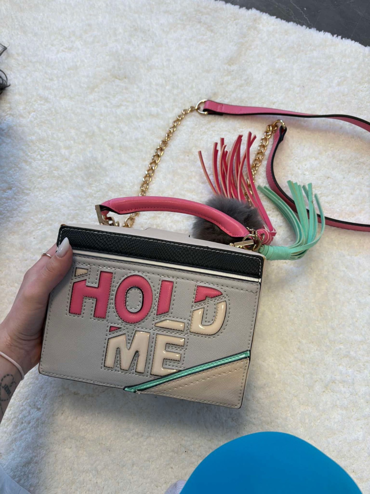 Nádherná kabelka v letných pastelových farbách. Ramenný popruh a prívesok so značkou sa dajú odopnúť. Okrem mini ošuchu- posledná foto, je úplne bez poškodení, použitá asi 2 krát