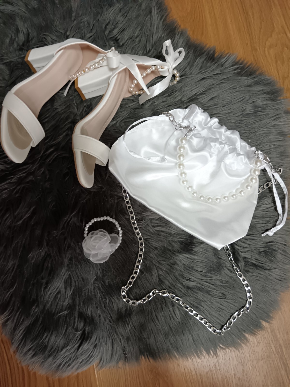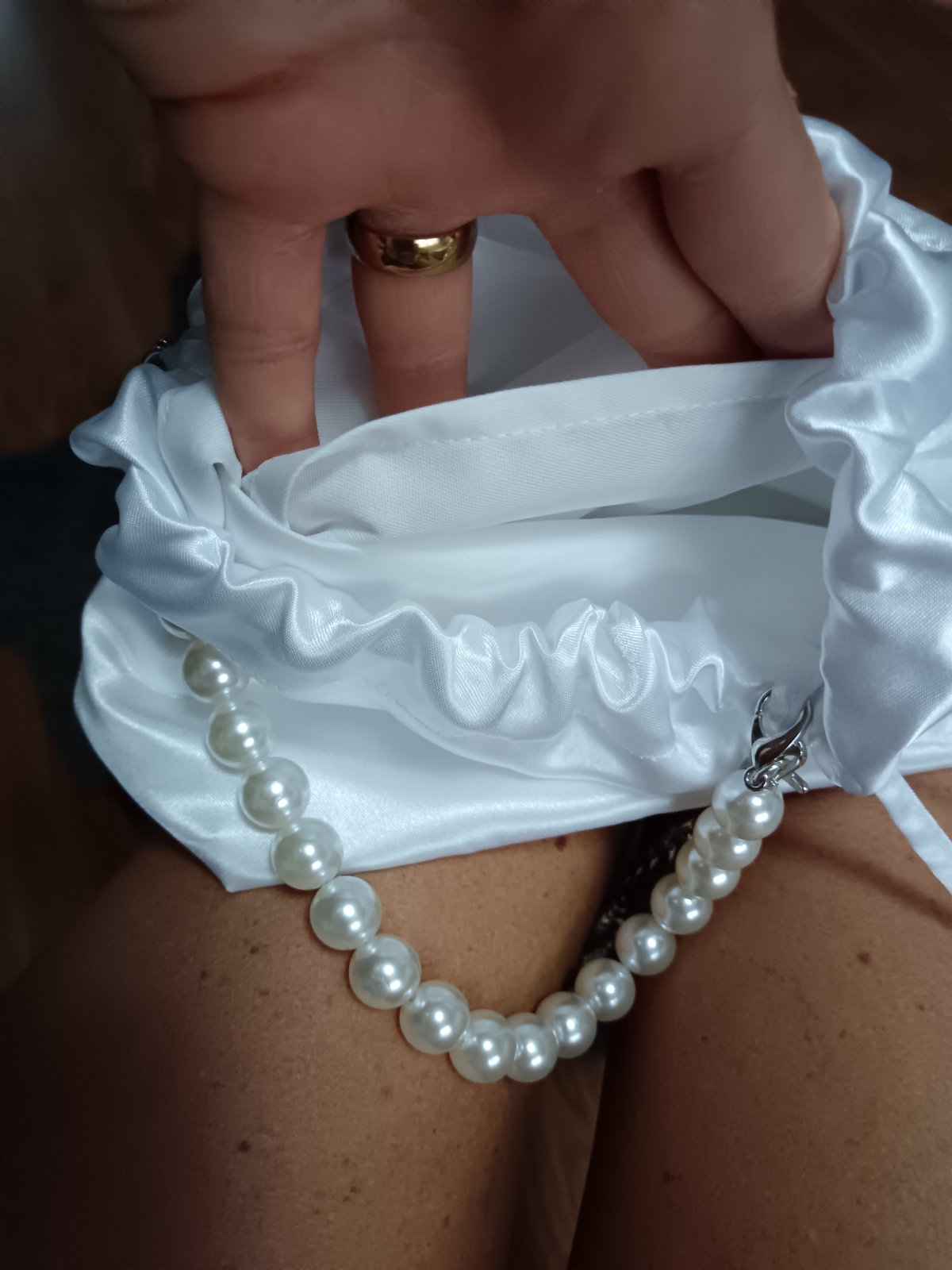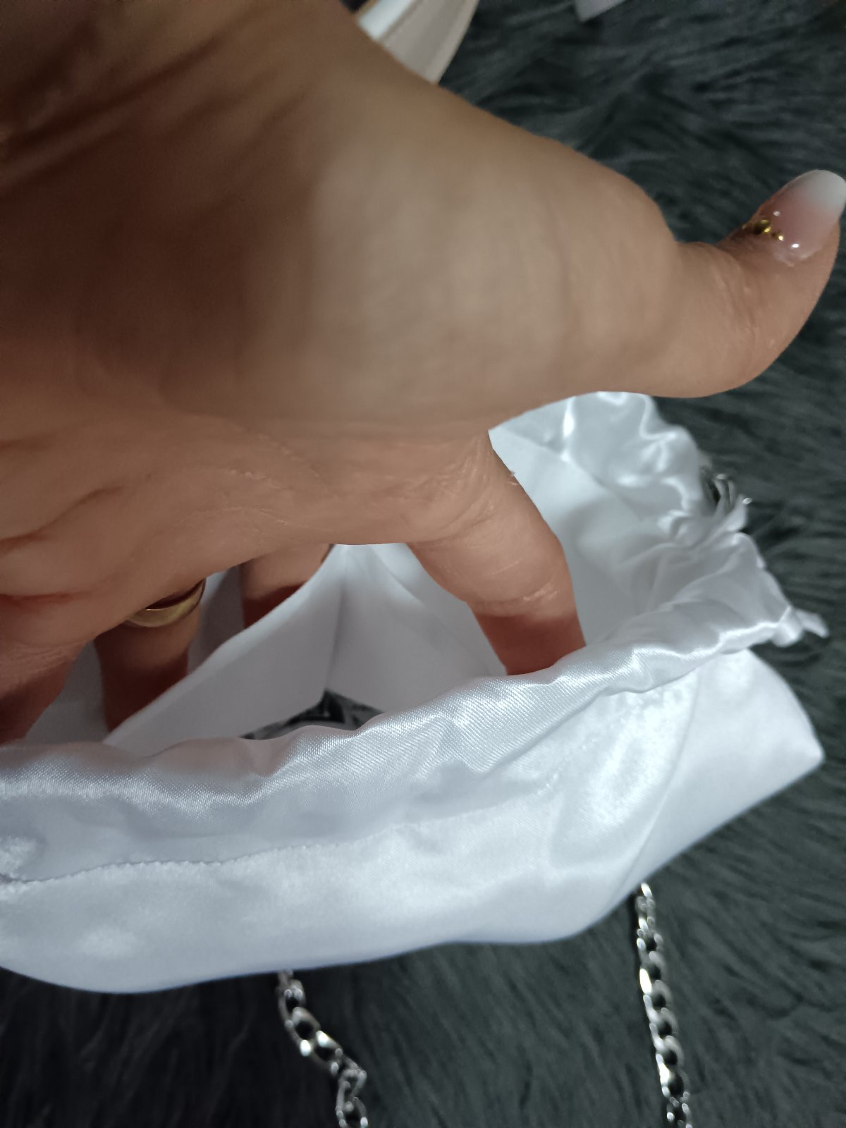 Objednala som si na svadbu, nakoniec som ju ani nepoužila. Vnútry má dve malé vrecká(na mobil). Retiazka cez pleco sa dá odopnúť. Mám aj náramok podobný (viď fotka)