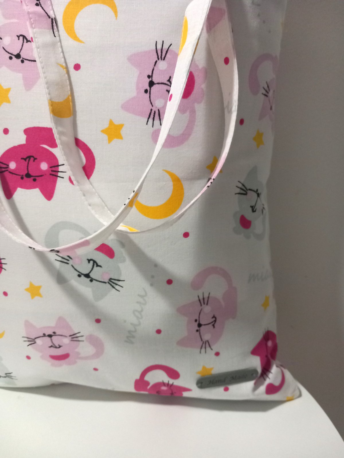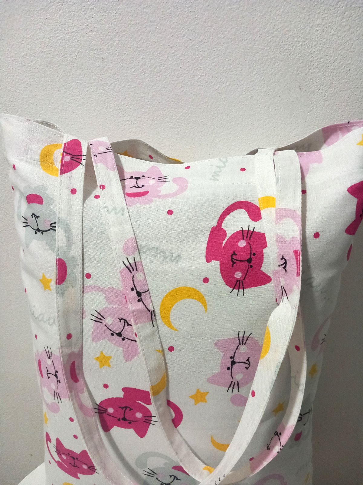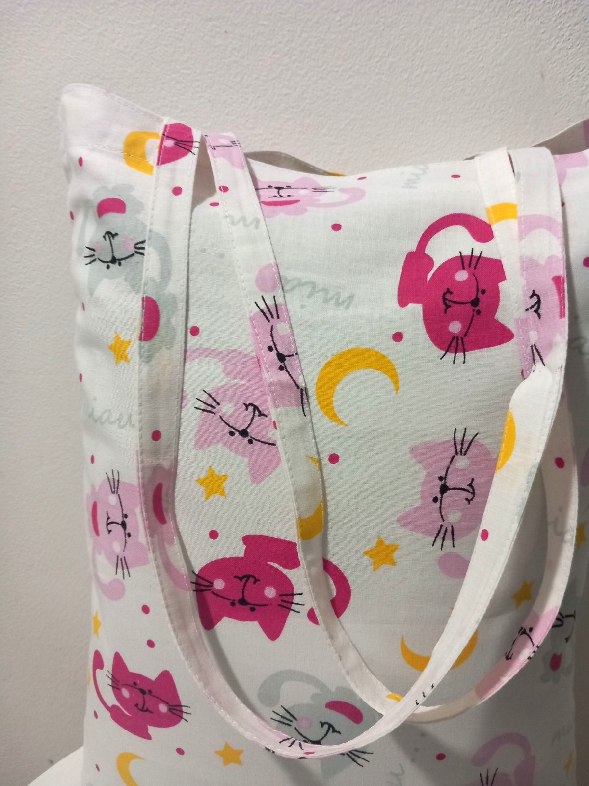 Taška so vzorom ružové mačky ktorá poteší vaše srdiečko ,pri pohľade na tie mačky sa hned cítite lepšie a aj ľudia okolo vás .Taška je ušitá z kvalitnej bavlny