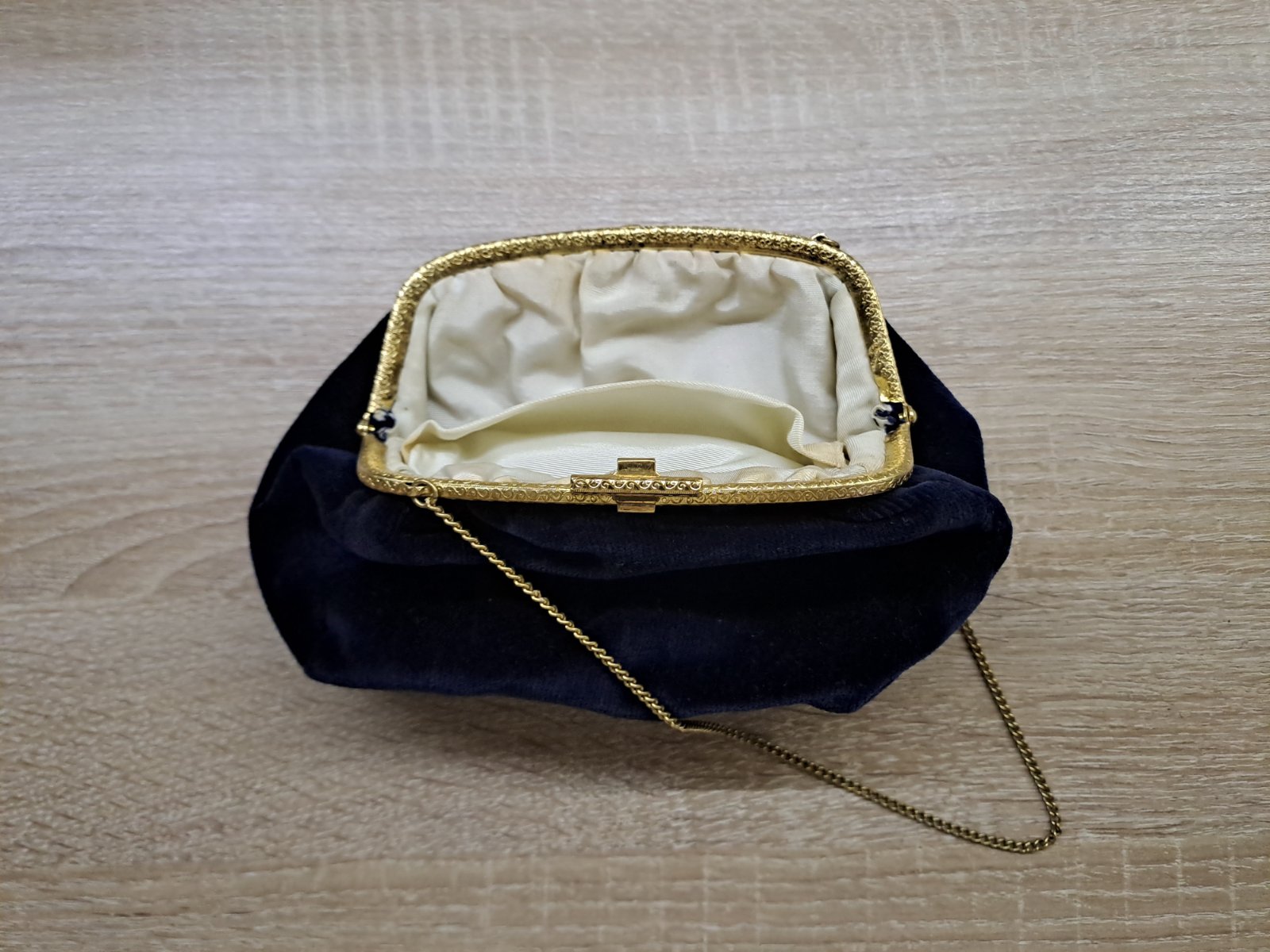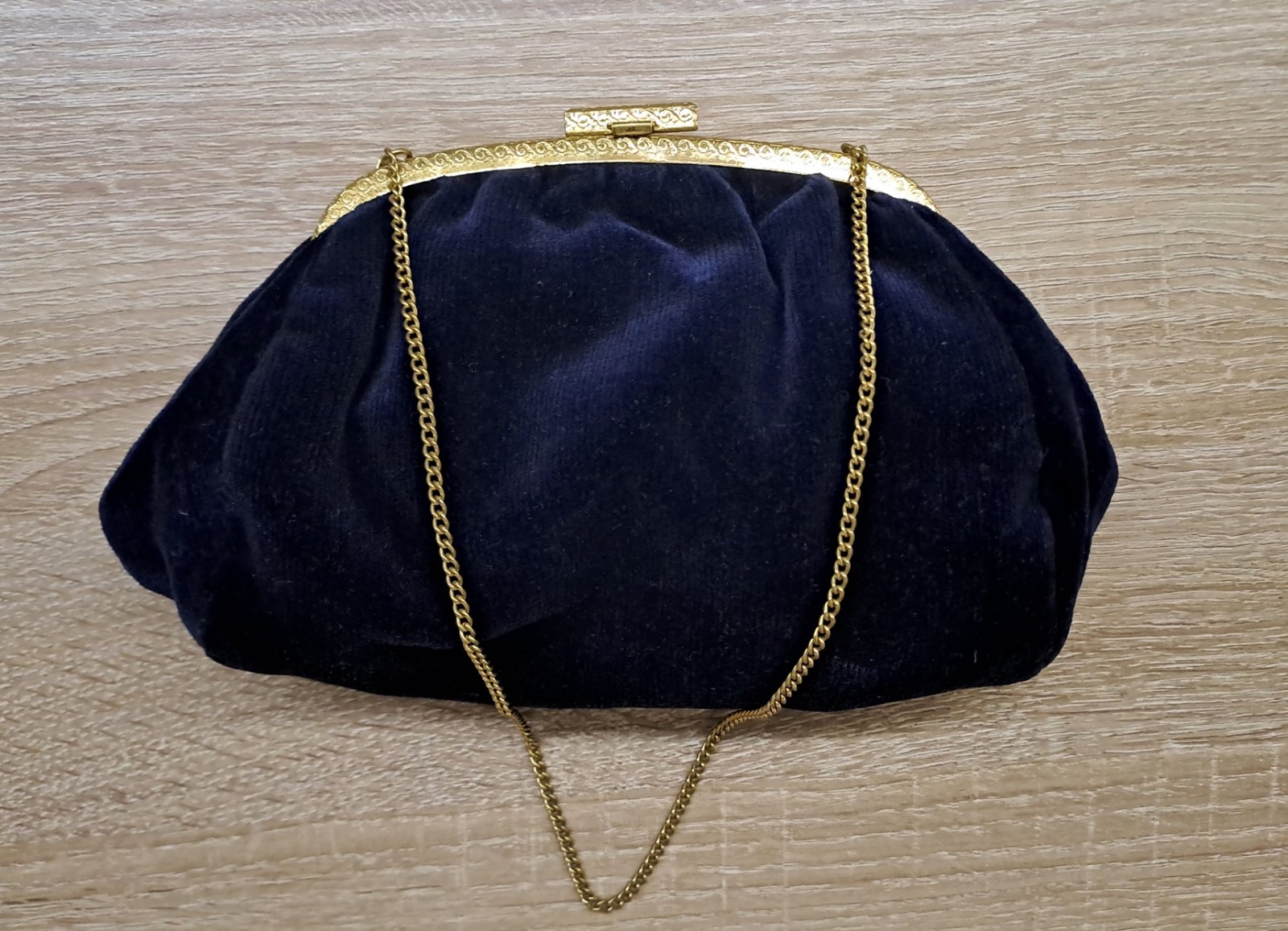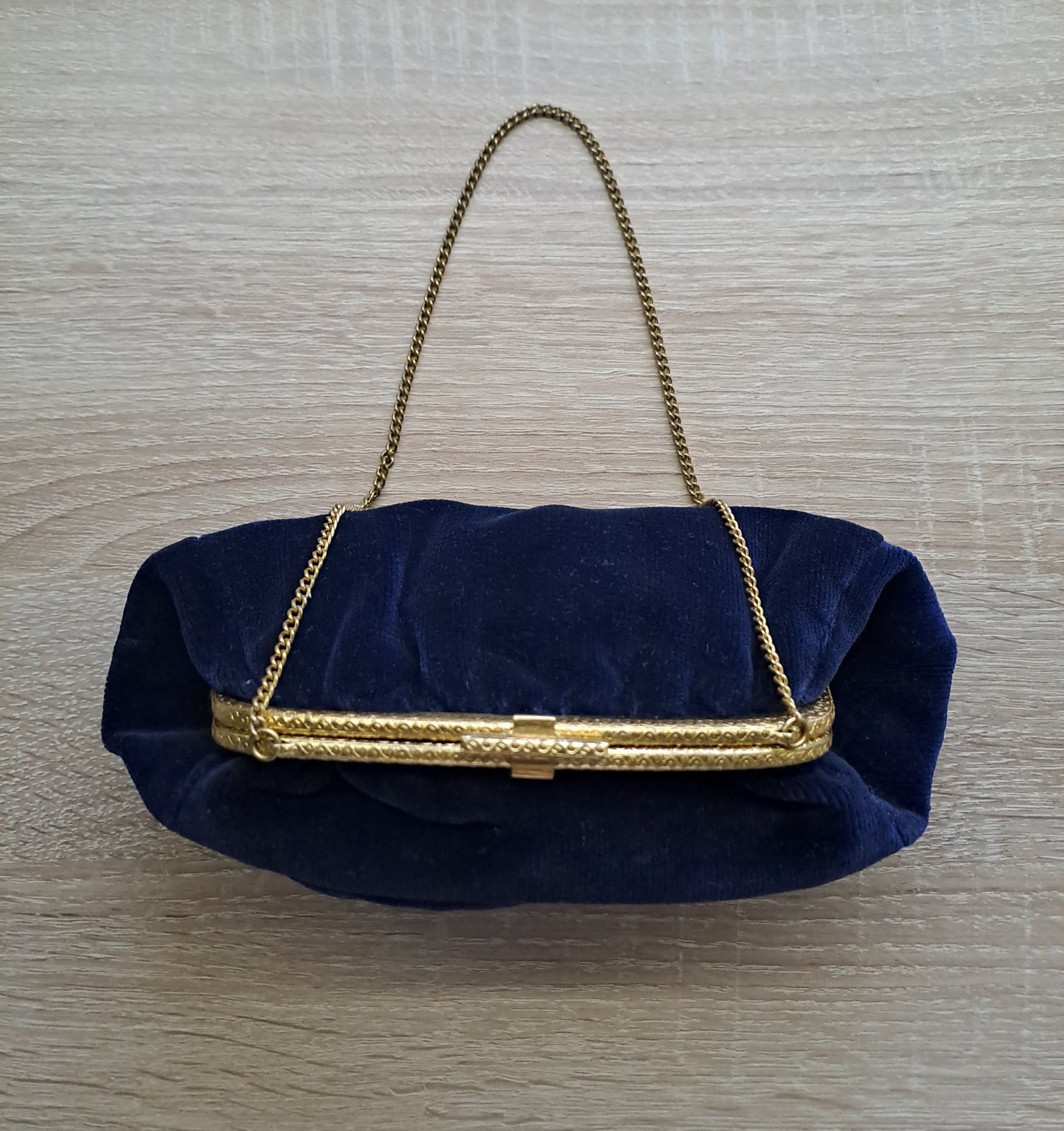 Krasna, zachovala, elegantna semisova listova kabelka tmavomodrej farby so zlatym olemovanim vhodna napriklad na plesovu sezonu.