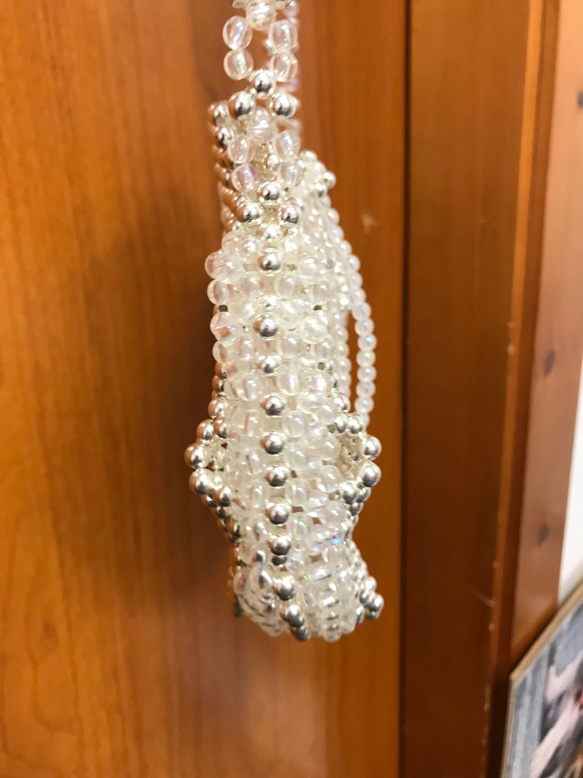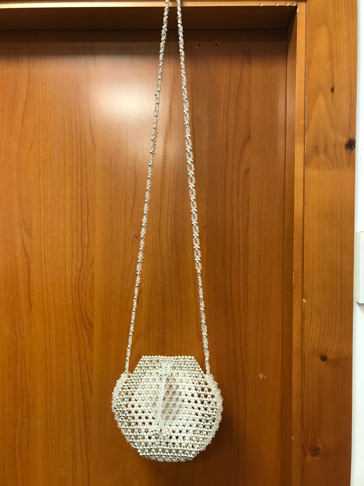Malá torbová kabelka z troch druhov korálok, zapínanie na zaťahovanie, na mobil, peňaženku a pár nevyhnutných drobností:) Rozmery: 17x15x3 cm, celková dĺžka 81 cm