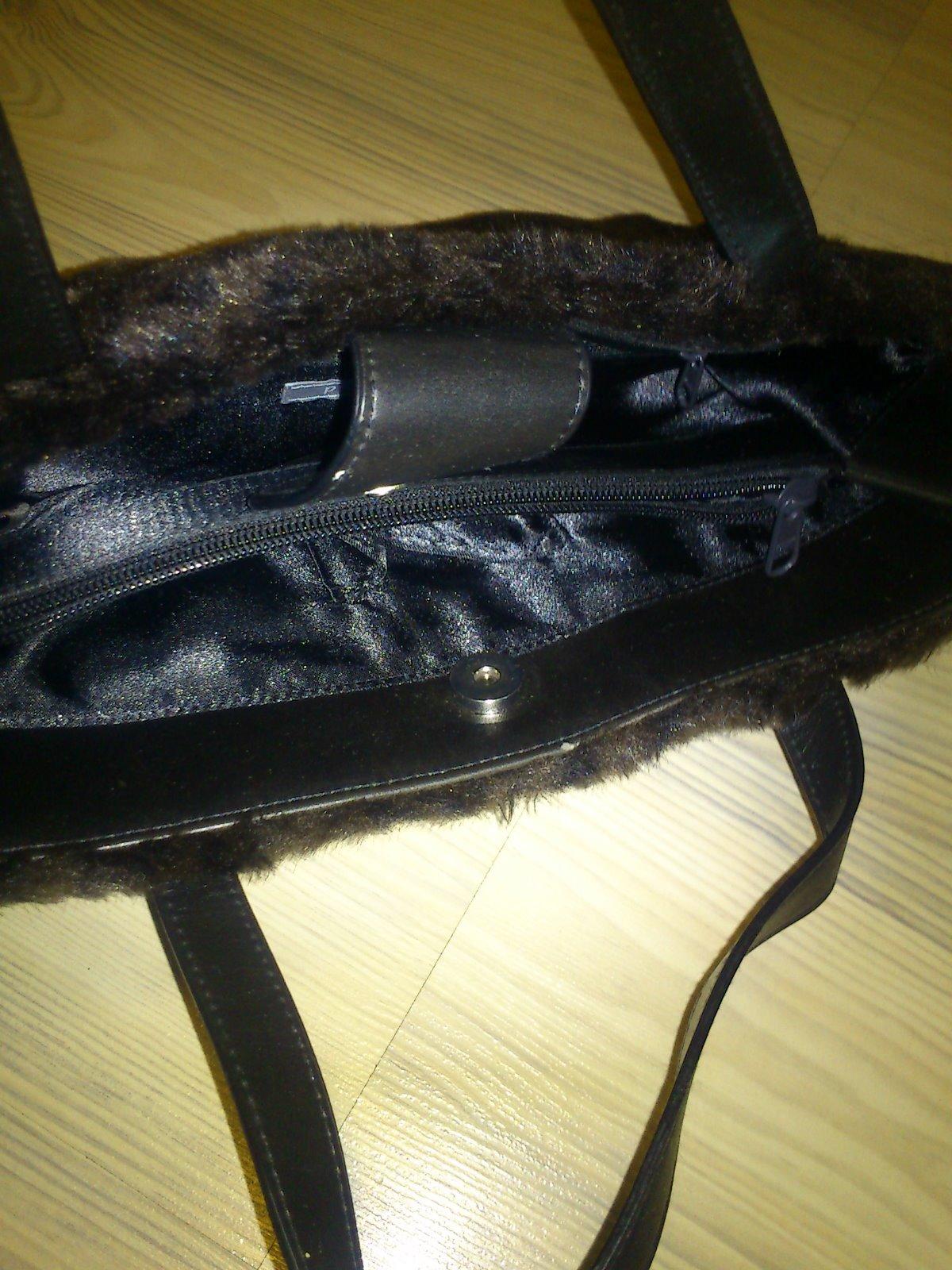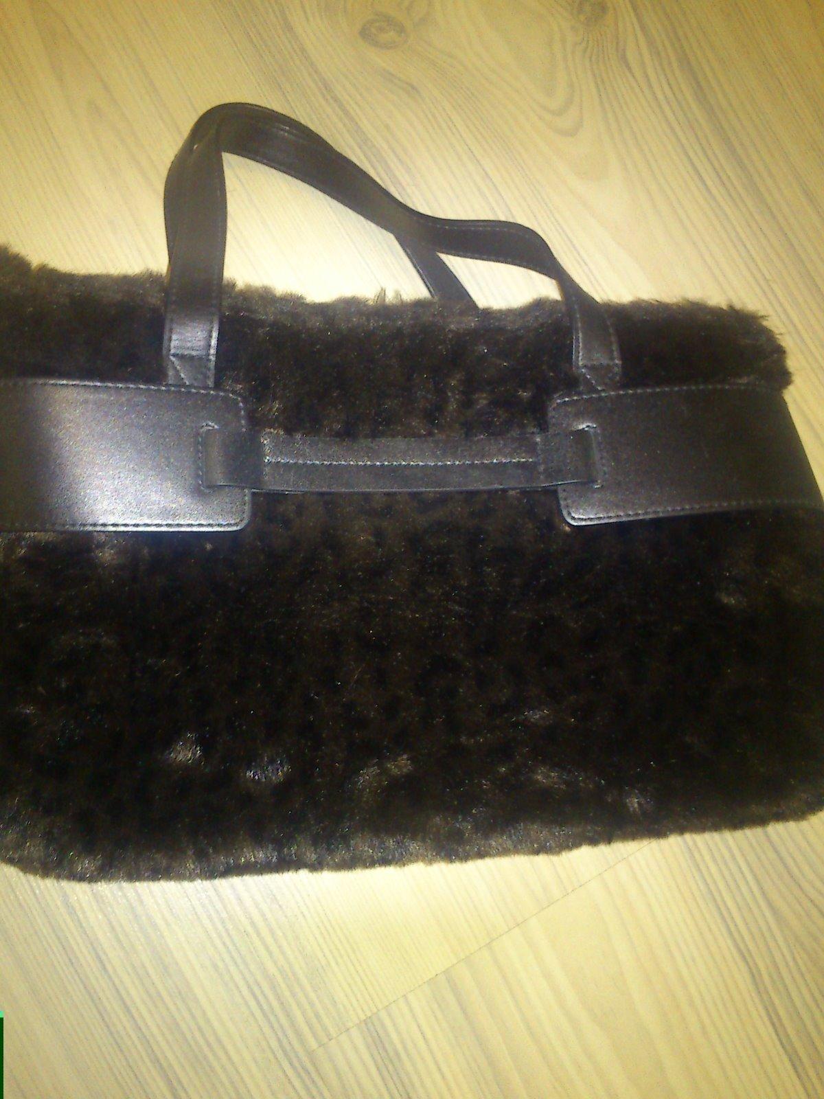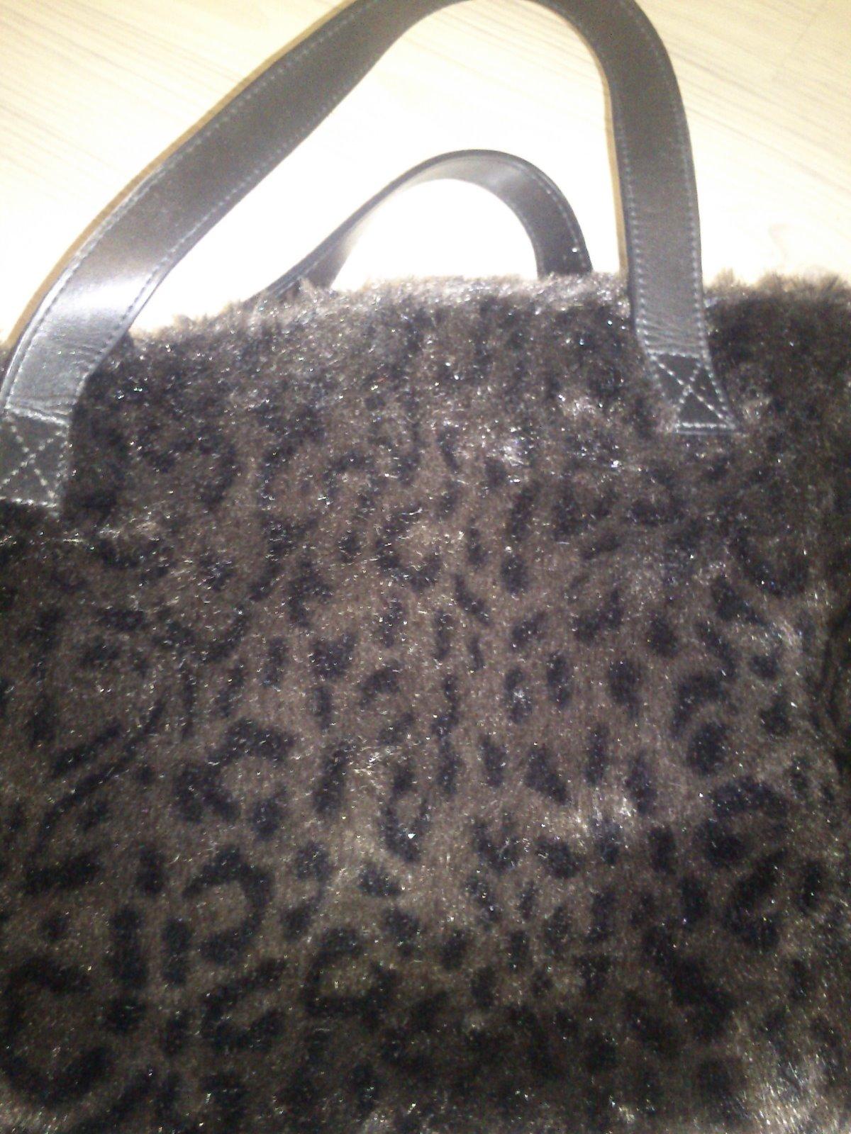 Malá čierna kabelka do ruky. Materiál koženka, povrch imitácia kožušiny, leo vzor hnedej farby. Použitá pár krát, ako nová, nepoškodená. Značka Per Una. Vnútro s podšívkou, priehradka so zipsom, bočné vrecko so zipsom, ďalšie bočné vrecko na opačnej strane na mobil. Vrchné zapínanie pracka s cvočkom. 2 úchytky do ruky, každý 38 cm, výška je 21 cm, šírka je 36 cm, spodná časť 12 cm.