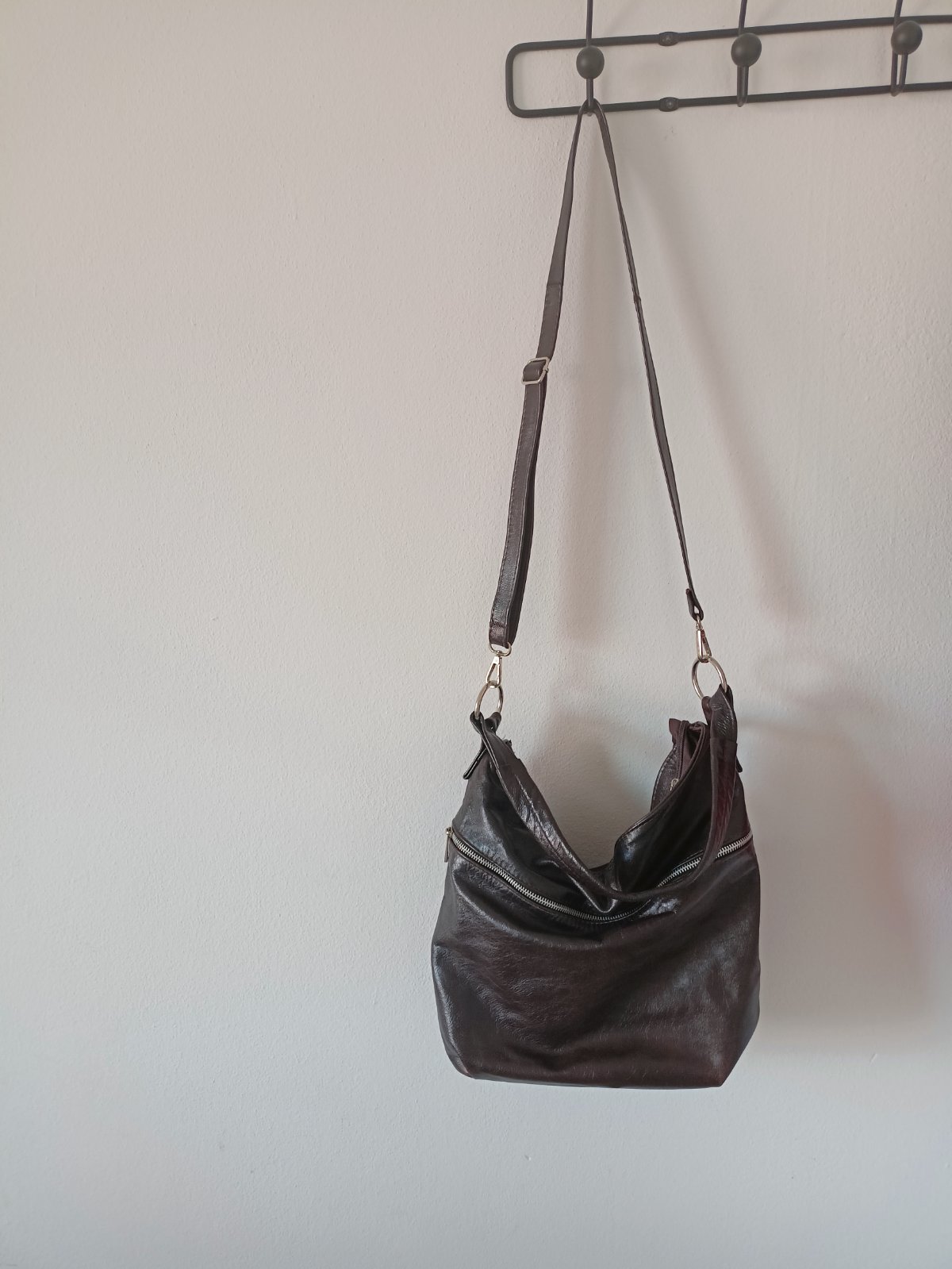 Má farbu tmavej čokolády. 2x nosená, bezchybná. Zdá sa byť malá, ale má vnútri 4 priehradky, z toho 2 na zips a 2 na magnetický patent + vonkajšie vrecká. Ramienka sú dlhšie, takže sa dá nosiť aj ...