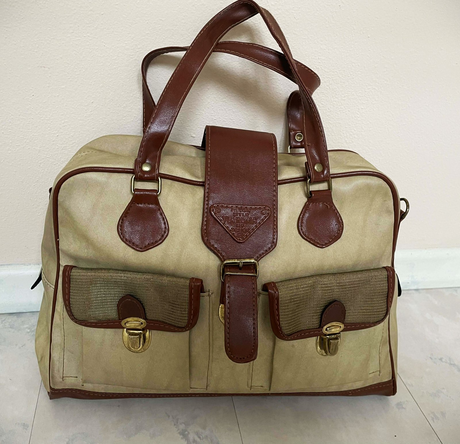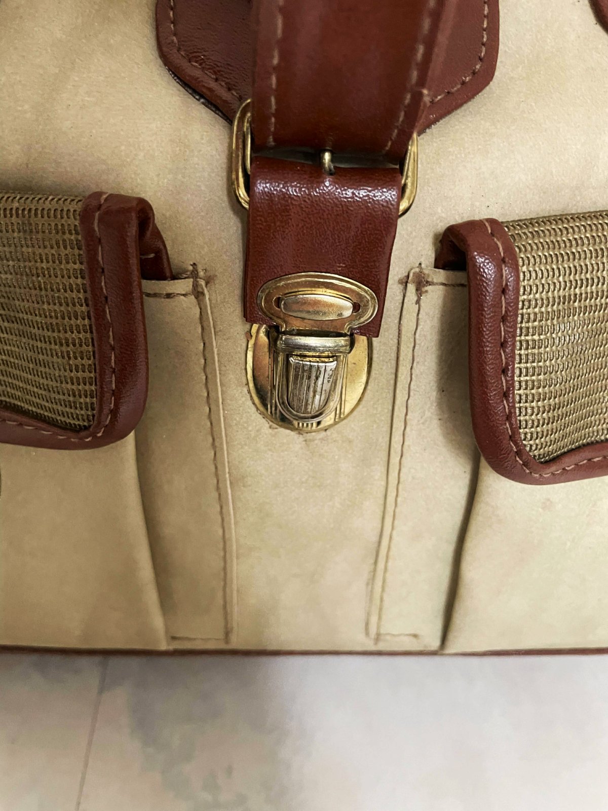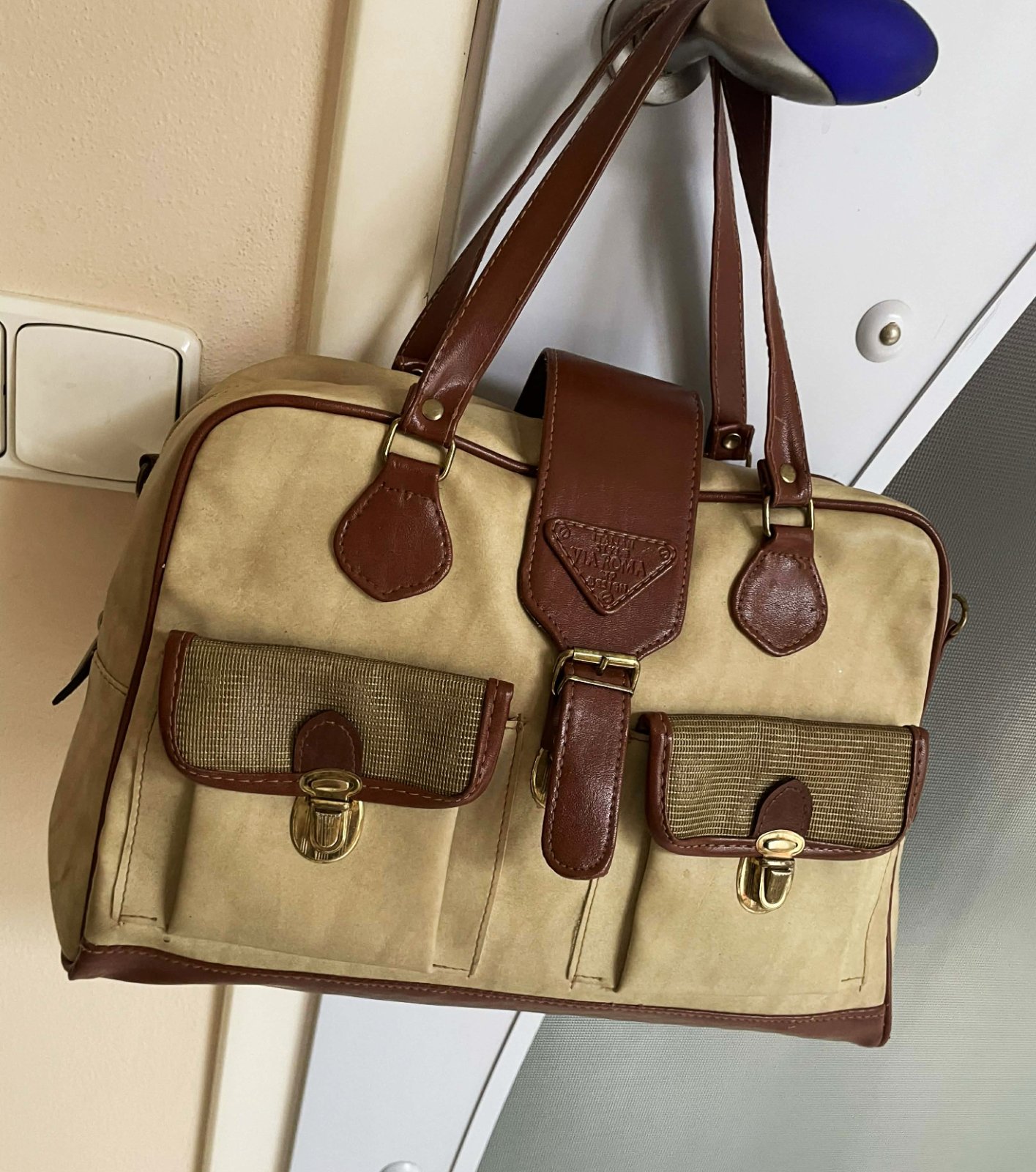 vkusná kabela do ruky, veľmi priestraná, vyrobená zo syntetiky imitujúcej kožu s jemnou patinou,v béžovom odtieni s hnedými koženými prvkami a lemovaním,dve predné vrecká s chlopňami a s kovovými sponami.Výška 25 cm, šírka 35 cm,boky a dno 12 cm,rúčky 42 cm