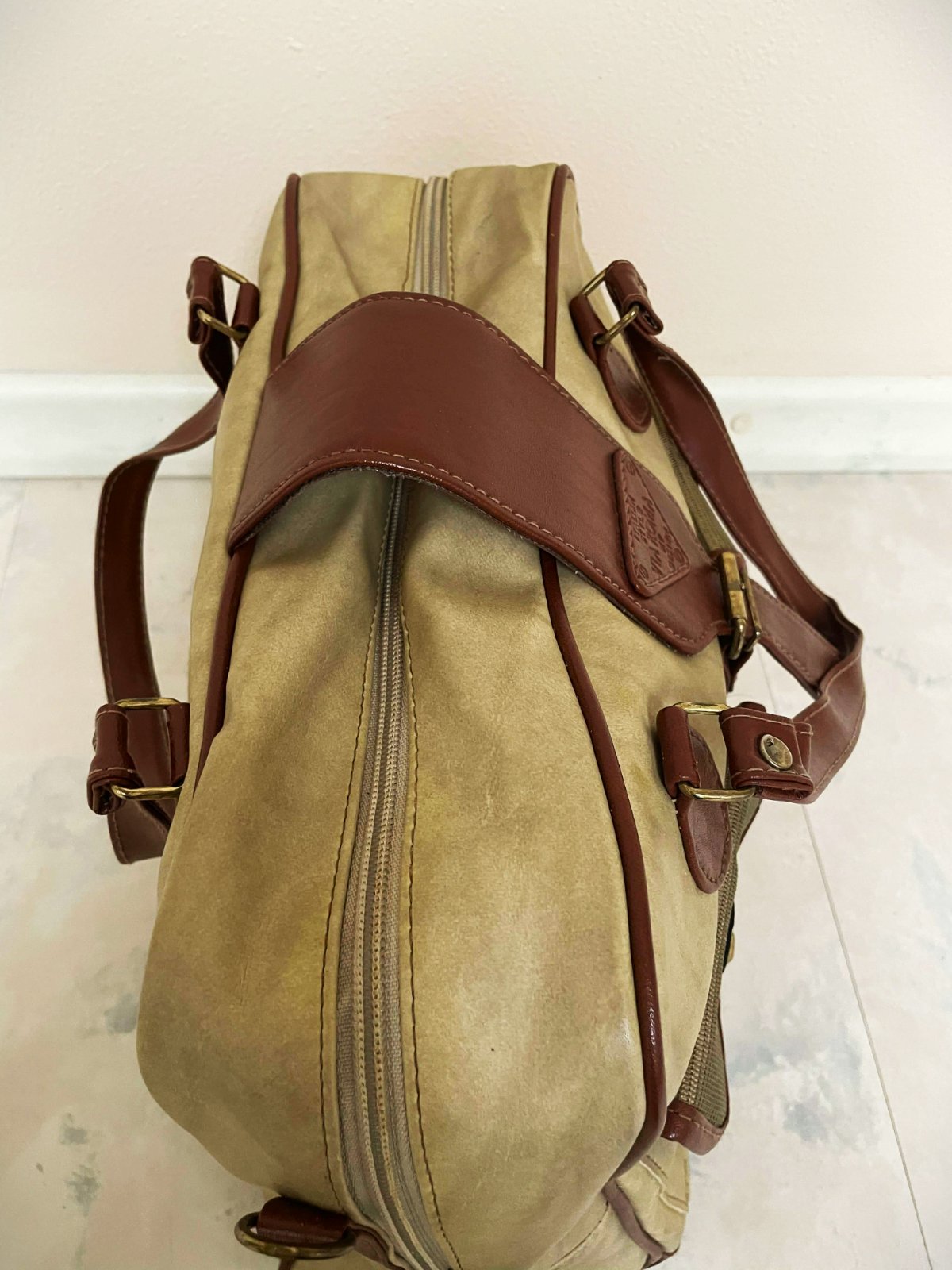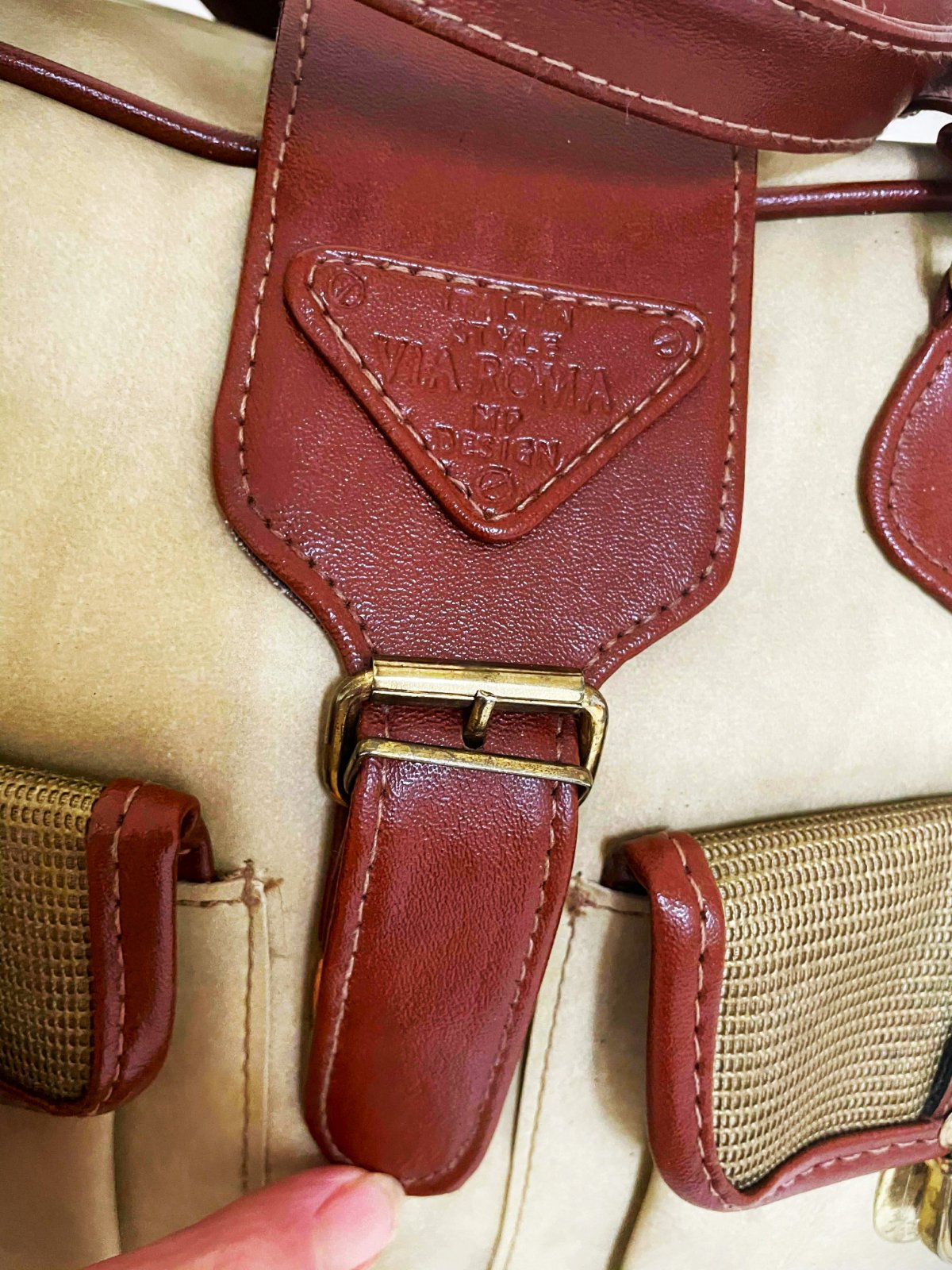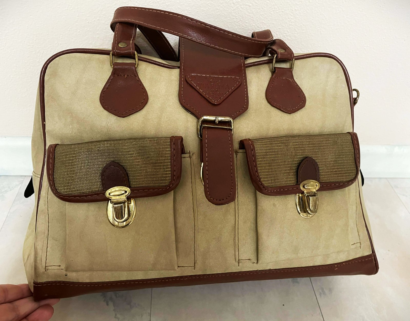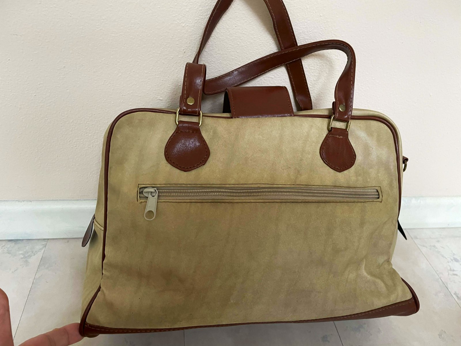 vkusná kabela do ruky, veľmi priestraná, vyrobená zo syntetiky imitujúcej kožu s jemnou patinou,v béžovom odtieni s hnedými koženými prvkami a lemovaním,dve predné vrecká s chlopňami a s kovovými sponami.Výška 25 cm, šírka 35 cm,boky a dno 12 cm,rúčky 42 cm