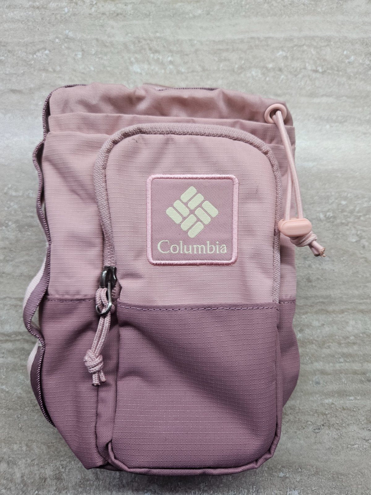 Použitá asi 2x, bez chýb a poškodení. Hore otvor na fľašu, príp. iné veci, zaťahovací priečinok. V predu kapsa na telefón, kľúče. Dĺžkovo nastaviteľný popruh, rozmery vo foto. PC 35€.