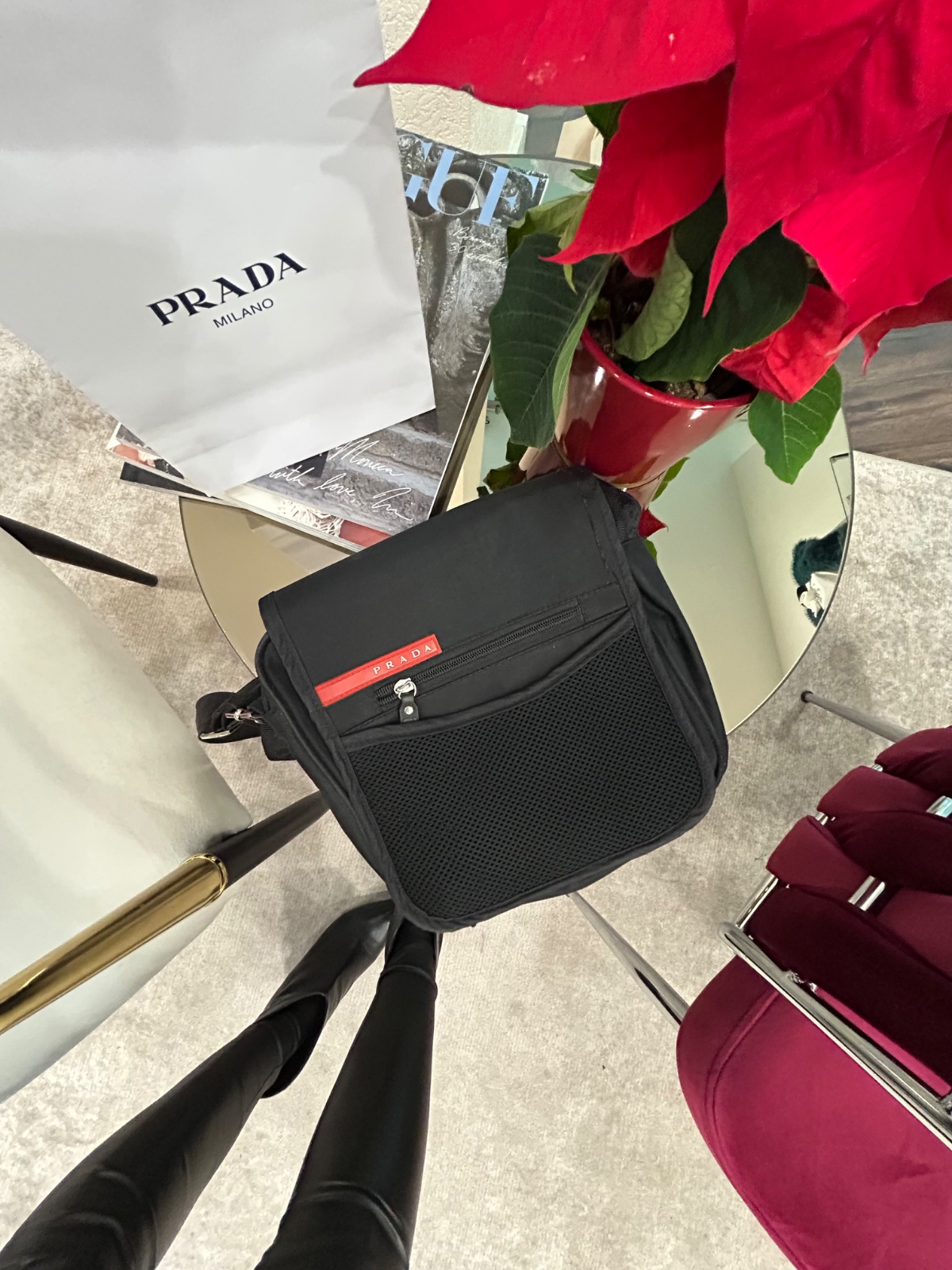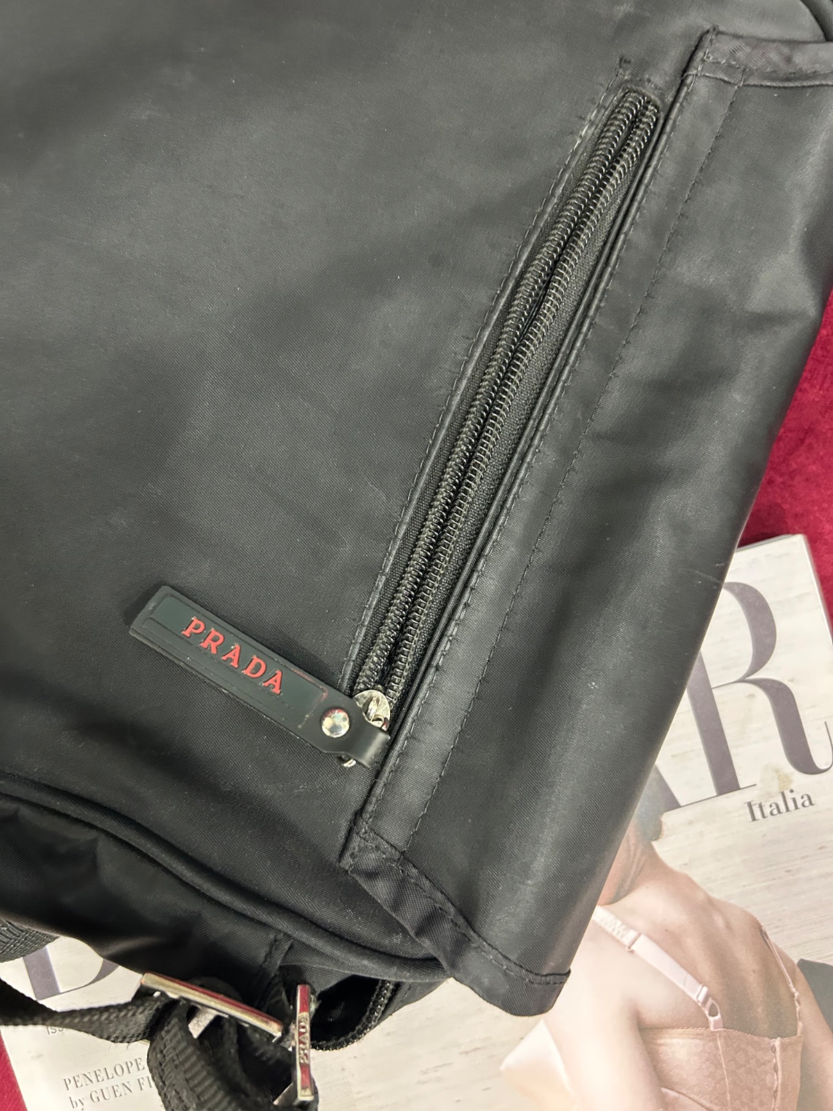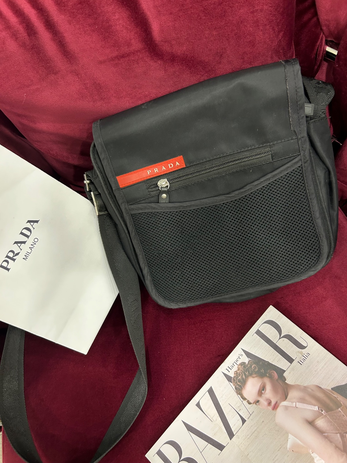 Malo nosena panska Prada taška. Zmeriam. Top stav. Aj taška papierová.