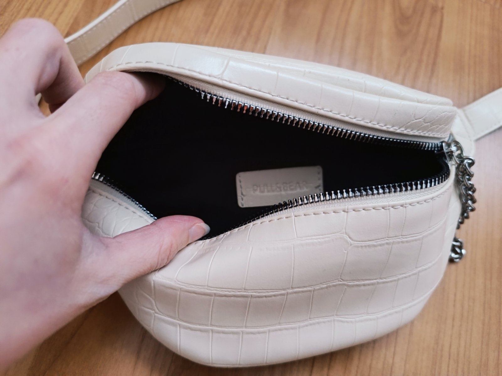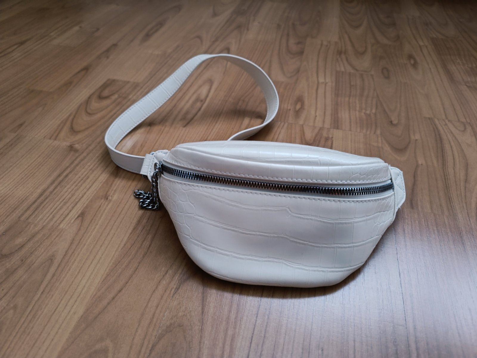 Krémová ladvinka Bagger Nosená minimálne,no bez vážnejšieho poškodenia Materiál: PU koža Farba: biela Zapínanie: zips Vnútro: vrecko na zips, vrecko na drobnosti Povrch: jemne vrúbkovaný, m...