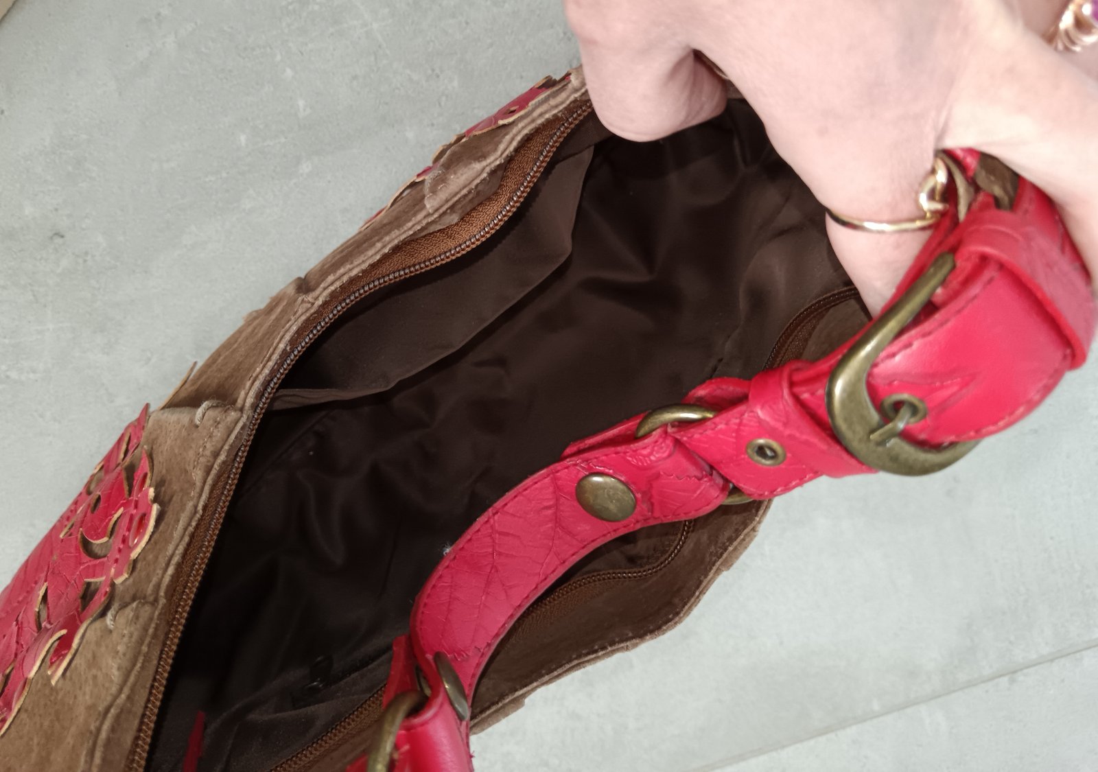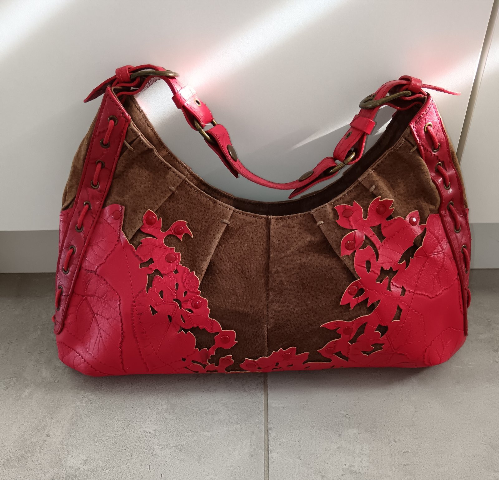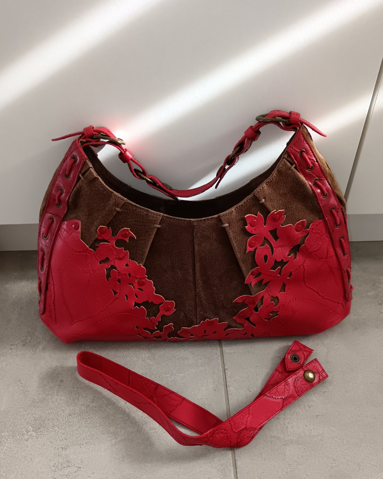 Vinovo červena kabela so zamatovou ciernou aplikaciou velmi malo nosena bez poškodenia.