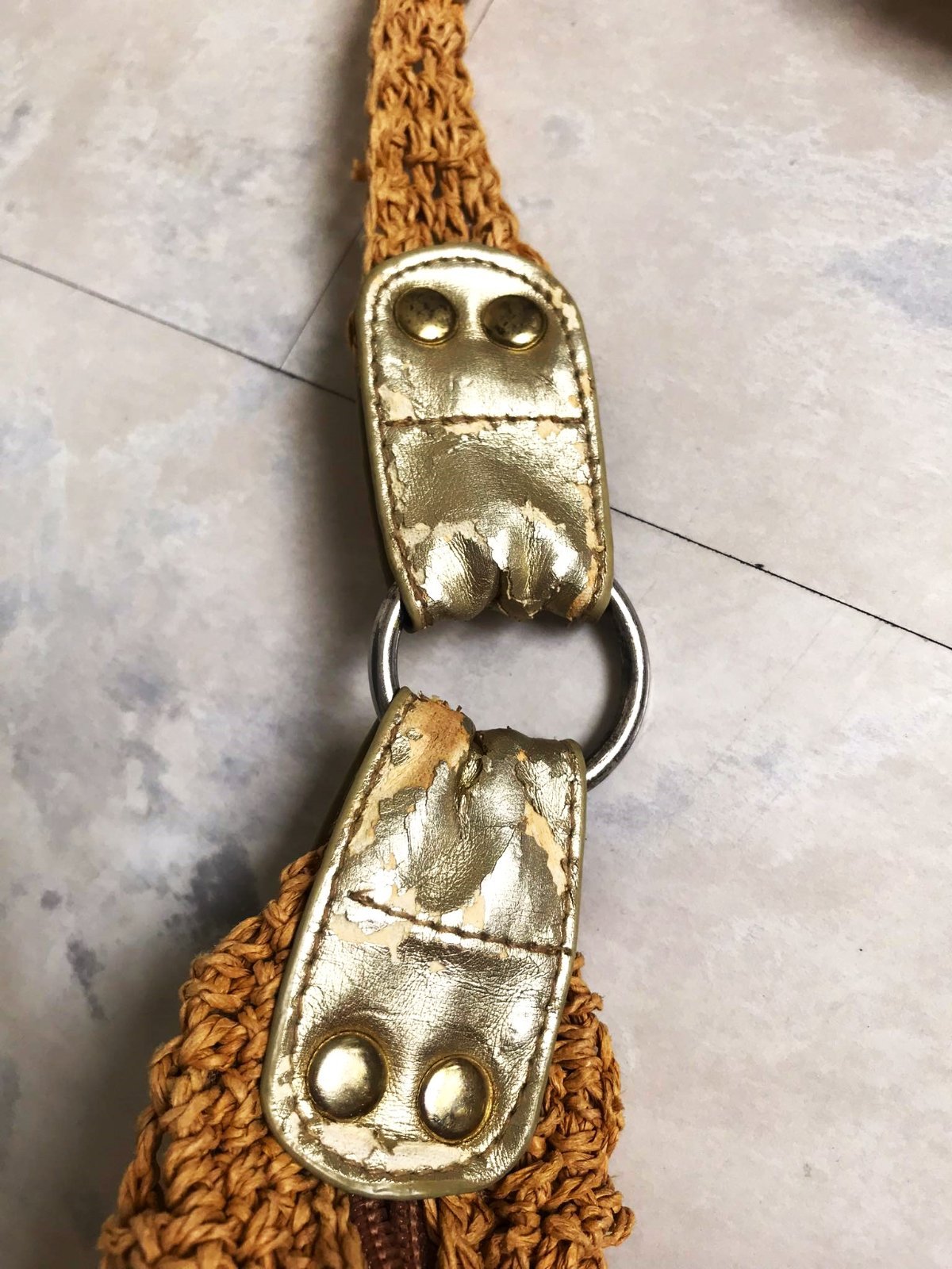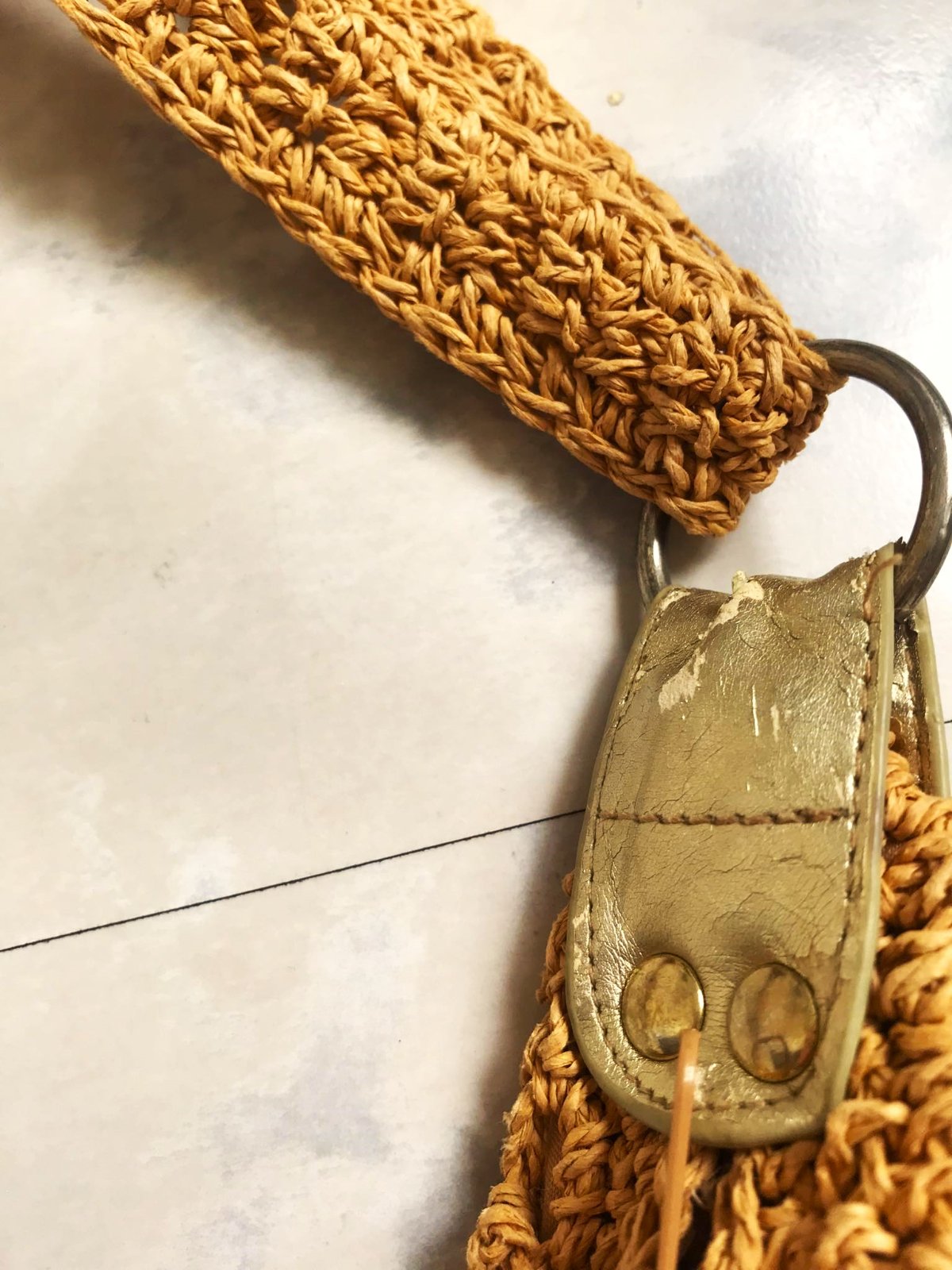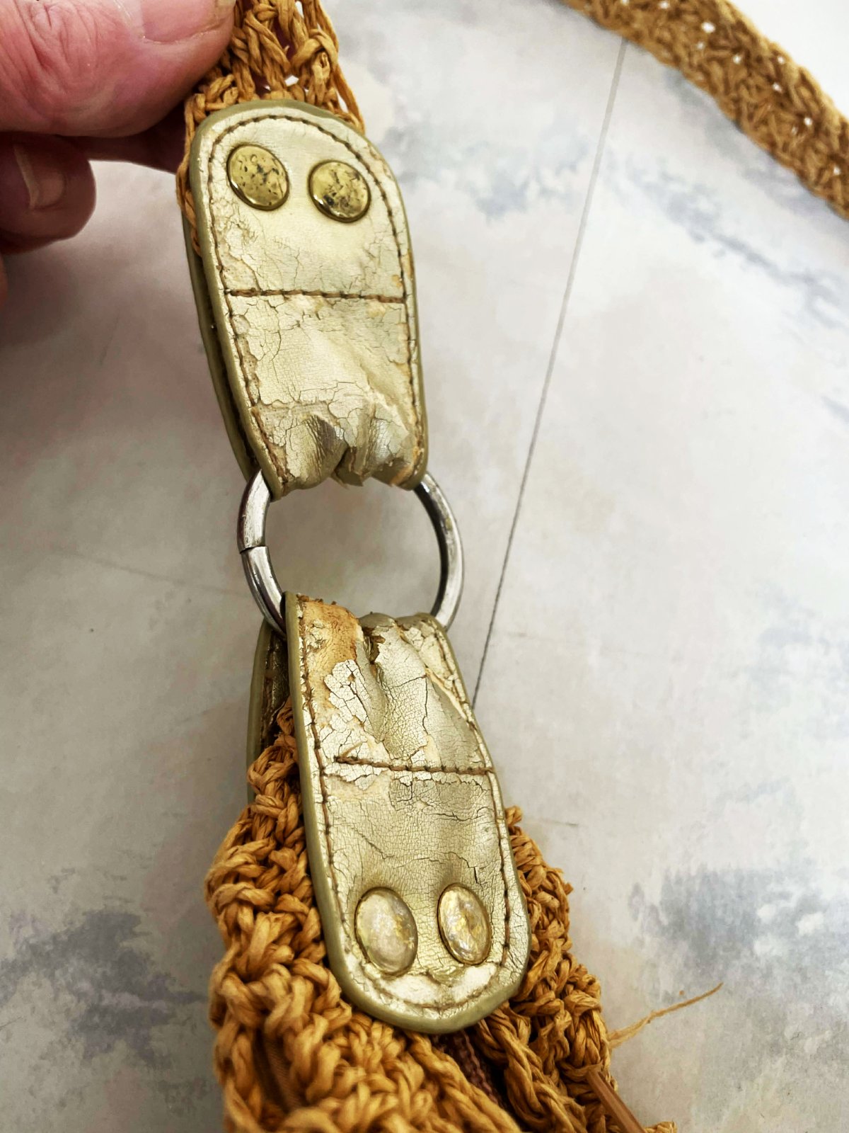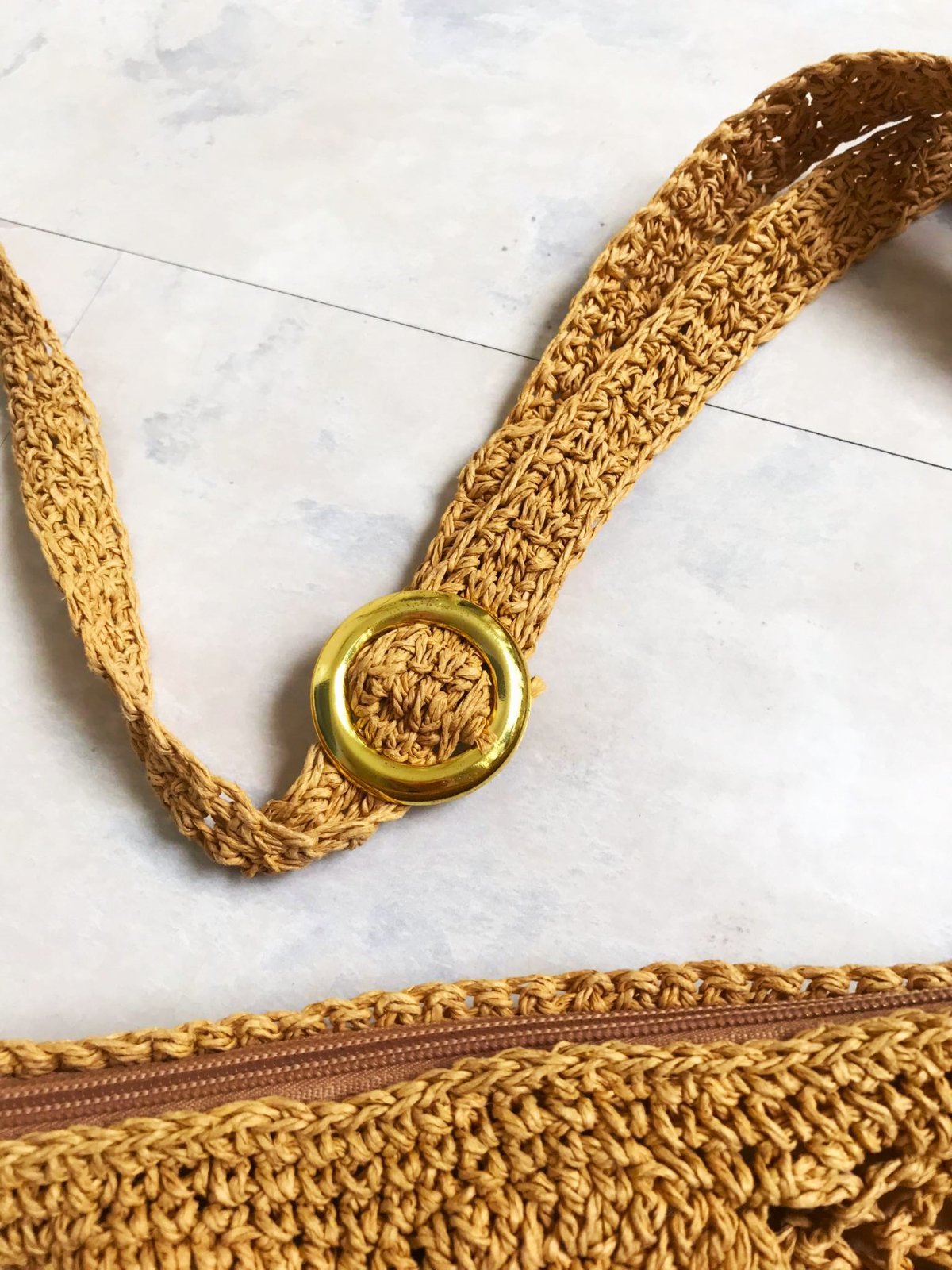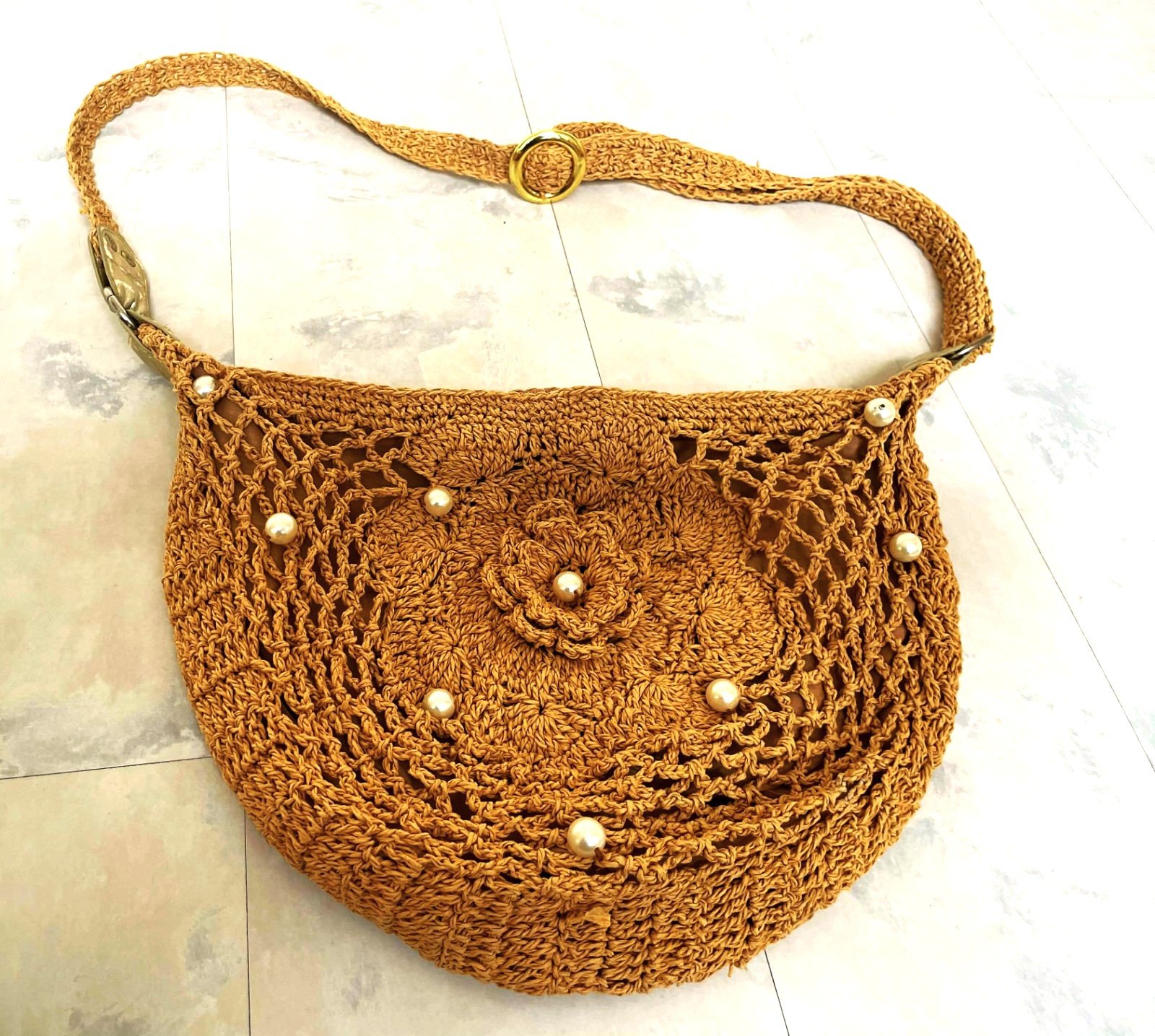 háčkovaná kabelka cez rameno v štýle "boho" v horčicovej farbe, má tvar polmesiaca a je ozdobená perlovými aplikáciami a háčkovaným kvetinovým motívom v strede,poškodenia : v časti ,kde sa upínajú rúčky je jemne olúpaná farba ( zlaté úchytky ), čo pri nosení nie je veľmi vidno, dá sa to aj olúpať a v zadnej časti zachytené lyko - viď detailné foto , čo tiež nie je pri nosení vidno a nenarúša to estetický vzhľad tašky - ale upozorňujem