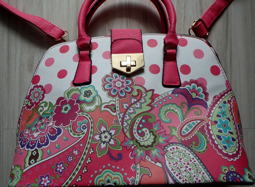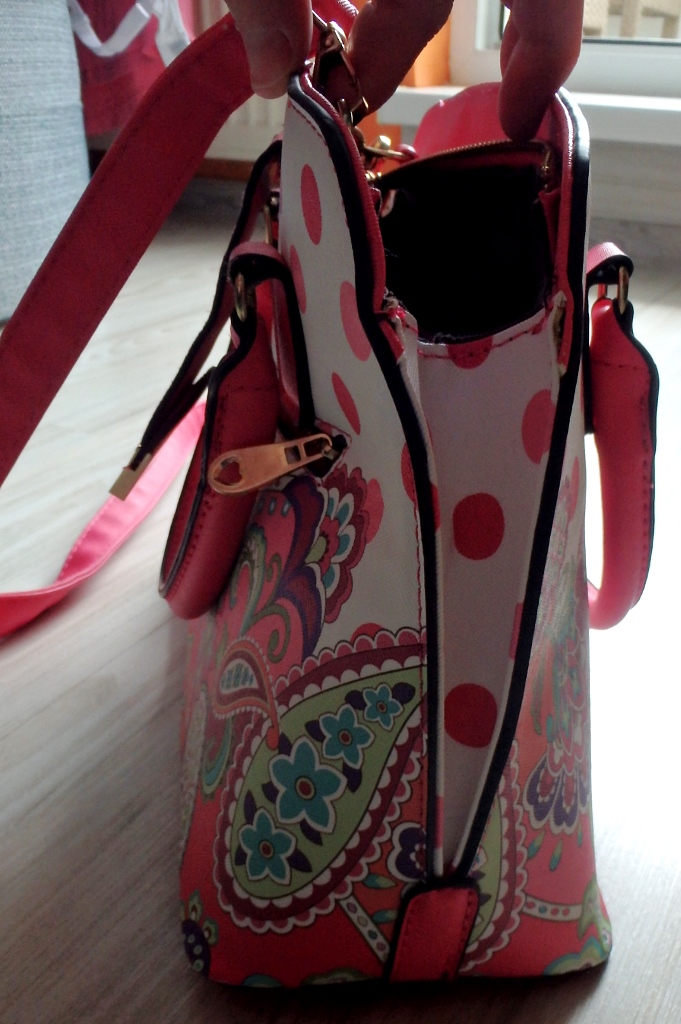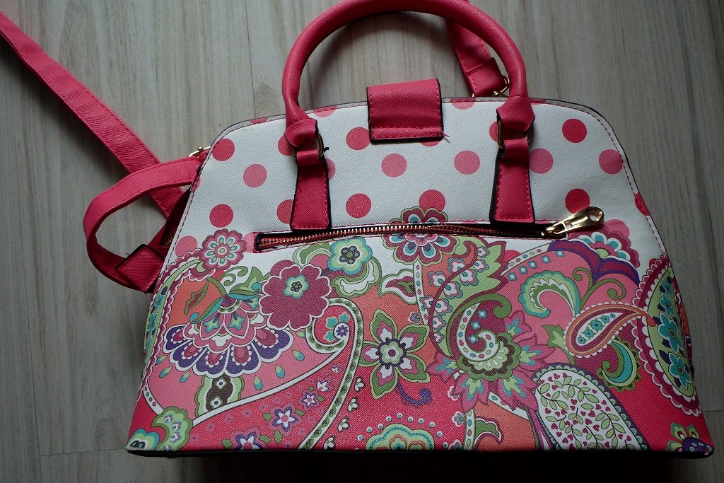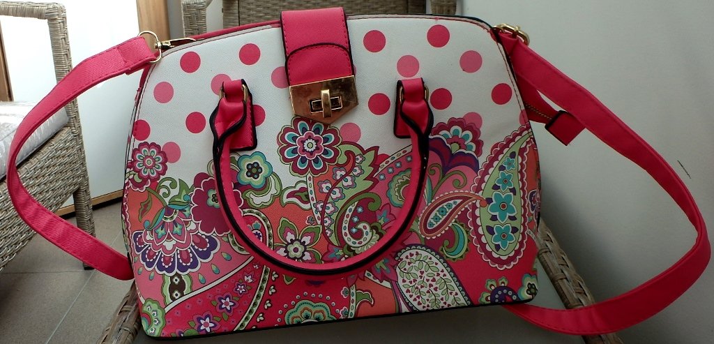 Predám peknú kvietkovanú stredne veľkú pevnejšiu kabelku do ruky, ale dá sa prehodiť aj cez plece, má nastaviteľný popruh. Zapína sa na zips a remienkoch s prackou (viď foto).