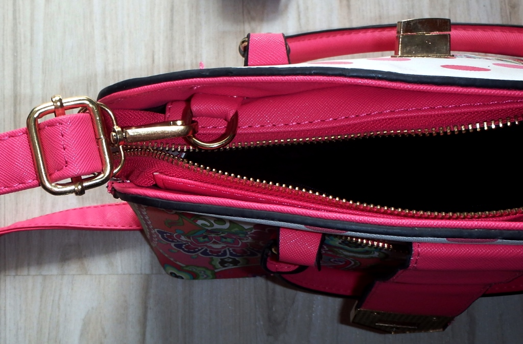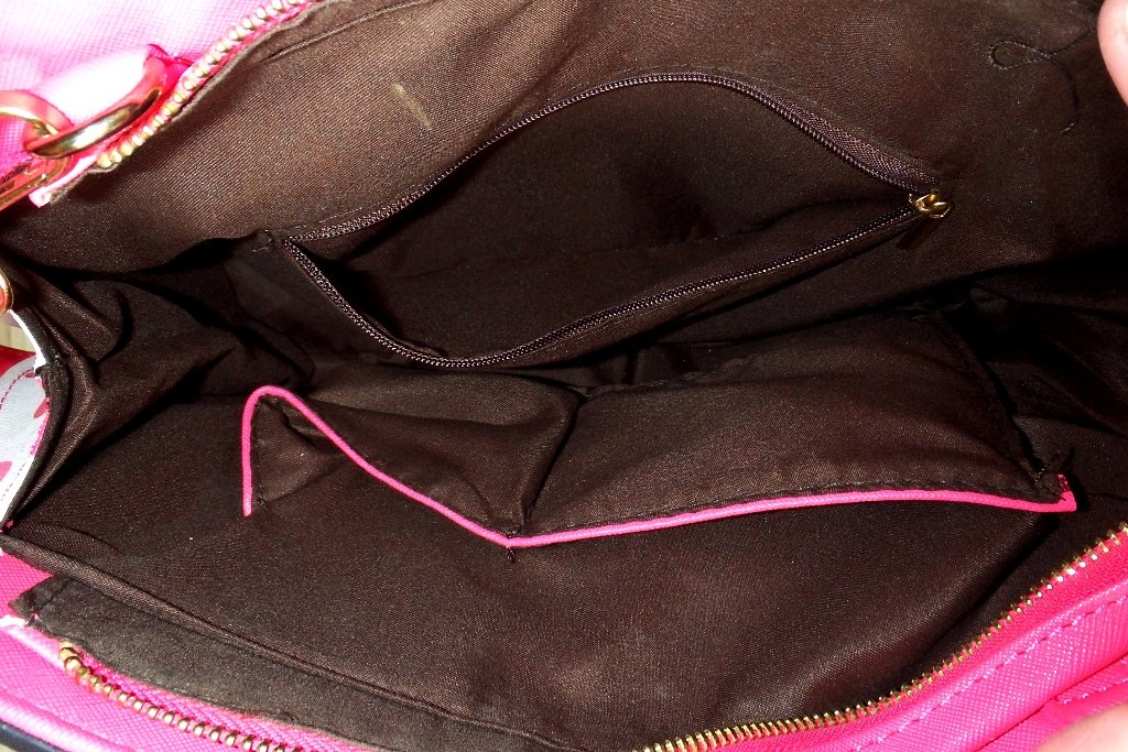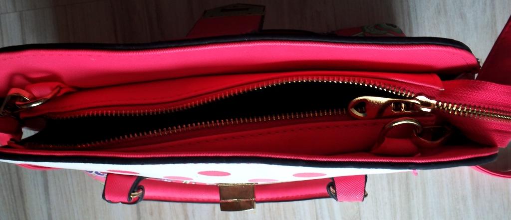 Z jednej vonkajšej strany má vrecko na zips, vo vnútri je jedna veľká časť a z boku na jednej strane je tiež vrecko na zips a z druhej strany dve otvorené vrecúška.