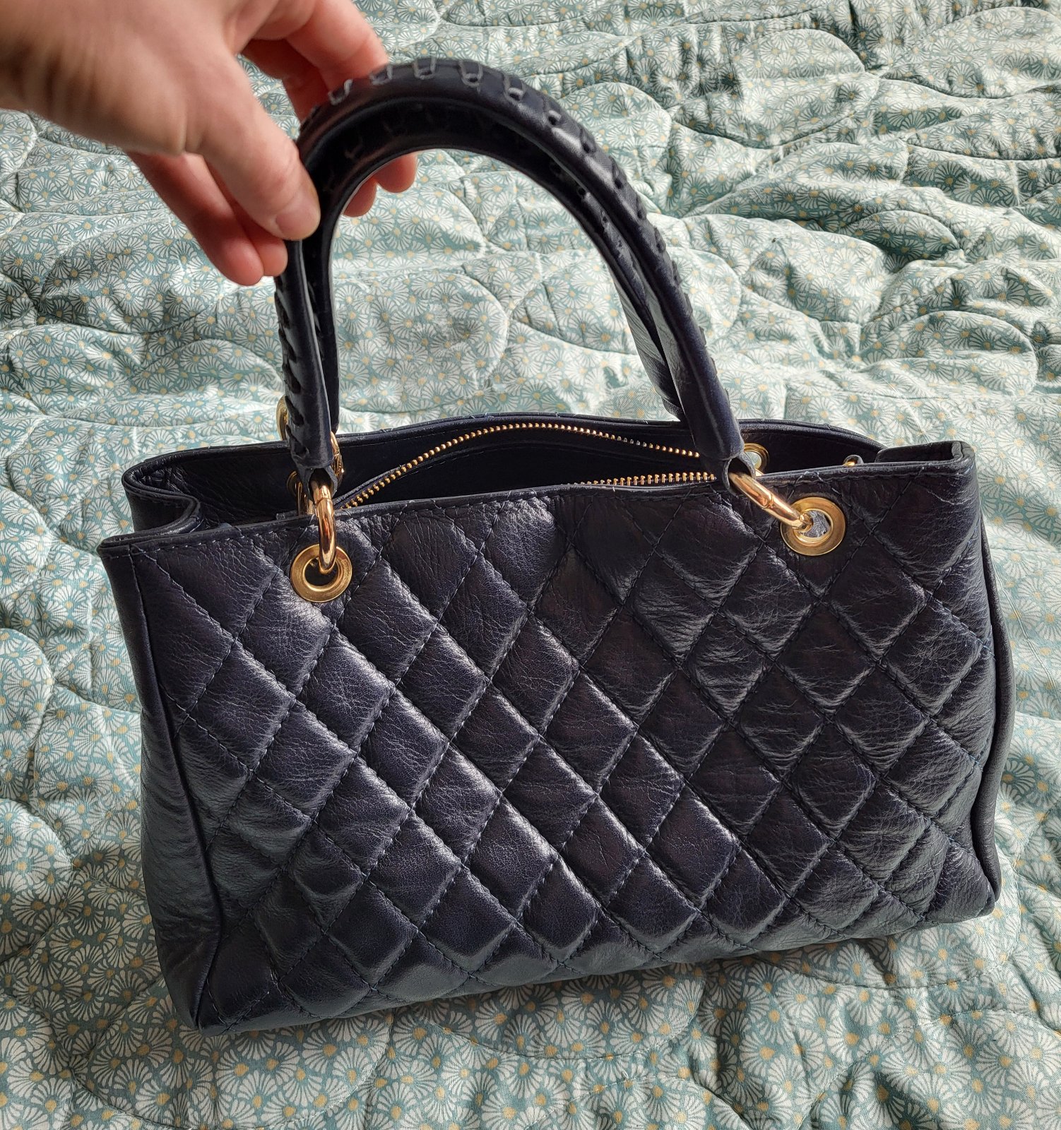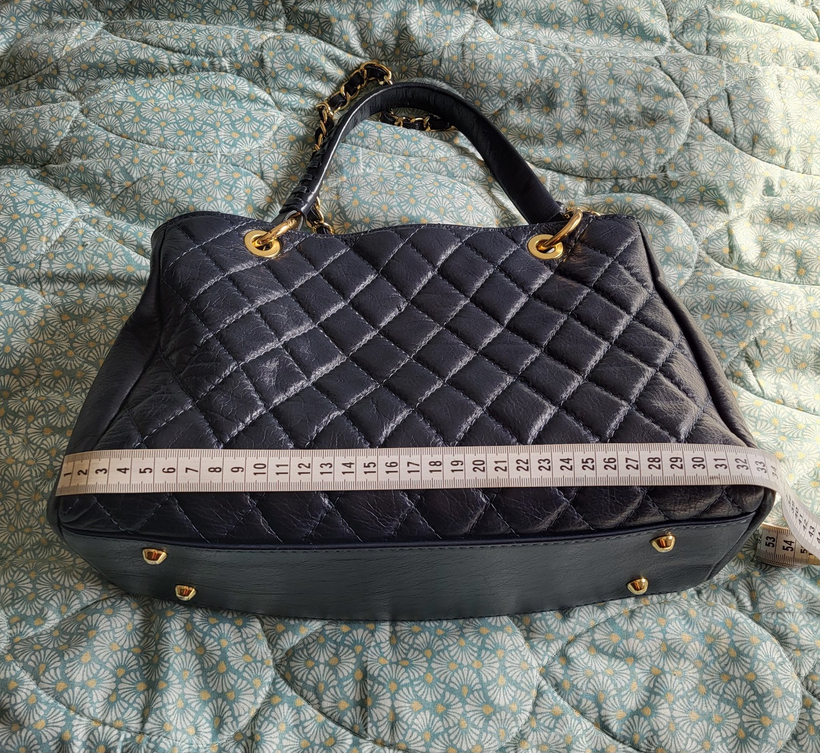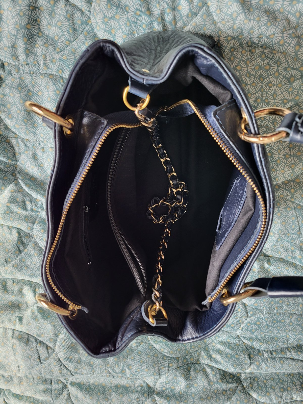 Kabelka je vybavená pevnými pletenými koženými ušami na nosenie v ruke a elegantnou zlatou reťazou na nosenie cez rameno alebo crossbody. Kovové detaily v zlatom tóne podčiarkujú luxusný vzhľad.