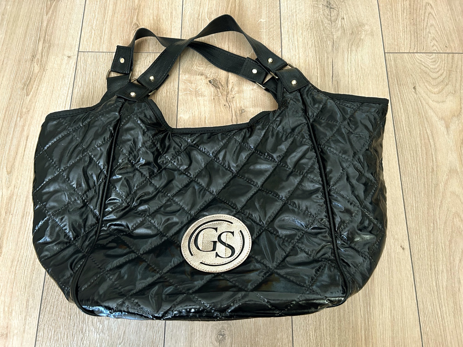 Luxusná kabelka. Kombinácia prežitej textílie a lakované ekokoze. Rozmer 37x30x14cm. Nenosené.