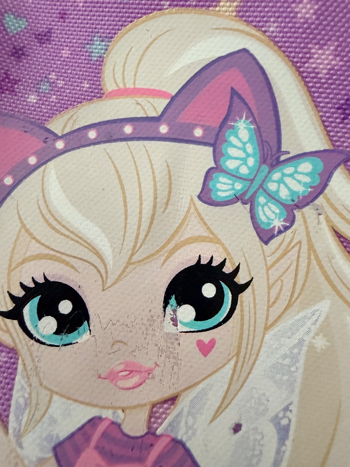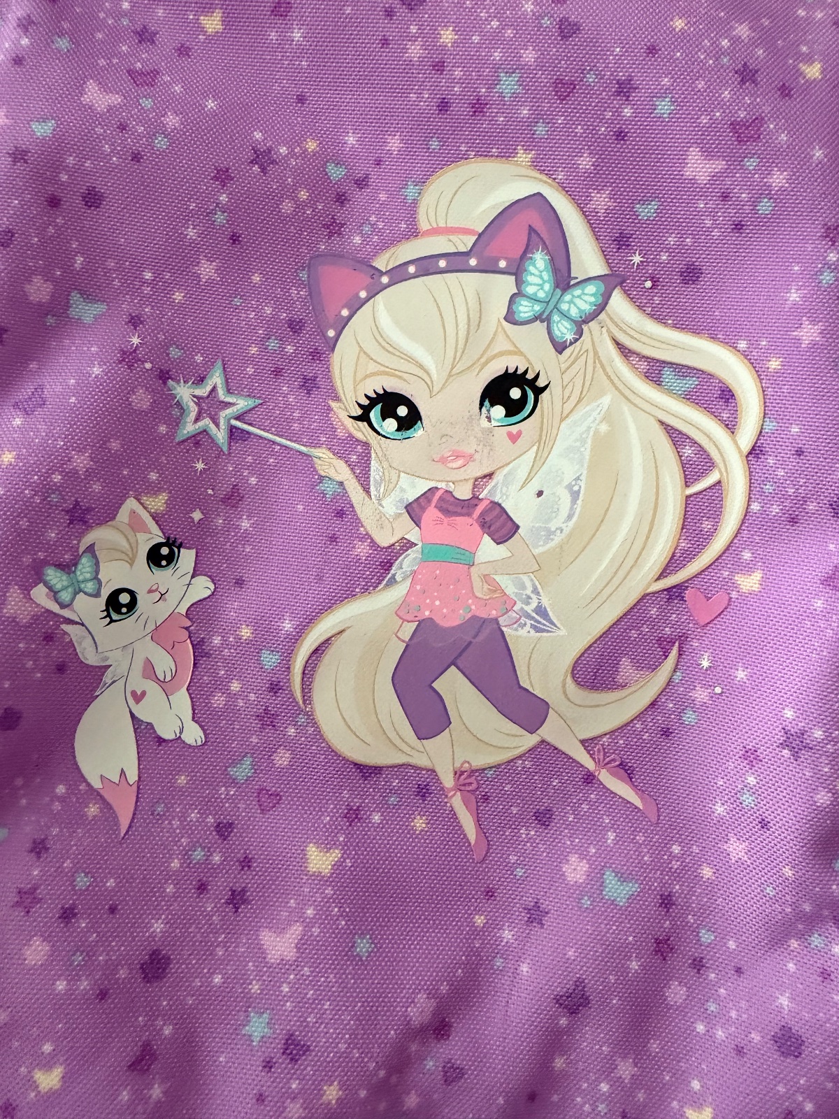 Ruksak ma krasnu vyraznu fialovu farbu, nie ke rozthany, ani flakaty. Obrazok je, ale suchnuty, vid.foto. Pri noseni to nie je moc vidiet.