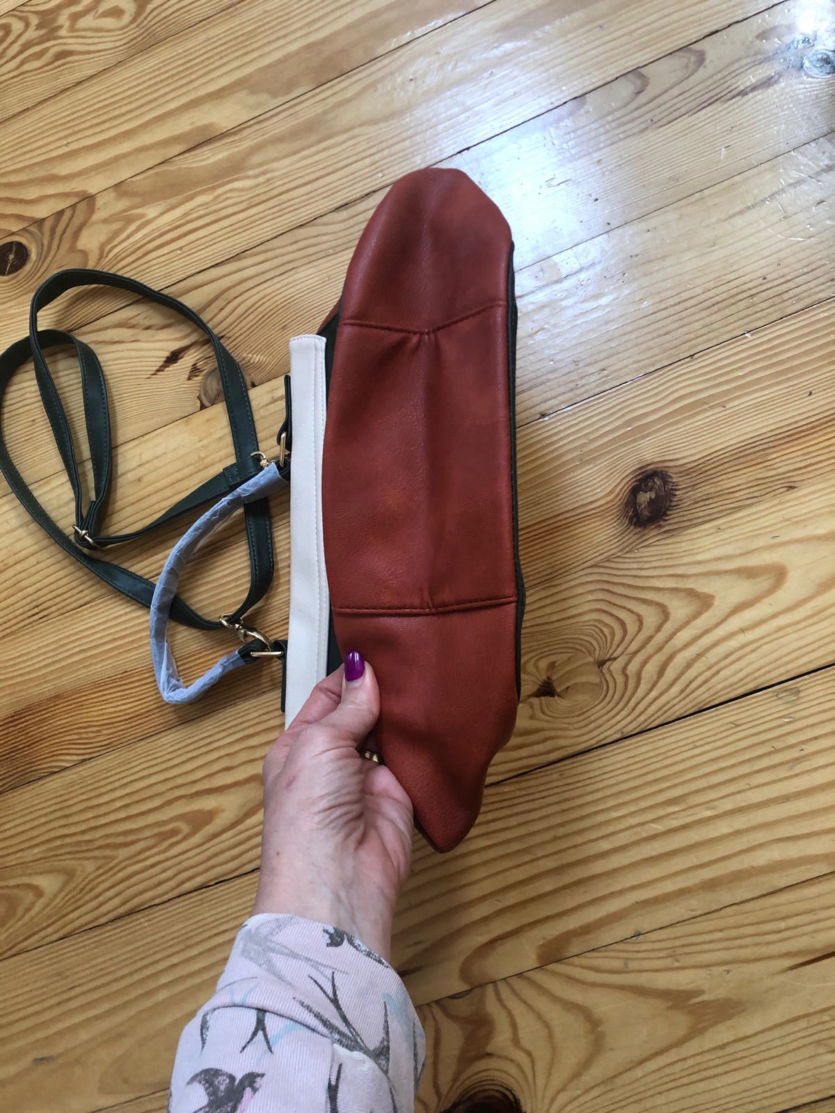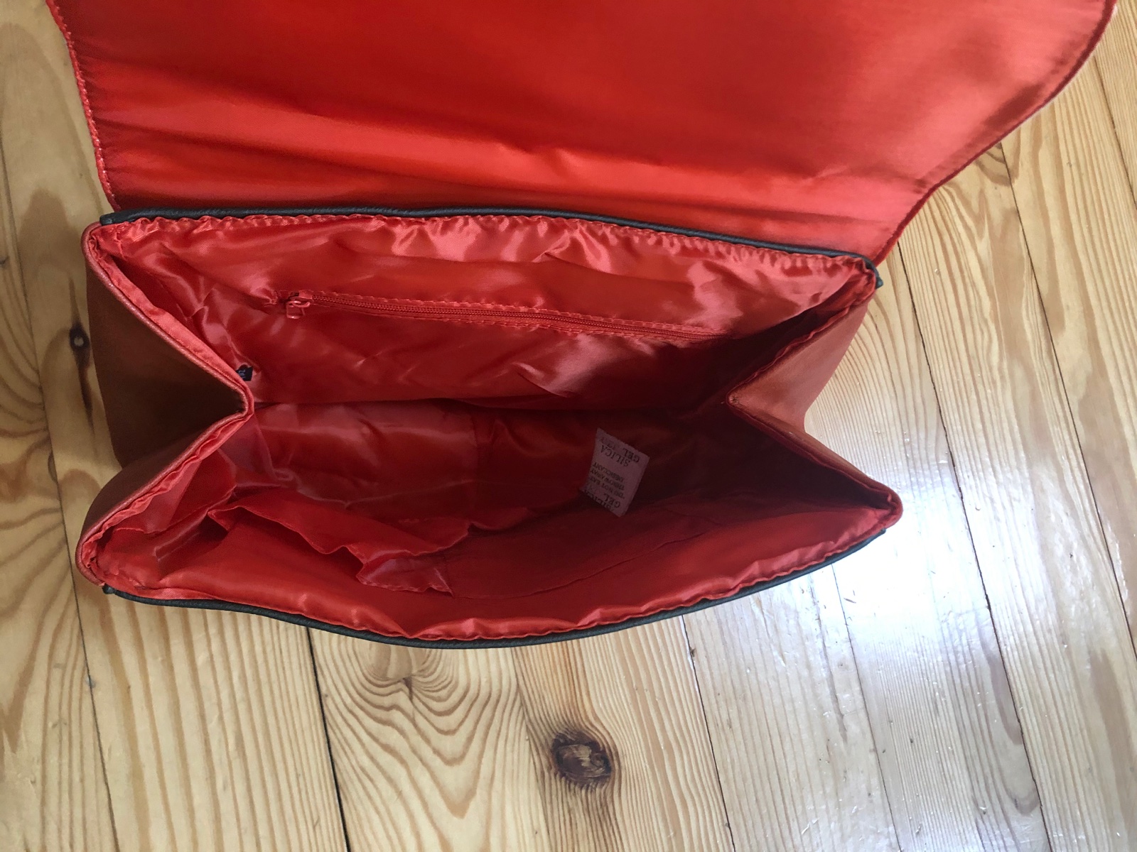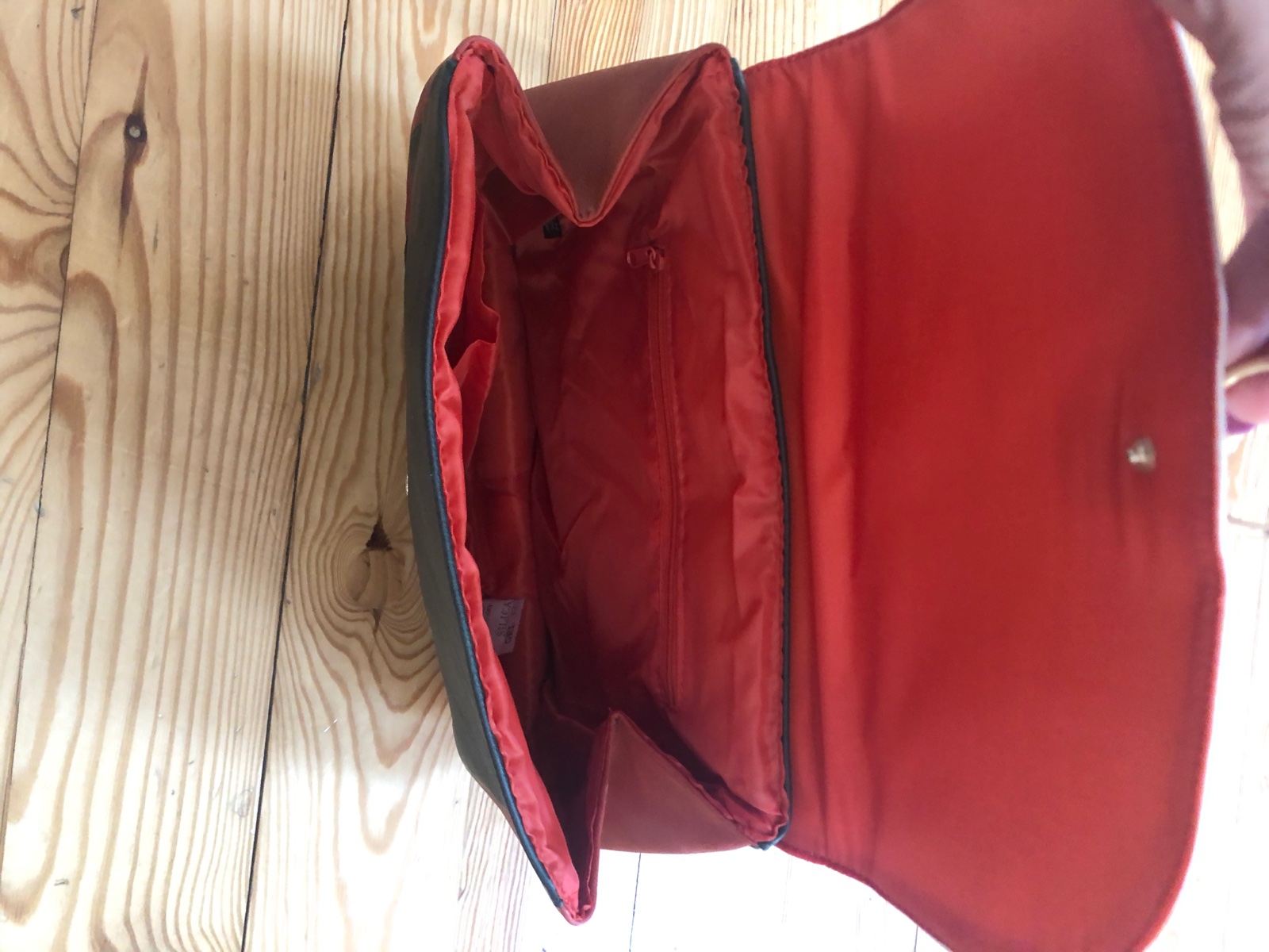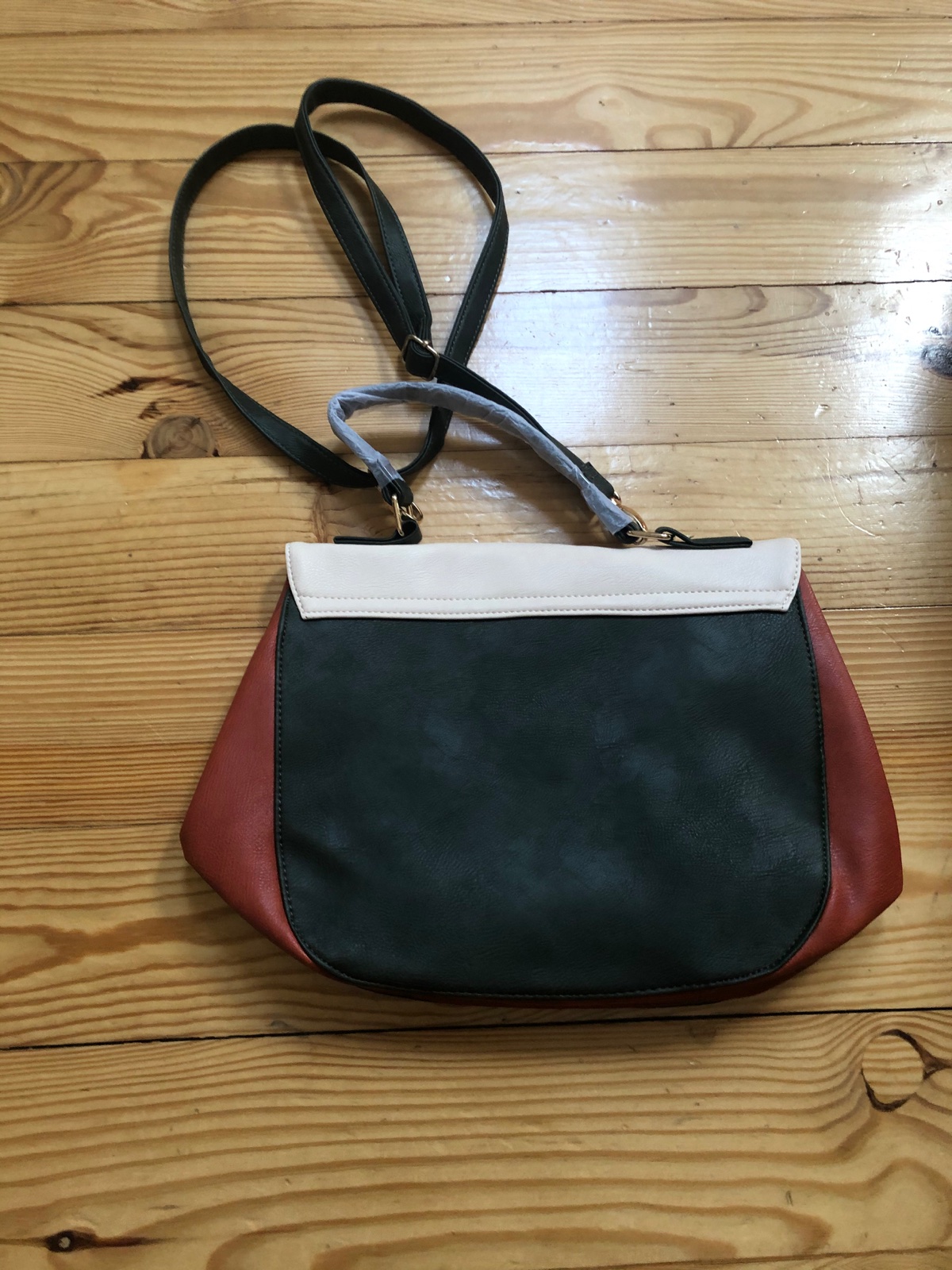 Taška s efektom farebných častí s uškami na držanie a upraviteľným remienkom cez plece. S ozdobným kruhom a 2 otvorenými vreckami a 1 na zips.