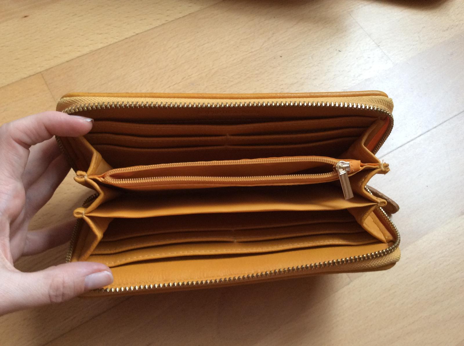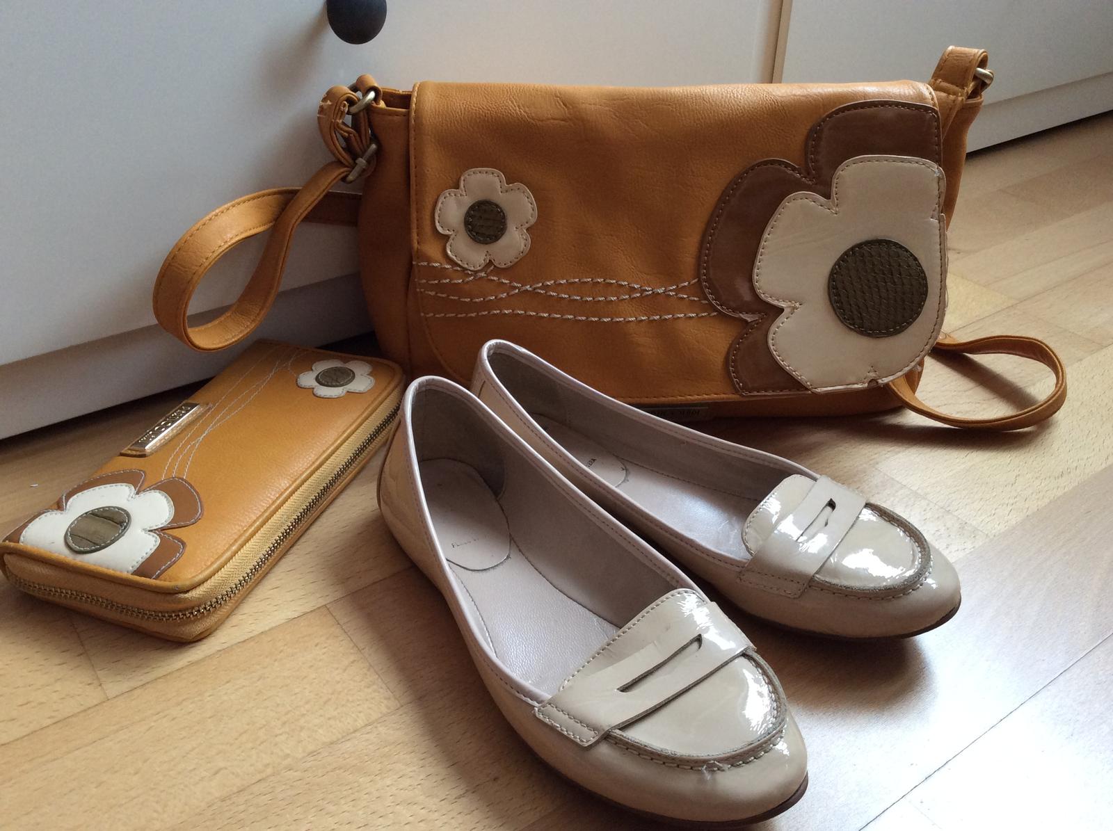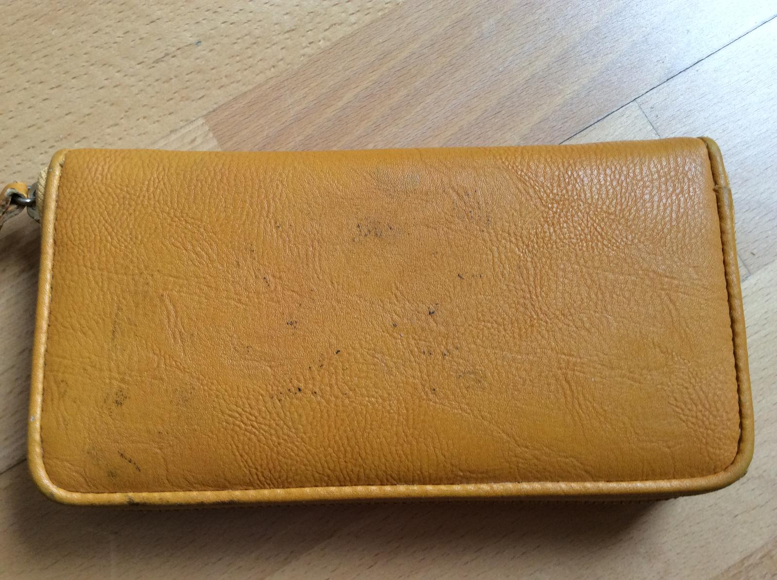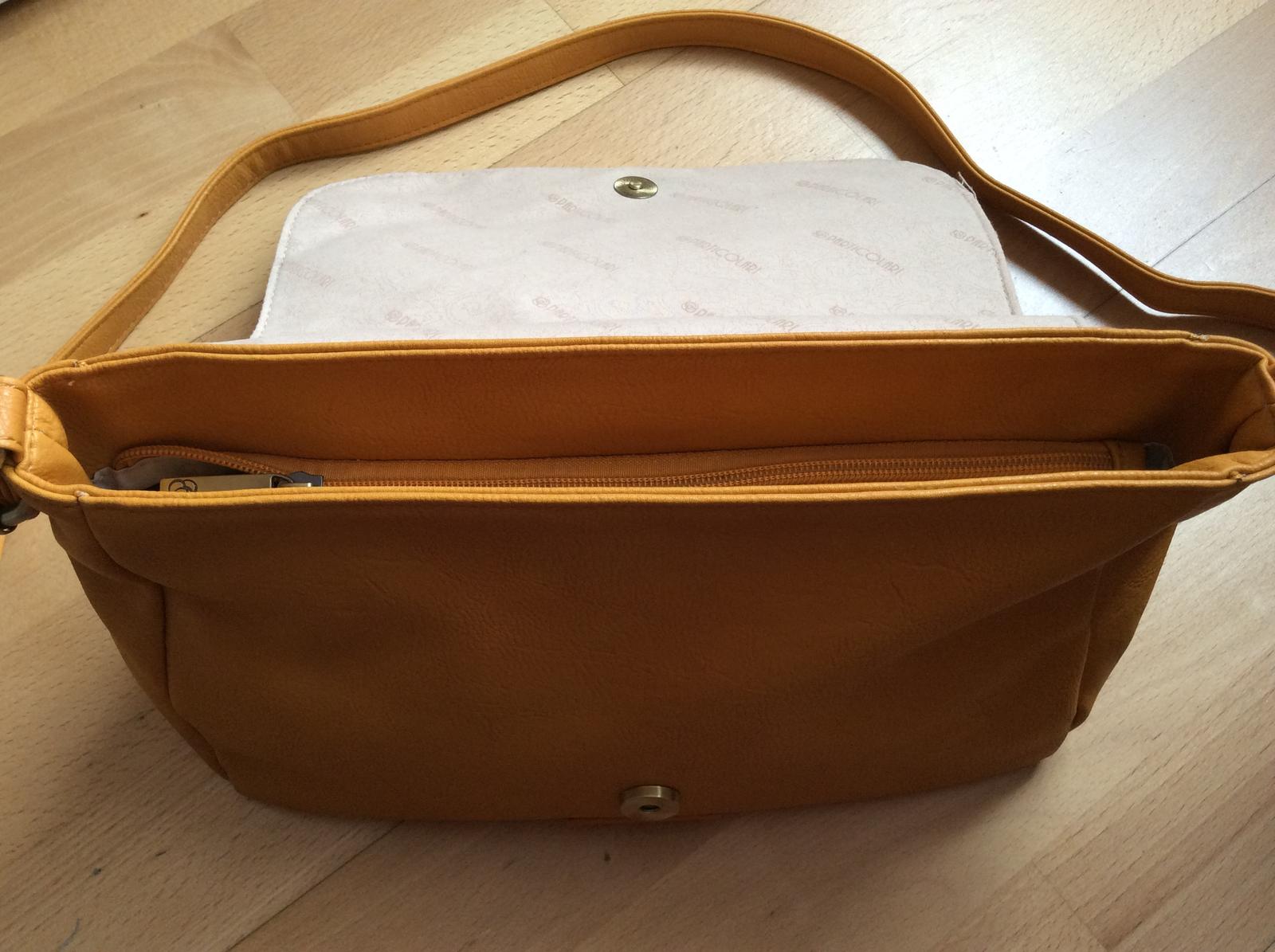 Malo nosena kabelka spolu s peňaženkou okrovo-horčicovej farby. Peňaženku som používala viac, na zadnej strane su čierne bodky, neskusala som odstraňovať. Taška je vo velmi dobrom stave, nie je to ale koža, kupovane v Taliansku, cena a predaj len spolu