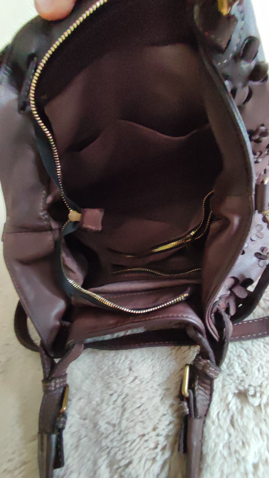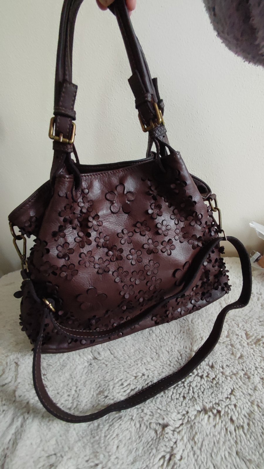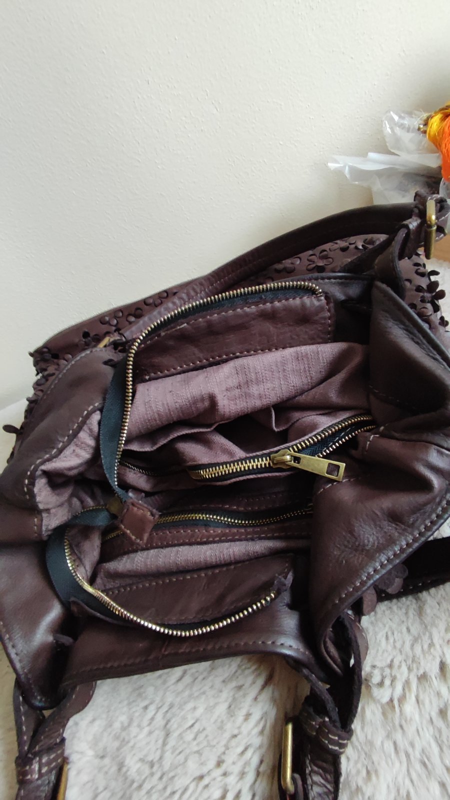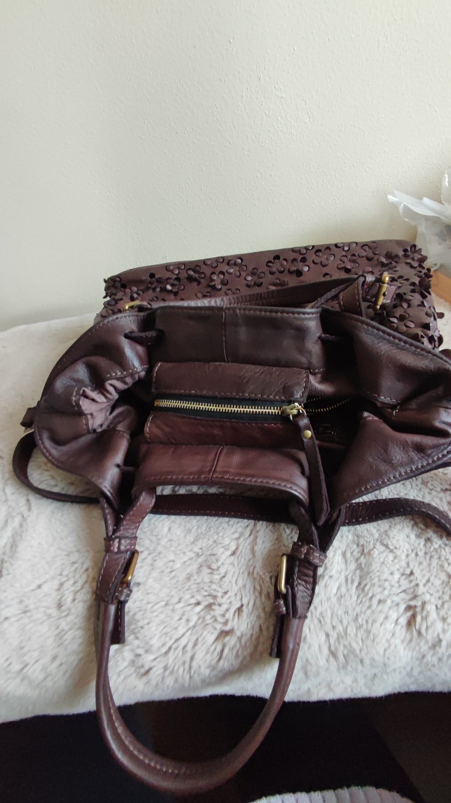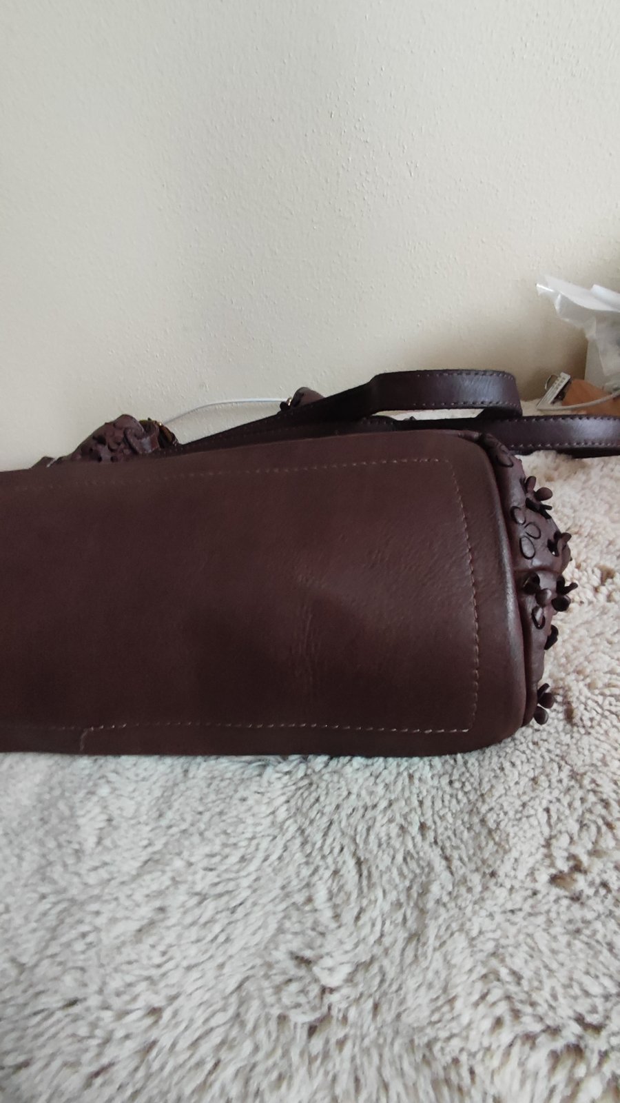 Ponúkam krásnu kabelku, použitá pár krát na striedačku kvalitná koža,spodok ako nový aj vnútro stredné veľká a priestranná.....Pc,165.... krásna čokoládová farba...Genuine Heather Italy