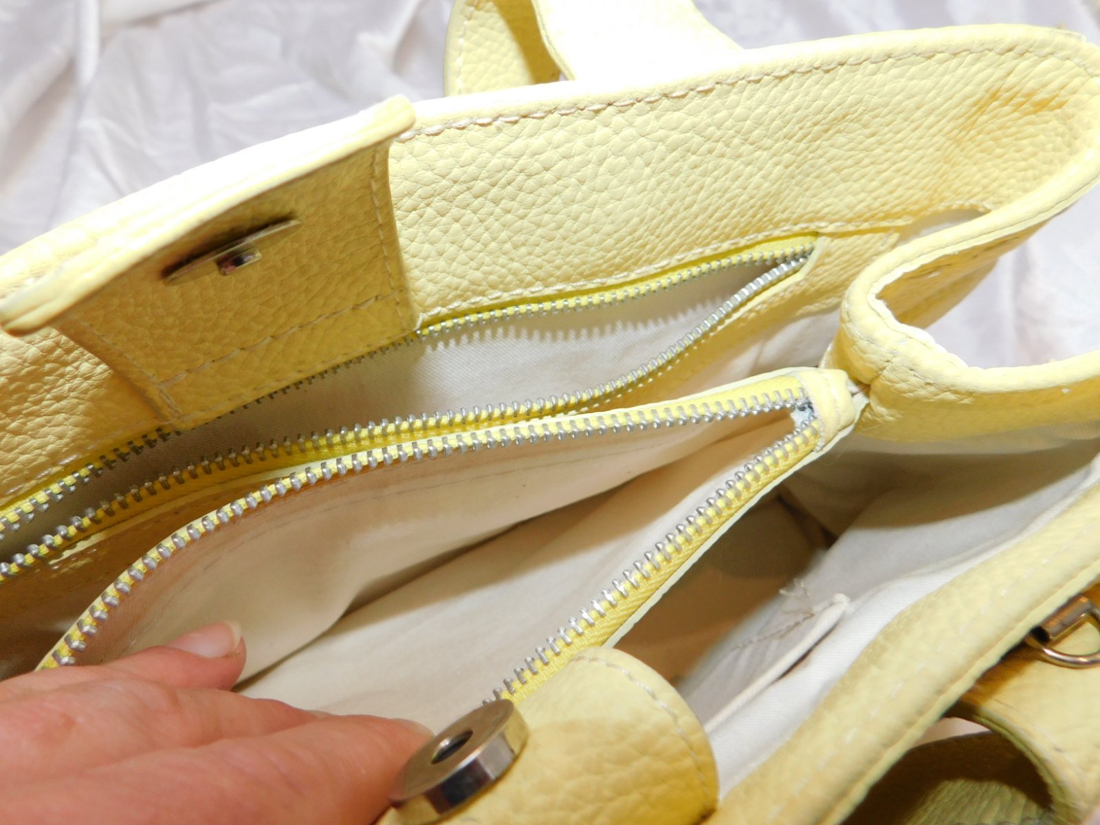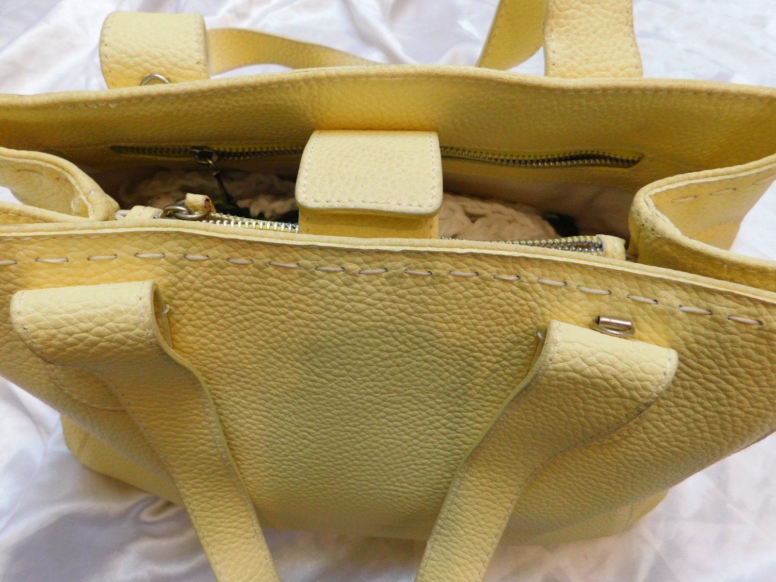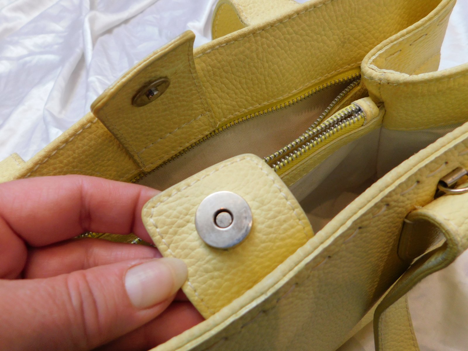 O bag štandard žltej farby. Na vnútornej taške fľak, pri nosení nevidno, keďže je vo vnútri. Predám aj samostatne: Telo 15 Vnútro 5