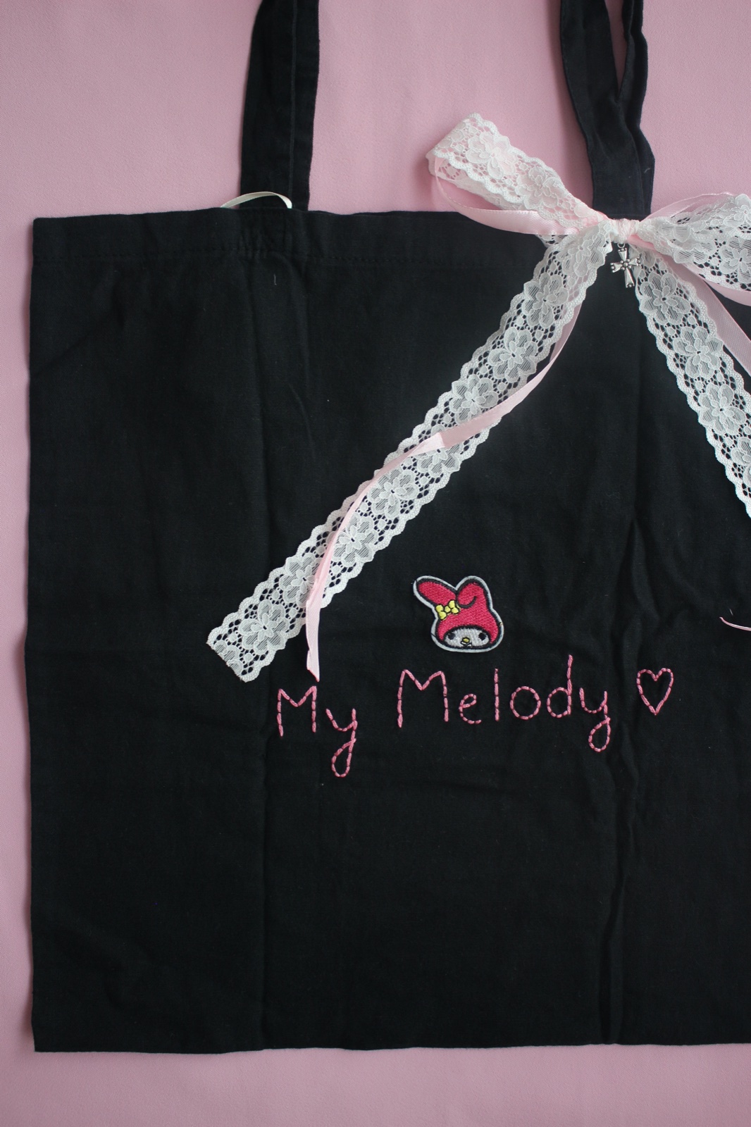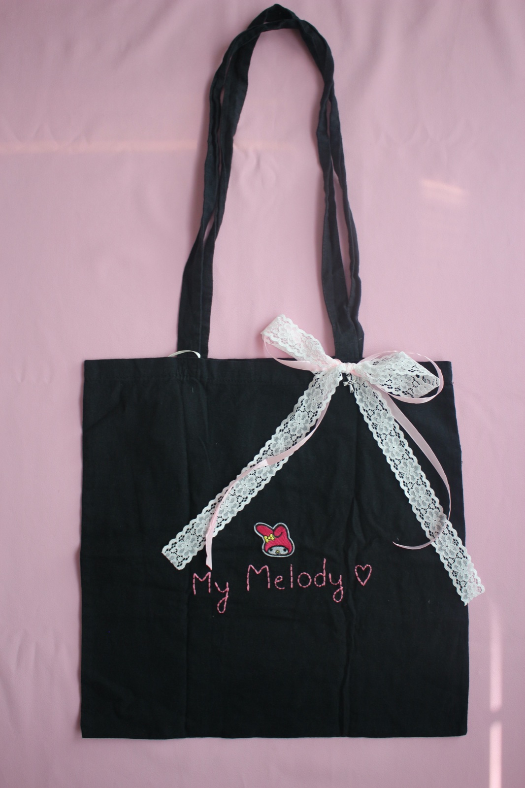 Táto čierna plátenná taška bola upcyklovaná do štýlu Sanrio x Coquette x Cottagecore – ideálna pre všetkých fanúšikov My Melody, kawaii estetiky a jemne temného dievčenského štýlu.