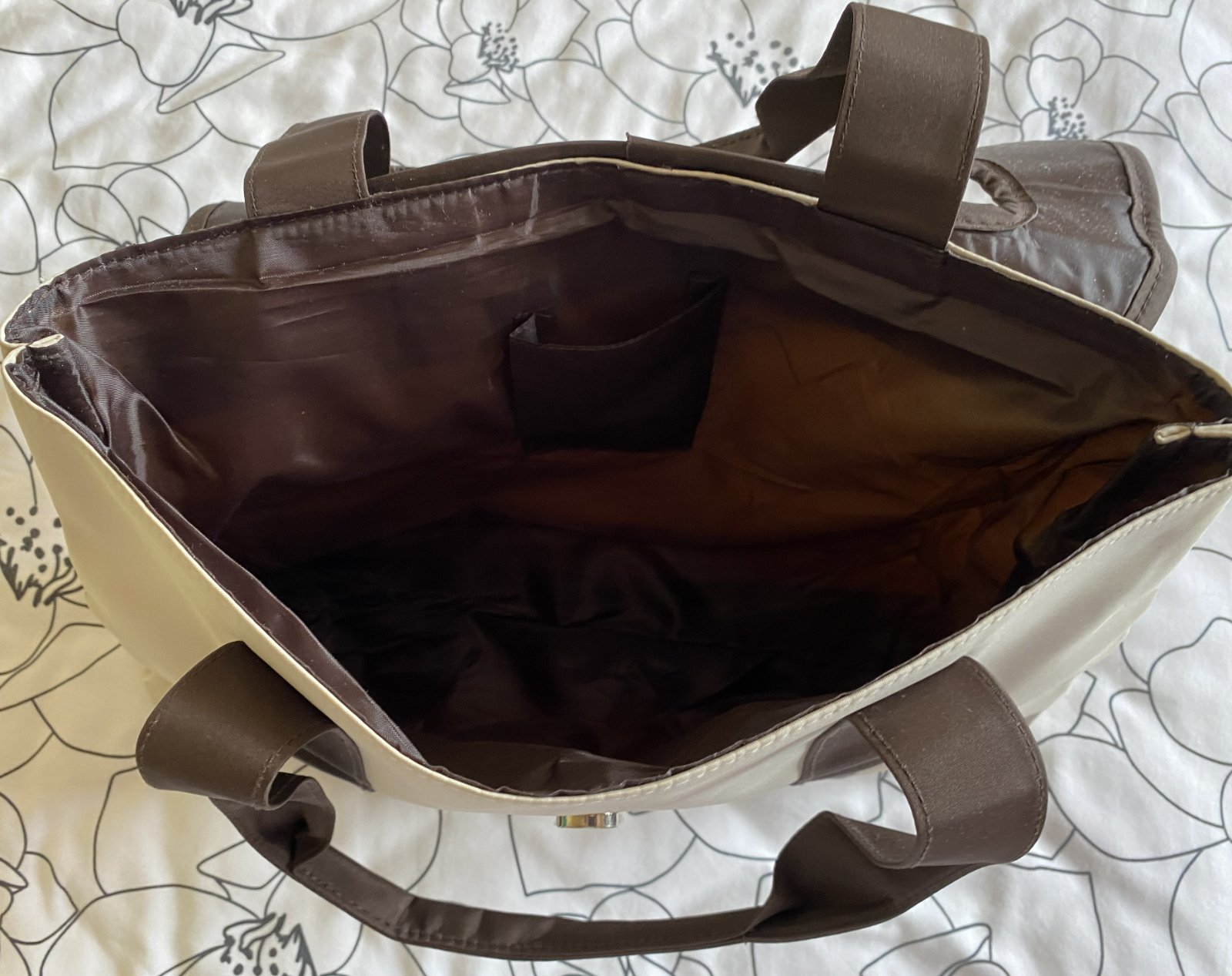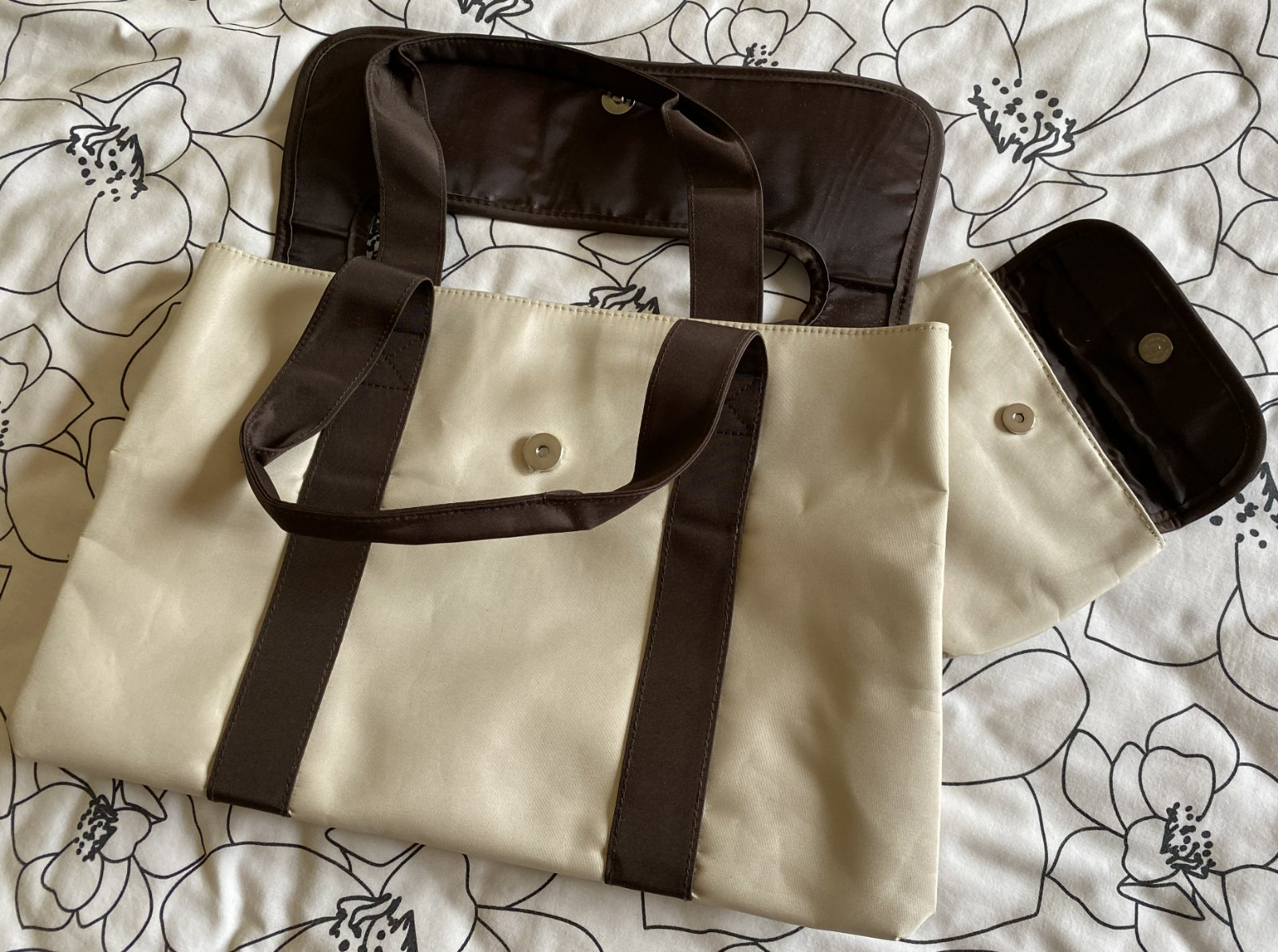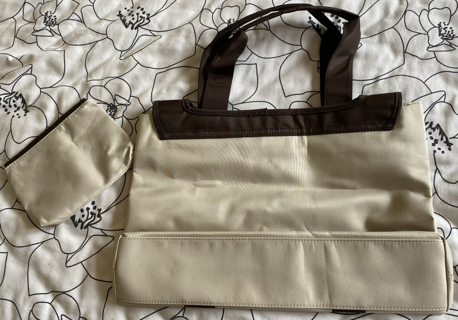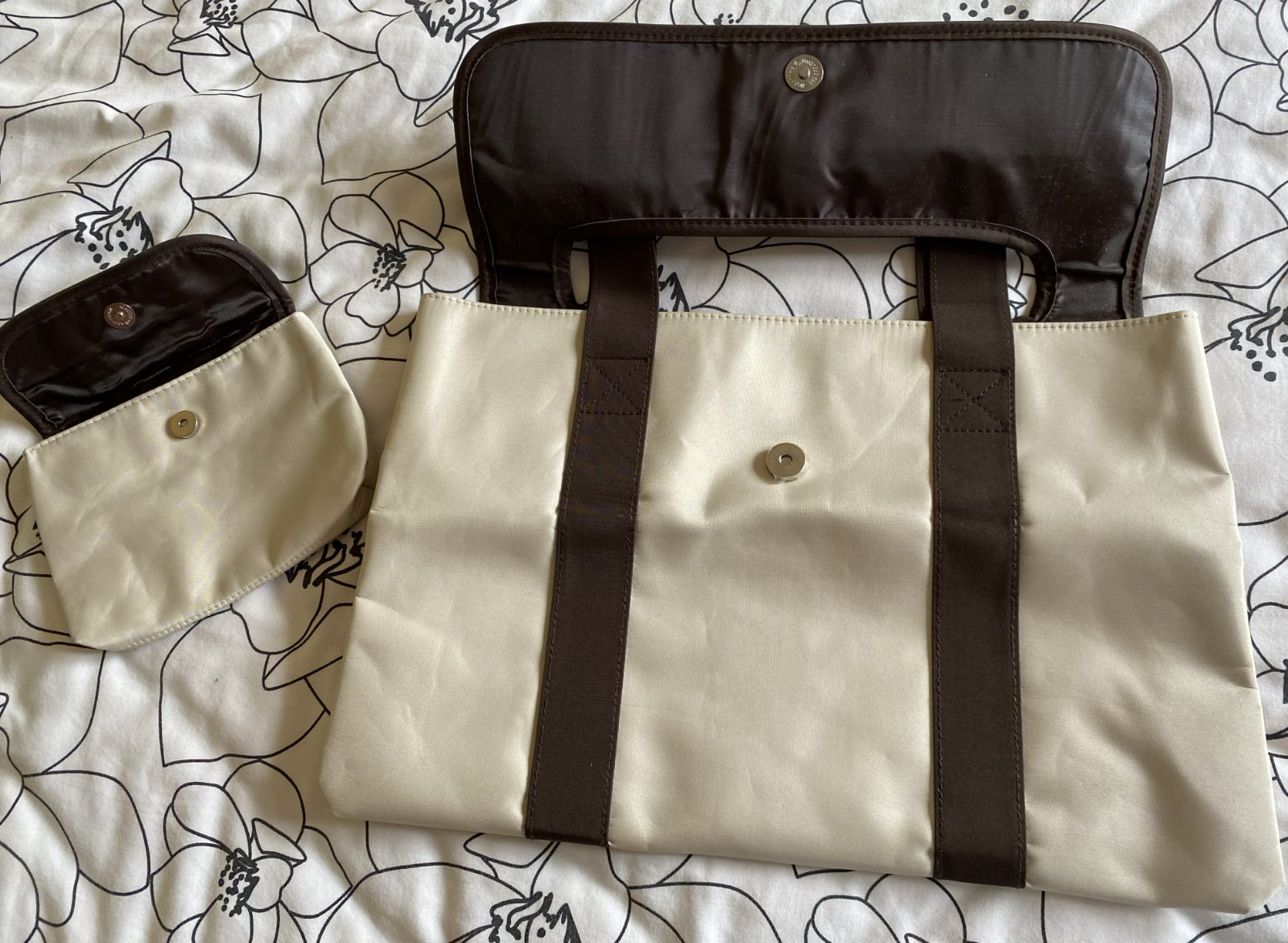 Kabelka do ruky + taštička, kombinácia farieb béžová + tmavohnedá, vrchný materiál nepremokavý, umývateľný, z vnútornej strany tmavohnedá lesklá podšívka - kabelka má vo vnútri malé vrecko, obe zapínanie na cvok, v top stave. Miery kabelka: šírka:40cm, výška: 26cm, spodná časť: 39cmx7.5cm. Miery taštička: šírka: 17cm, výška:13cm.