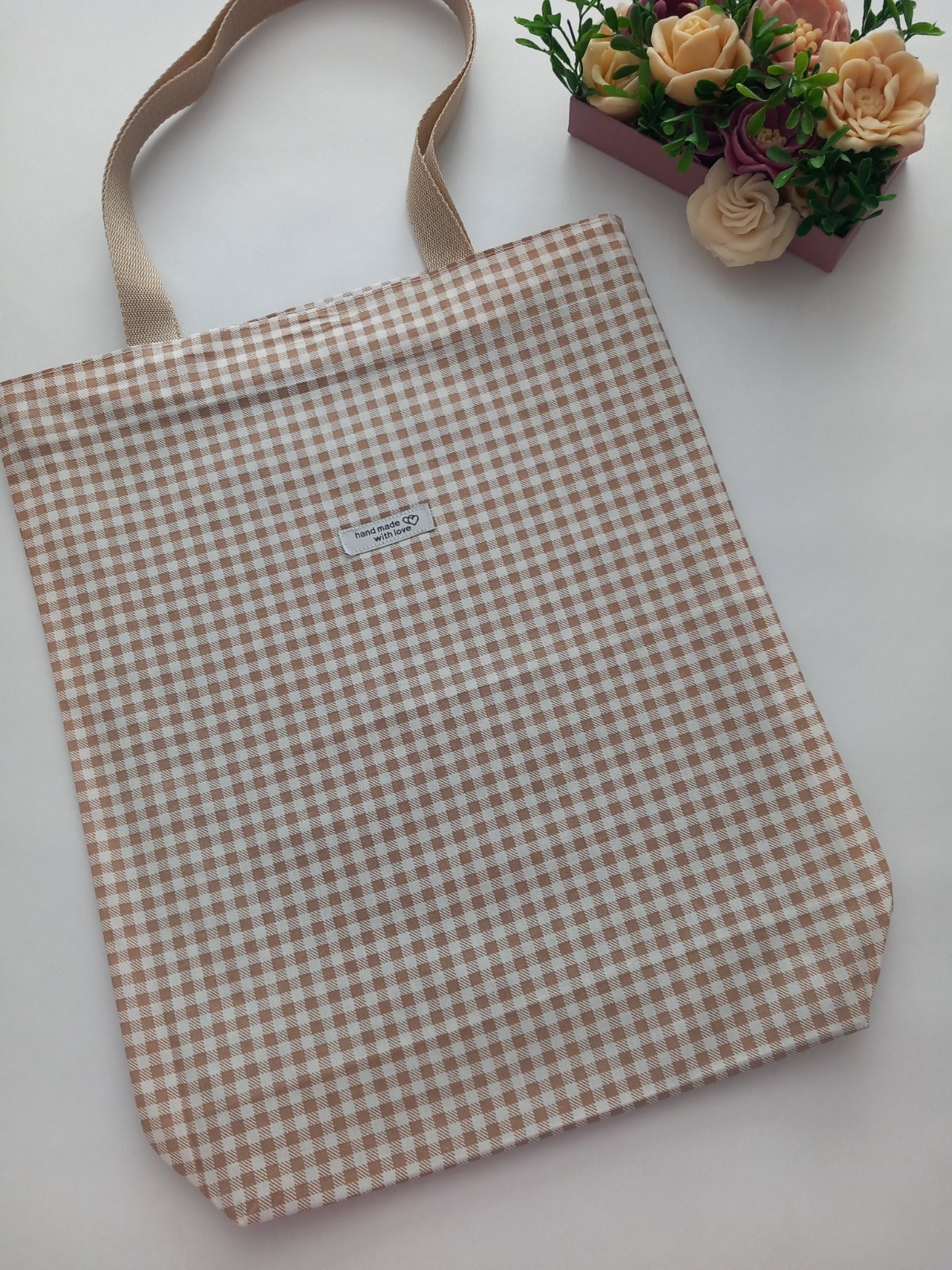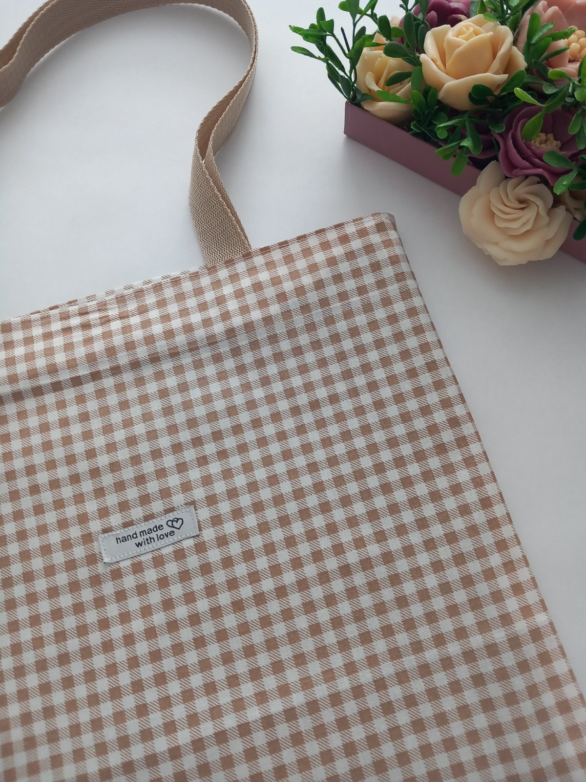 Dámska taška bežovej farby so vzorom kocky je ušitá z kvalitnej 100 % bavlny ,taška má vo vnútri aj jedno vrecko .Popruhy sú na rameno ,ale dá sa nosiť aj v ruke .
