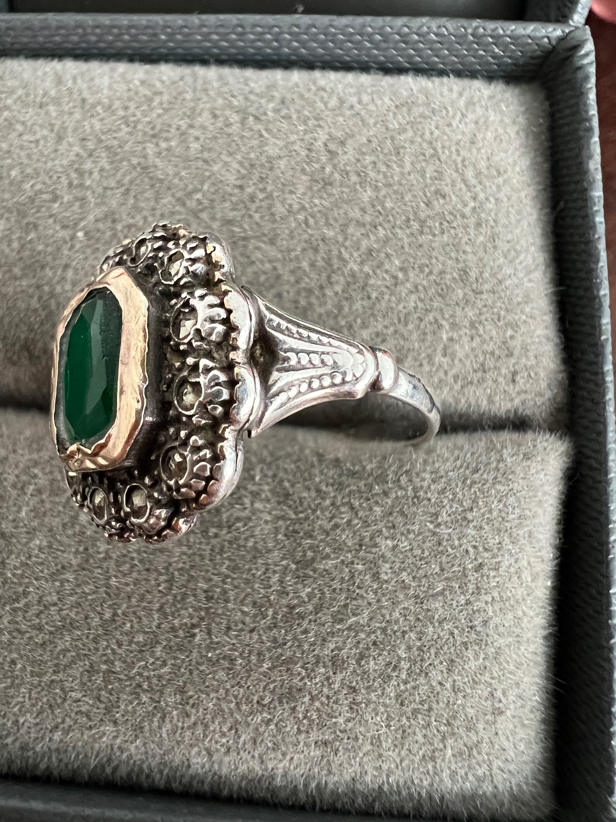 Strieborny prsten zo Spanielska, ma okolo 80 rokov , je rucne vyrobeny sperkarom zo Spanielska. Je zo striebra a okolo zeleneho kameña smaragdu je zlato, ktore sa nachadza taktiez okolo drobnych kamienkov markazitov. Je vo vybornom stave.