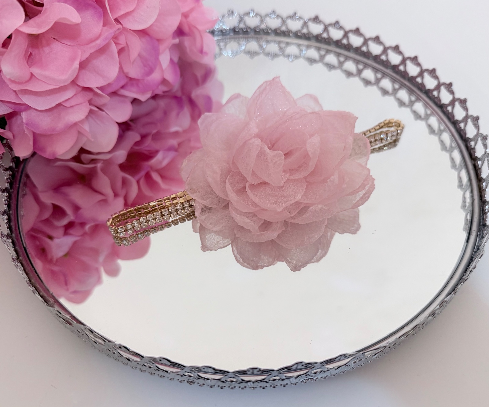 Nádherný choker náhrdelník v romantickom štýle s výrazným púdrovo ružovým textilným kvetom.