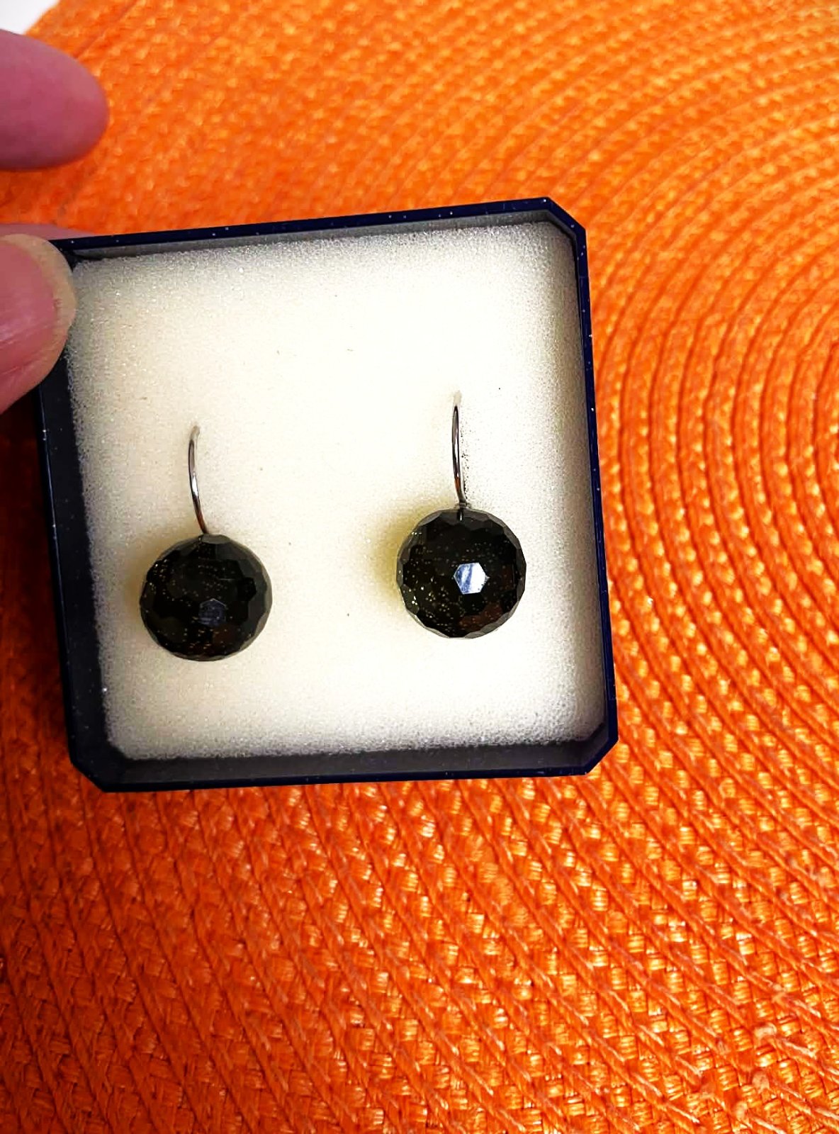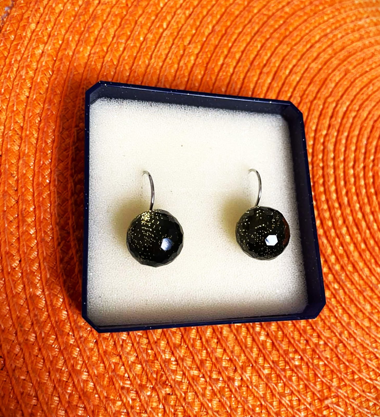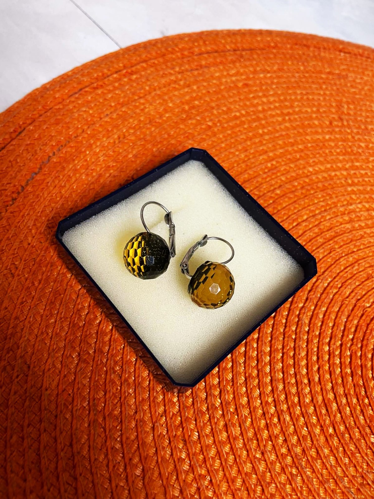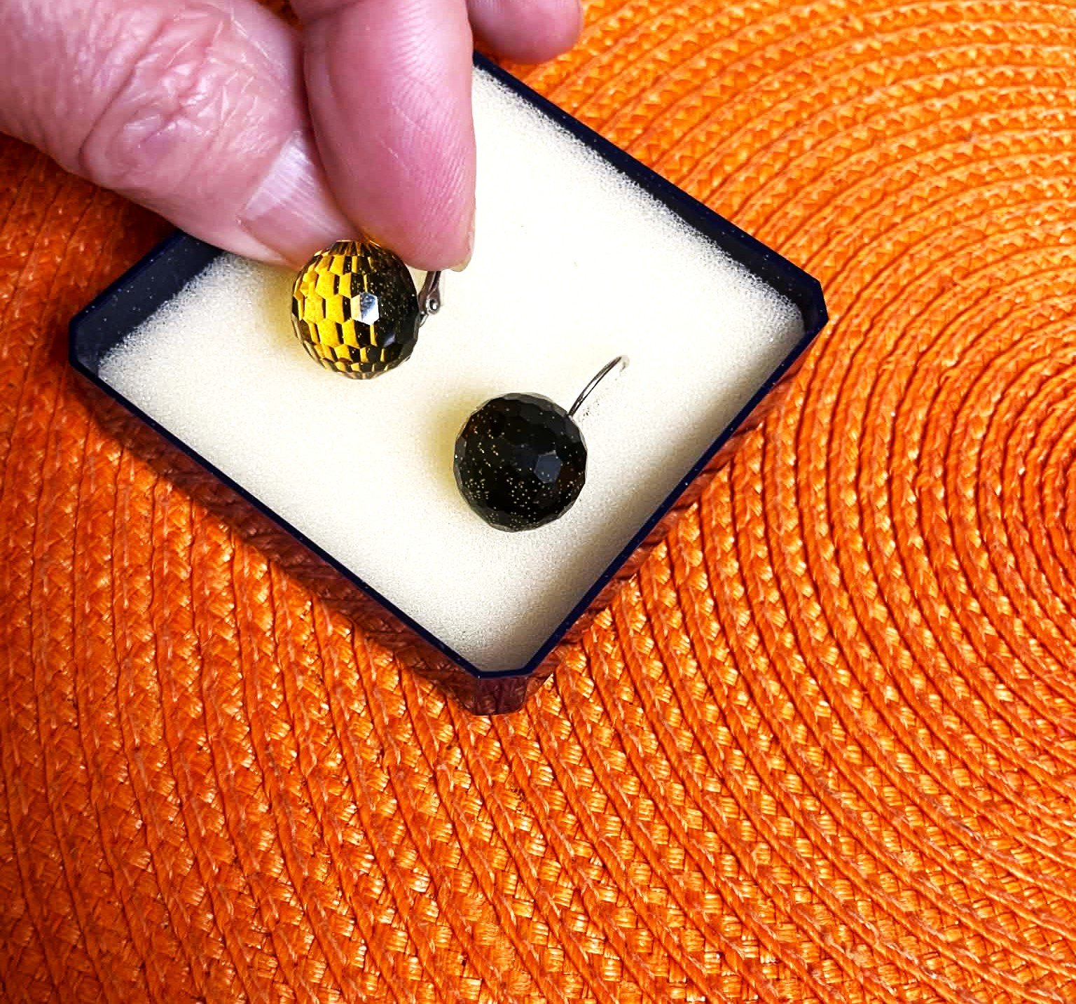 krásne náušnice zo "skla" s výrazným fazetovaným výbrusom, ktorý maximalizuje lesk a odraz svetla,farba sa mení - javí sa v jasnej žltej (jantárovej) farbe/ čiernej farbe.