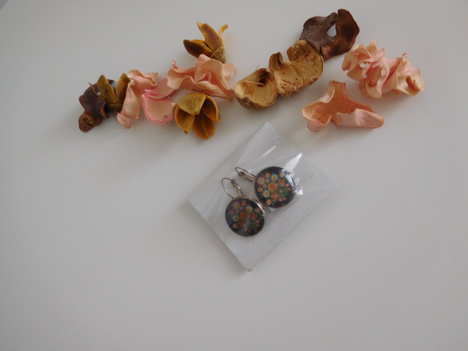 Handmade náušnice vyrobené z čiernych a zlatých kamienkov, nalepené na zlatom podklade, zapínanie je napichovacie s klapkou