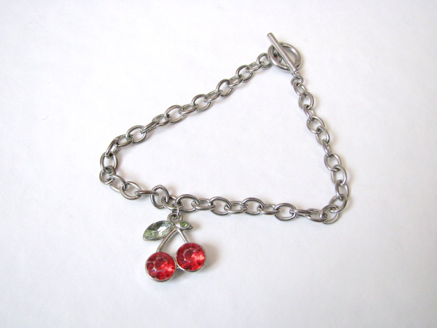 Náramok - retiazka - striebornej či platinovej farby, s malým príveskom s čerešňami. Čerešničky majú vlepené akrylové štrasové kamienky - na tých červených už vidno ošúchanie. Inak bez poškodení.