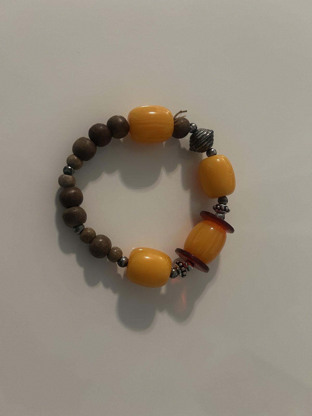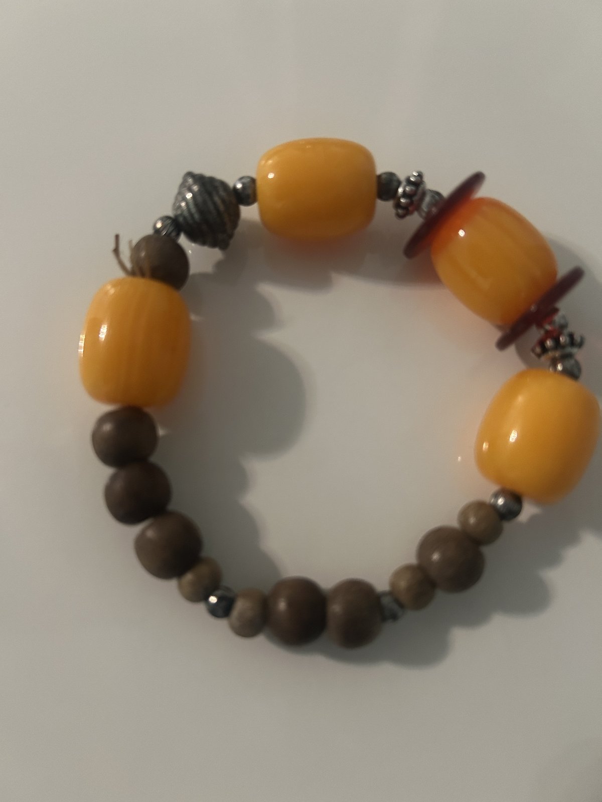 Náramok s drevenými , kovovými a oranžovými koralkami- na gumičku