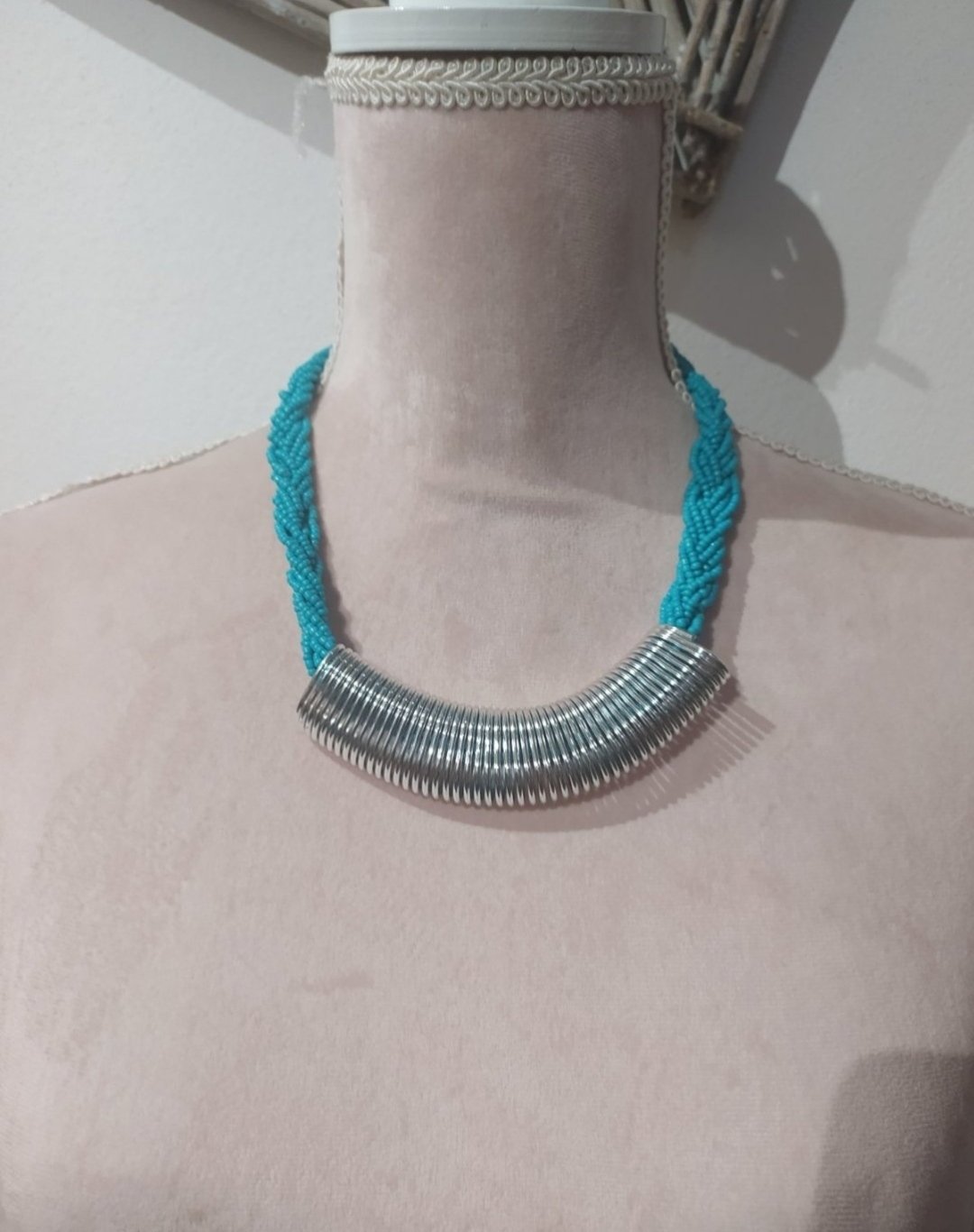 Handmade náhrdelník na bielej taftovej stuhe v azúrovo-bielych farbách. Lesk mu dodávajú korálky so strieborným prieťahom. Náhrdelník pôsobí masívne a jemne zároveň vďaka použitiu hladkej stuhy na...