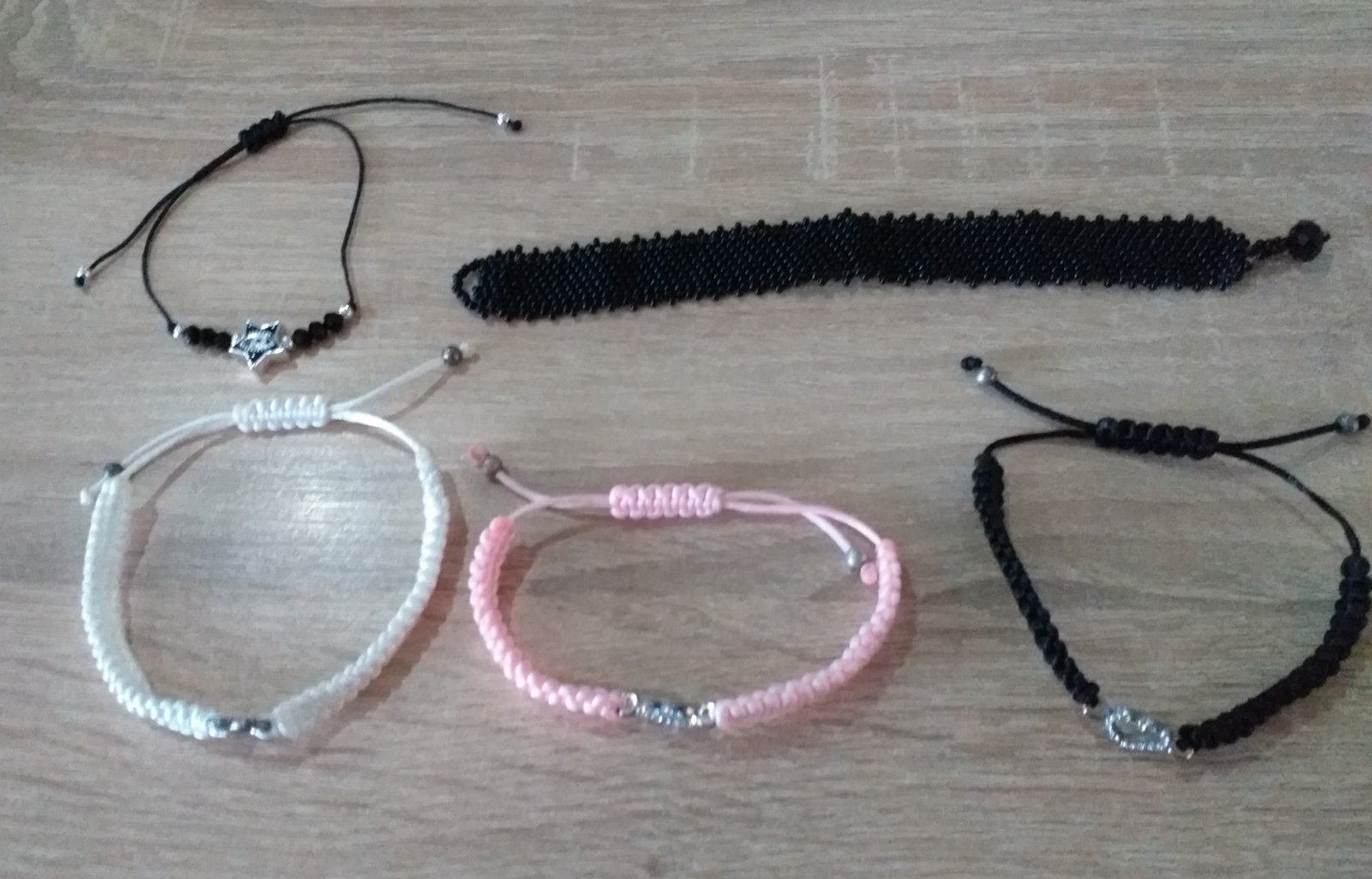 Všetky náramky nové, nenosené, handmade náramok z drobných korálok, šírka 1.5cm, celková dĺžka 15+2 cm. Cena 7 eur. Náramok z Grécka, nastaviteľný obvod, max. 26 cm, cena 3 eur. Pletené náramky, biely 15- 24cm, ružový a čierny 13-22 cm, cena 5 eur za jeden.