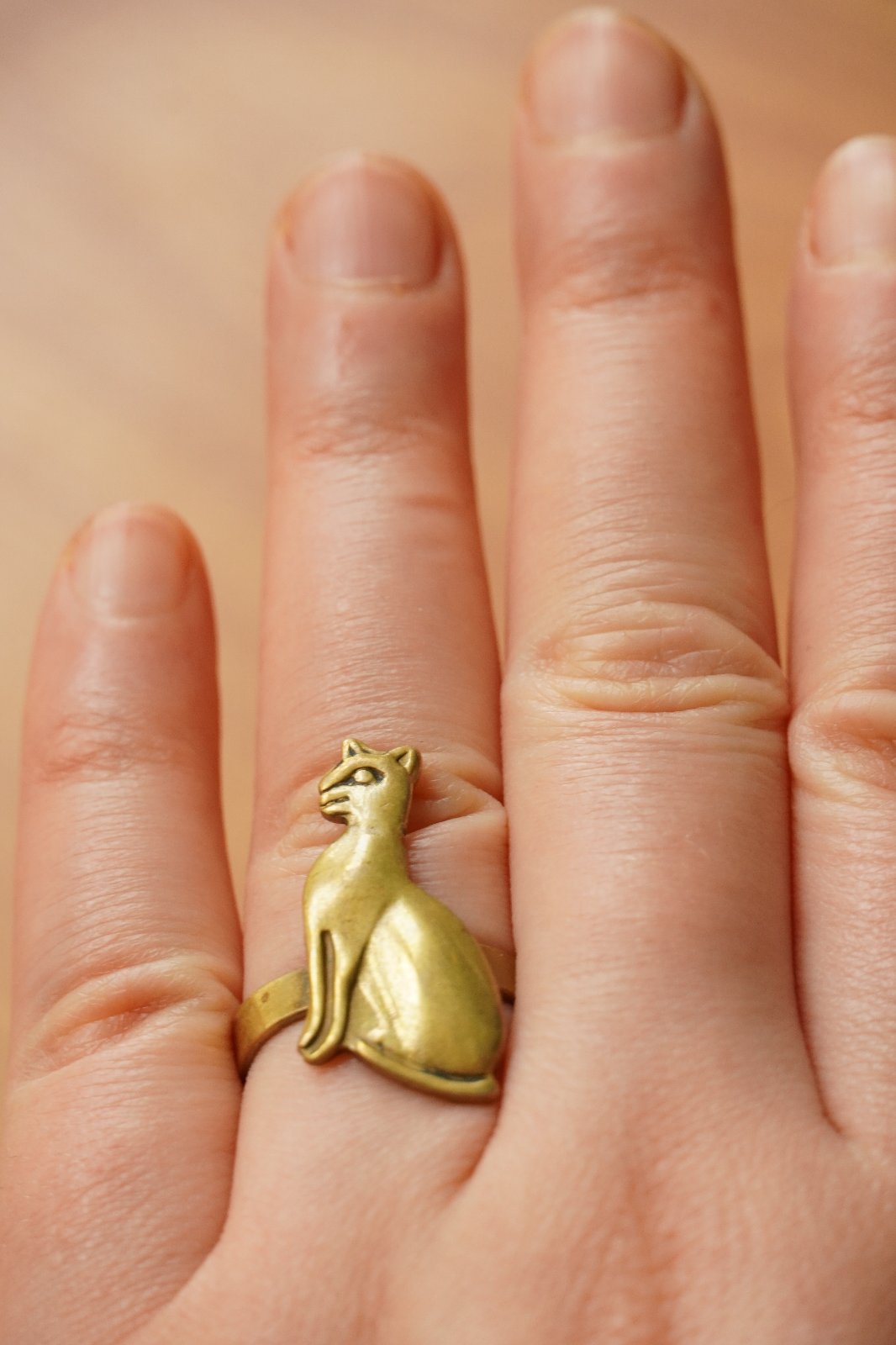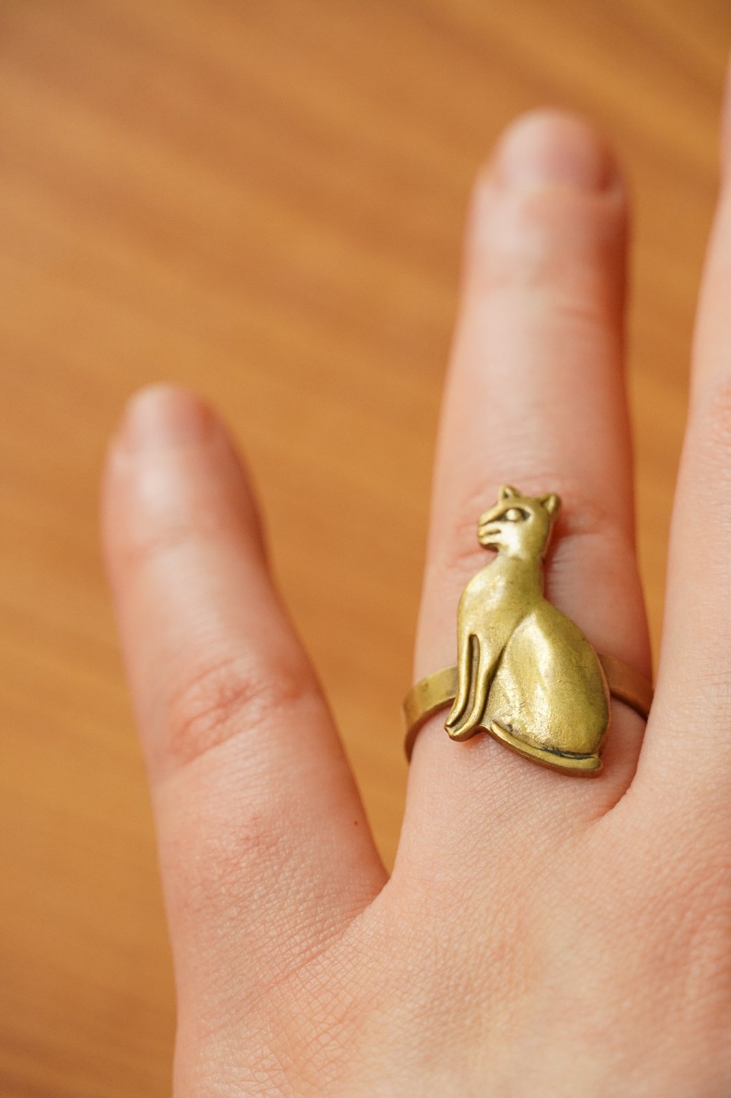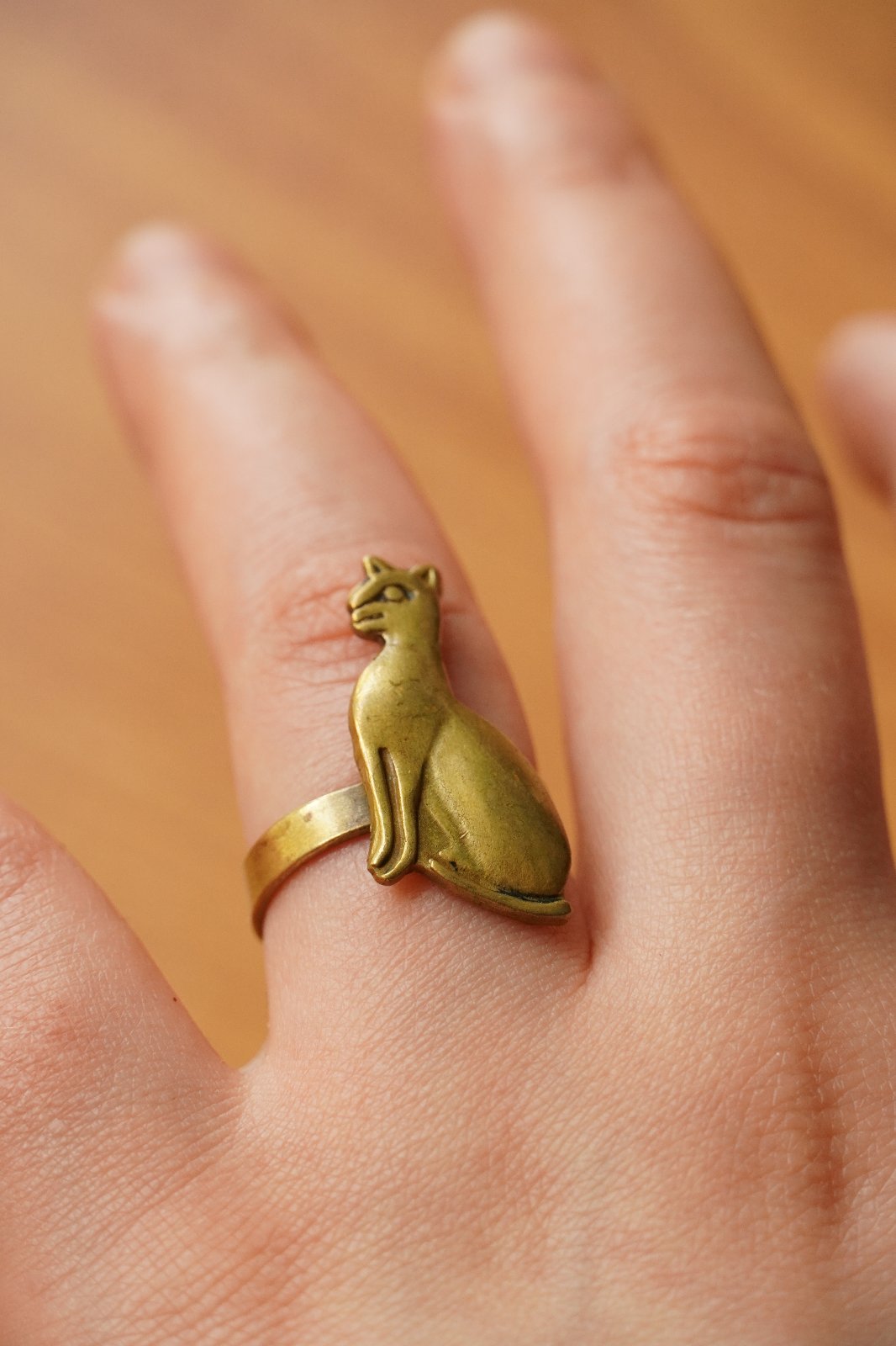 Pekný prsteň so staroegyptskom mačkou Bastet v zlatej farbe. Nastaviteľný obvod, najmenej však 5,8 cm. Keďže je nastaviteľný, pasuje mi na všetky prsty okrem malíčka.