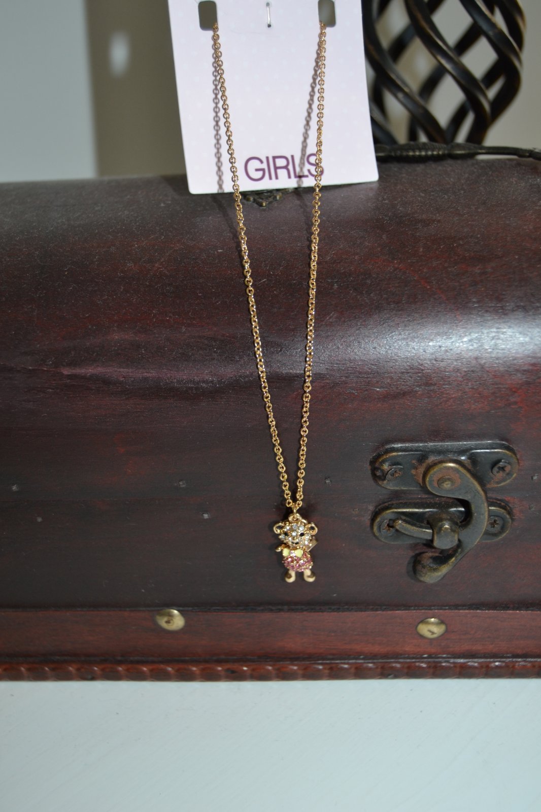 Zlatý roztomilý náhrdelník s príveskom Macko je bižutéria, zlatej farby, macko je vykladaný malými bielymi a ružovými zirkónmi. Krásny štýlový dizajn vhodný na každú príležitosť pre veľké aj malé dievčatá. Dĺžka náhrdelníka je 40-45 cm. Šírka prívesku je 0,9 cm.