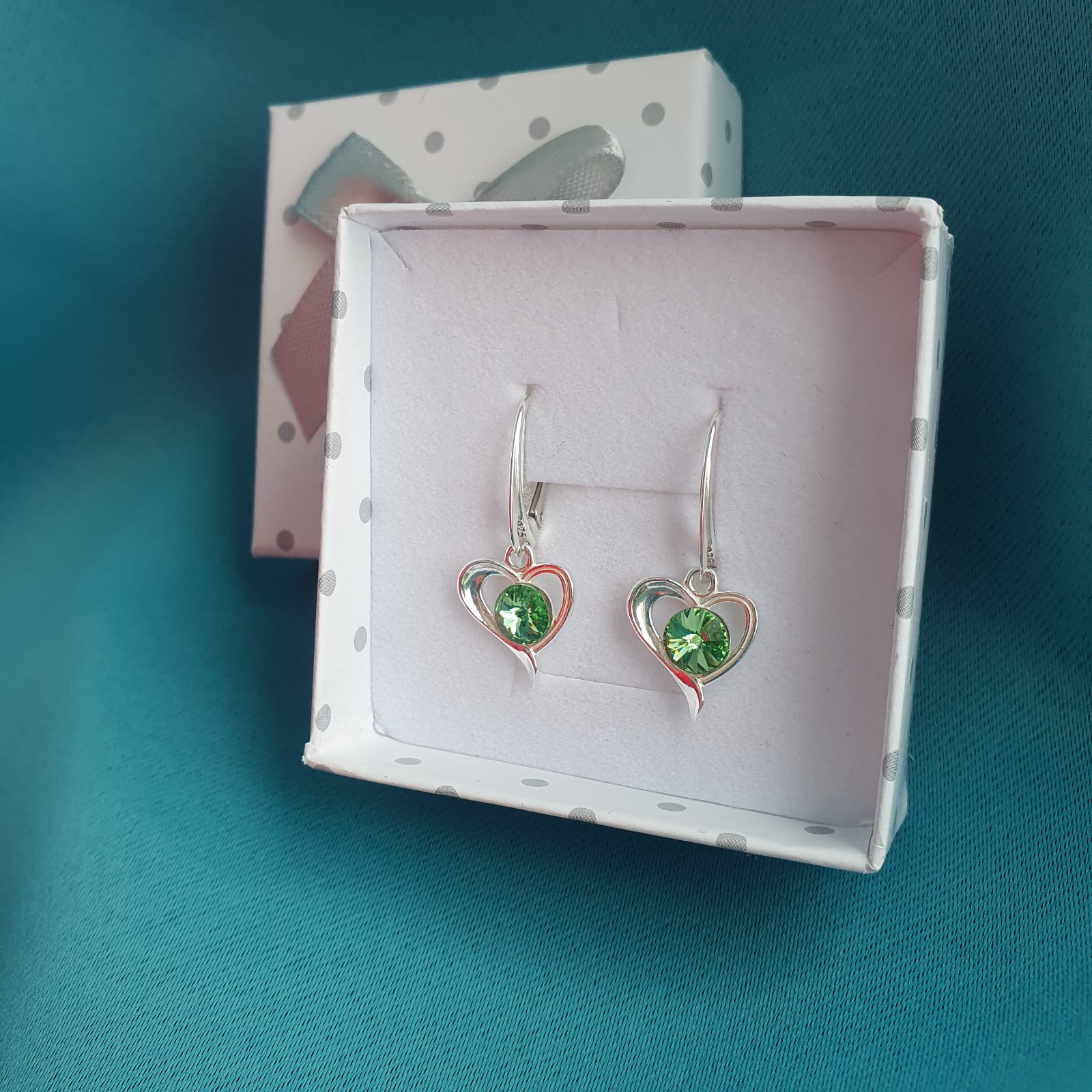Krásne náušničky Srdiečka zo zeleným kamienkom Rivoli 6mm
