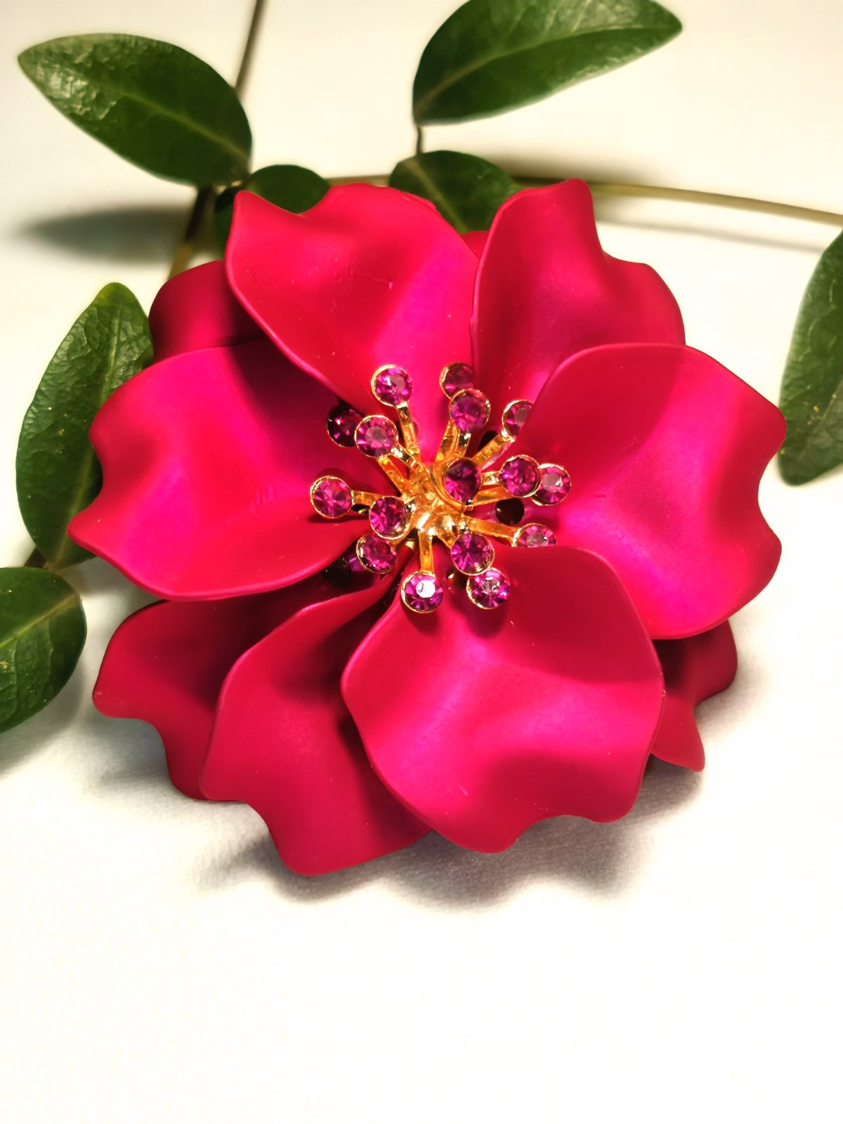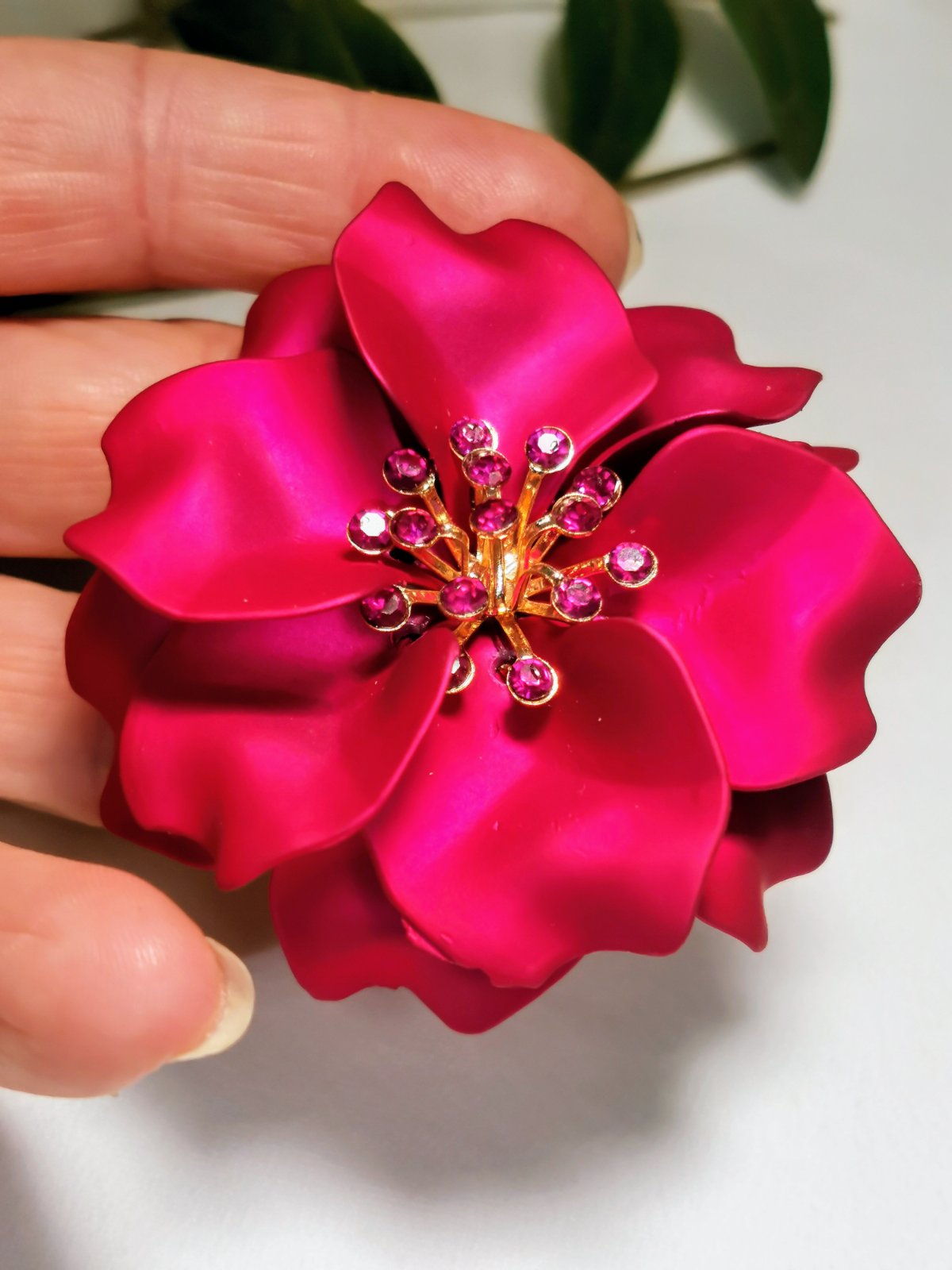 Ponúkam brošňu - Sapphire Blossom, ktora sa trblieta v metalickej ružovej aj tmavomodrej farbe a má tvar veľkého rozvitého kvetu. Stred kvetu je zdobený kryštálikmi v zlatom okvetí.