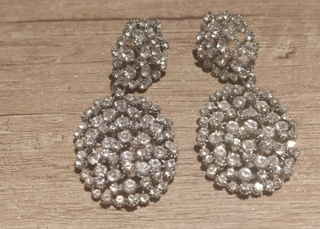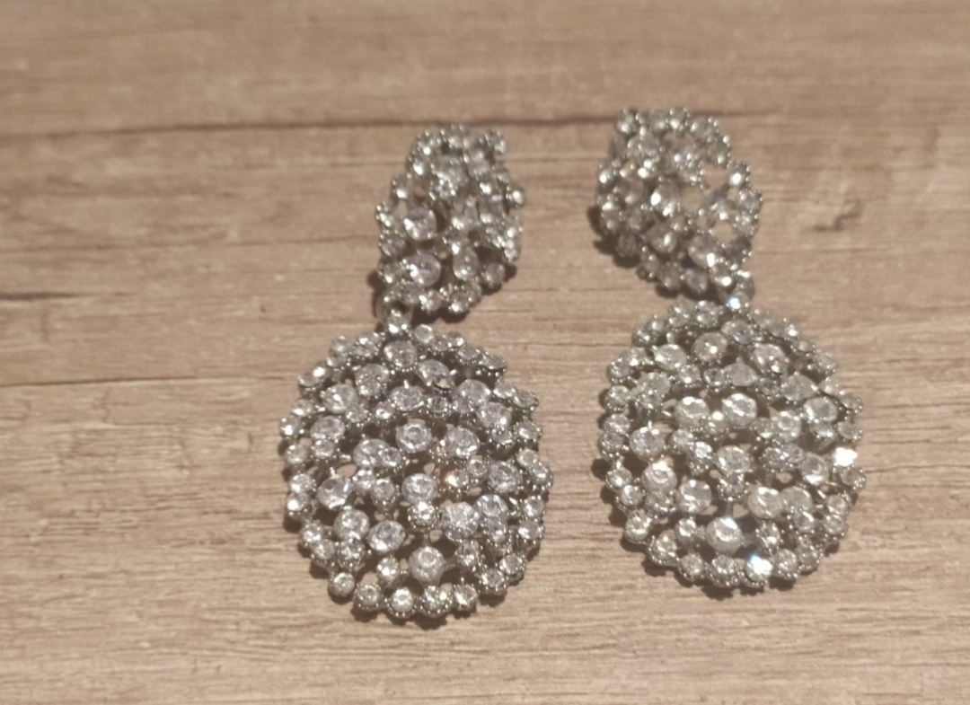 Dlhé visiace náušnice,použité 1x,dl 6.3cm.chyba jeden menší kamienok ,nie je to veľmi vidieť